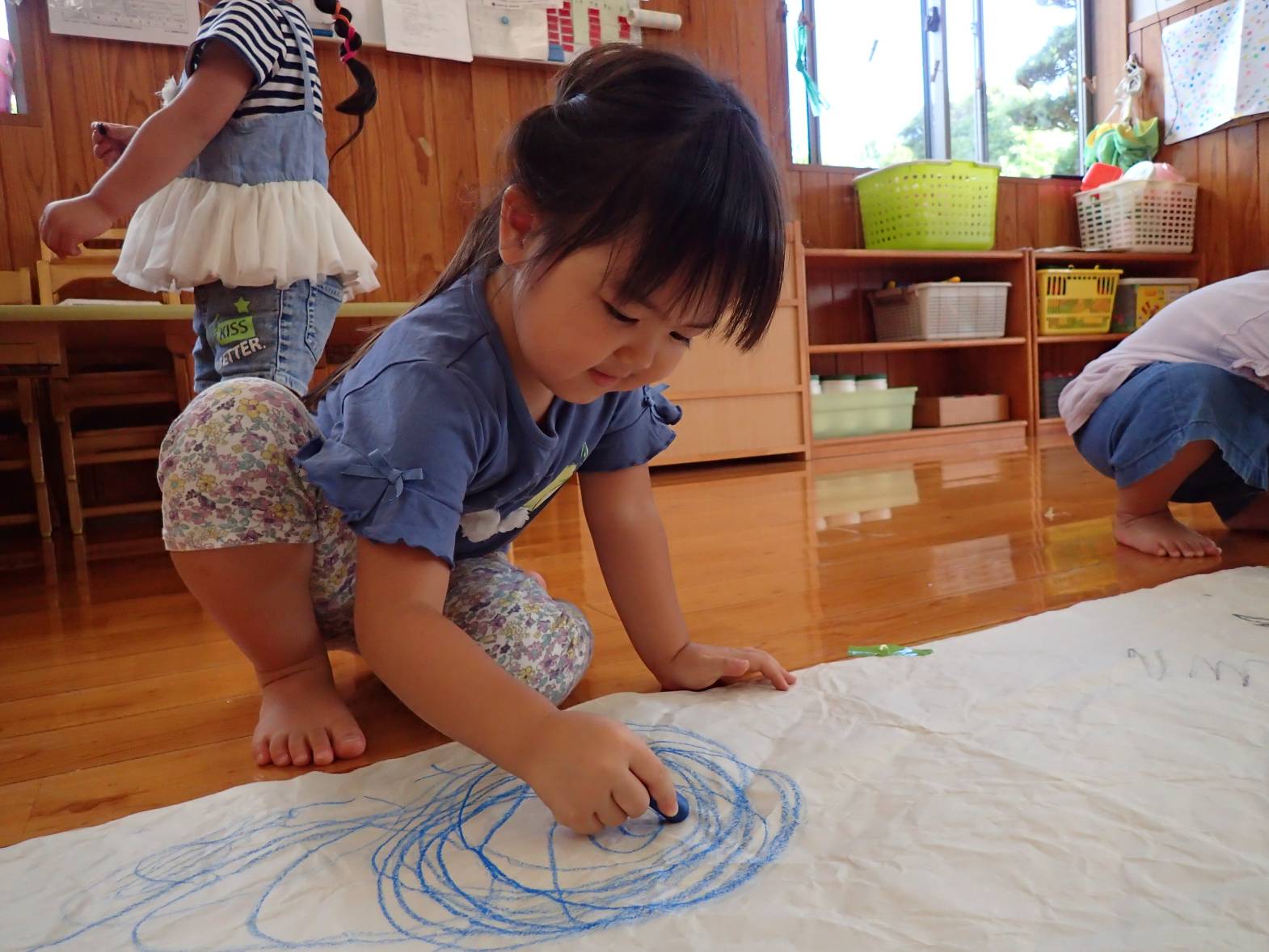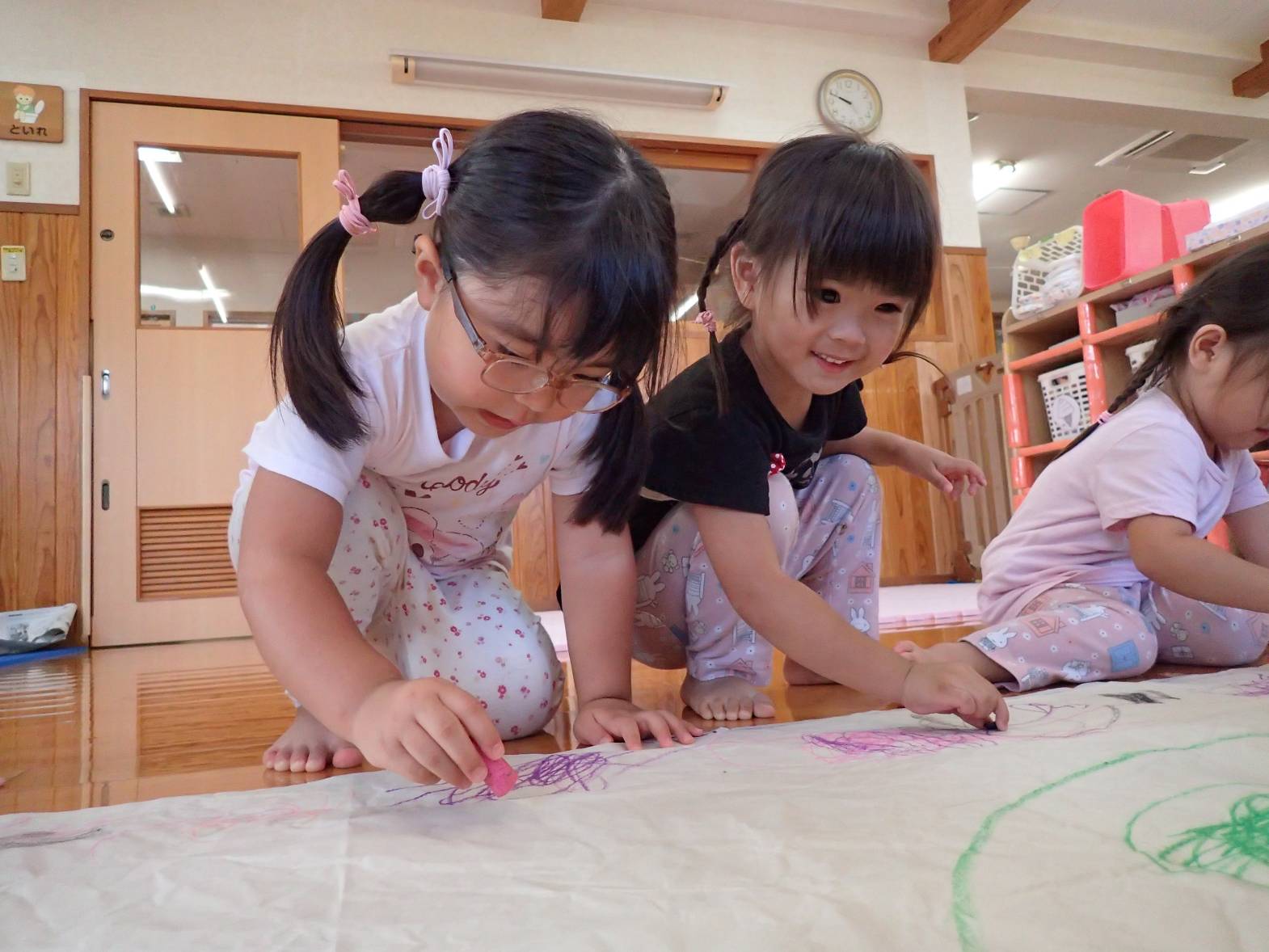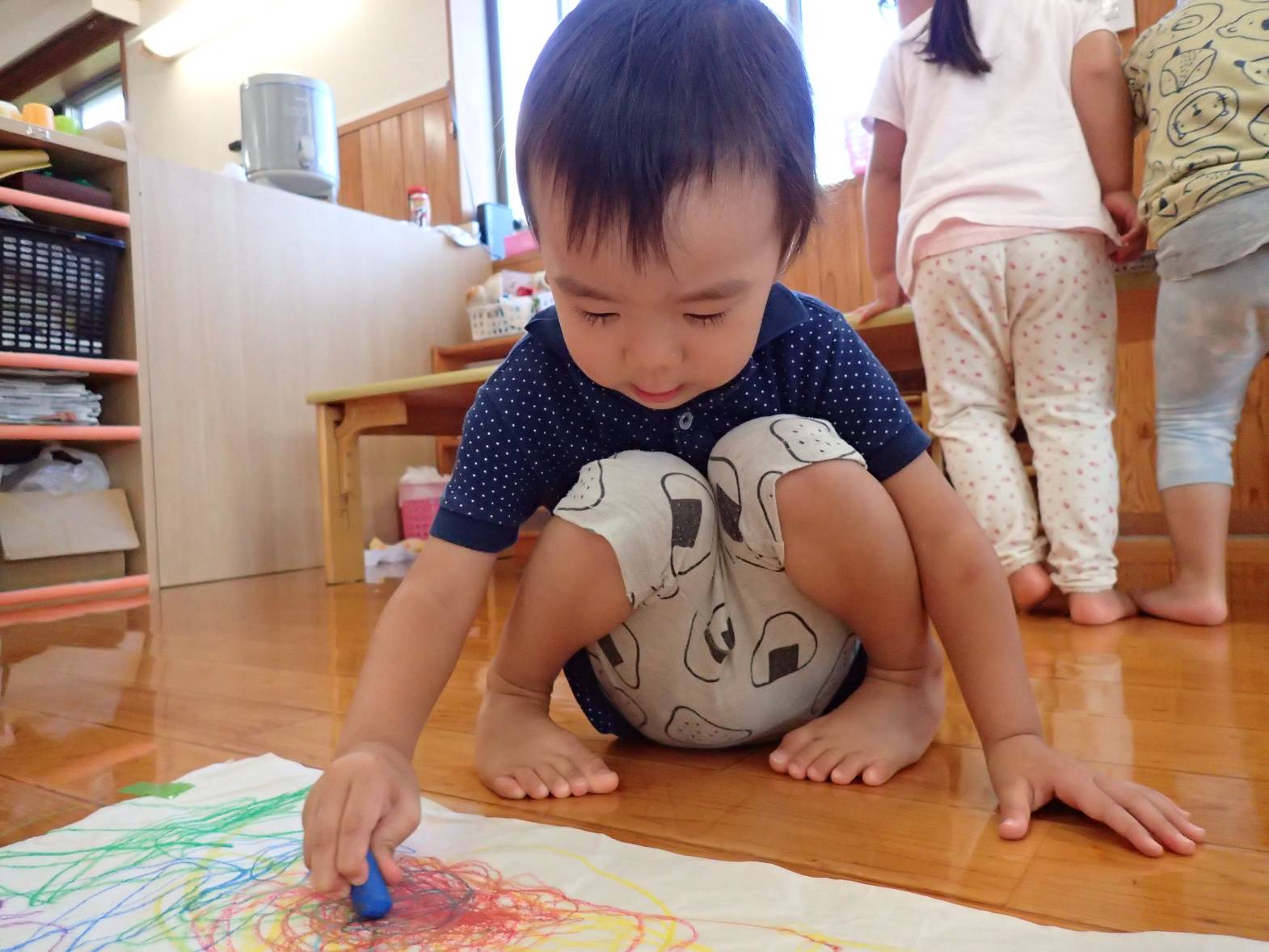 室内にて大きな紙を広げ、絵描きをしました。 クレヨンを握ると、「ぐるぐる~!」と紙いっぱいに描いていく子どもたち。 色を重ねていくことを楽しんだり、「見て!アンパンマン描いた!」とキャラクターを描いてみたりと思い思いにクレヨンを走らせる姿が見られます。 「これは何色?」、「これは赤だよ!」と色にも興味を持つぱんだ組さんでした。