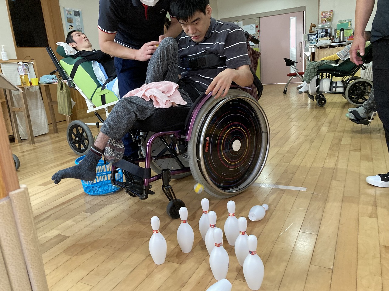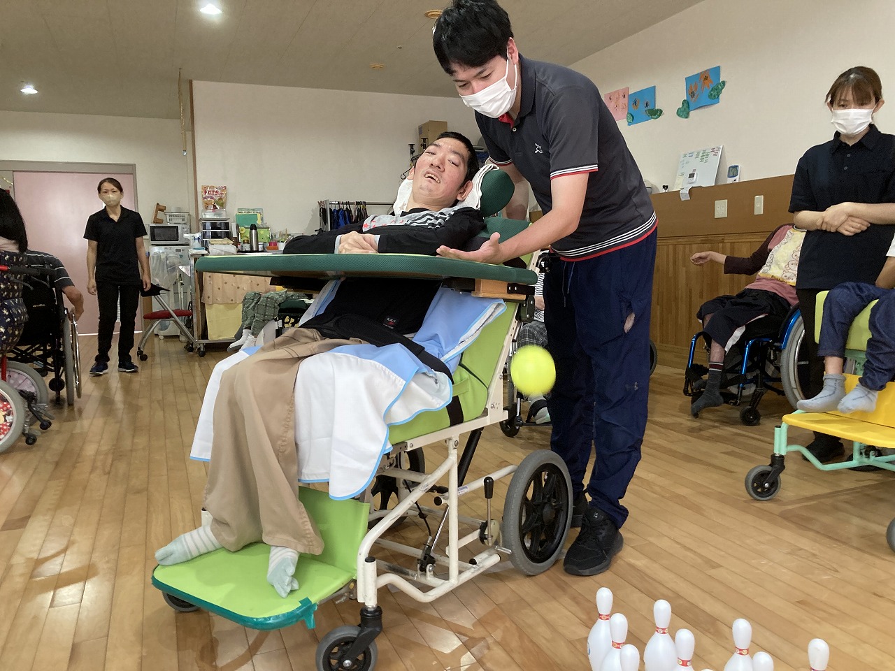 今回の種目はボウリング、新聞綱引き、玉入れ、風船落とし、何匹ゲットできるかな?の5つで、紅白に分かれて行いました。