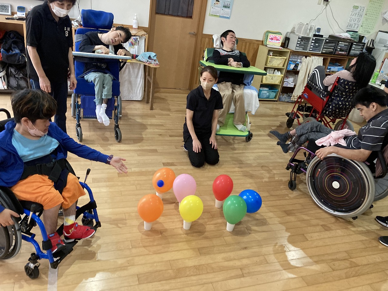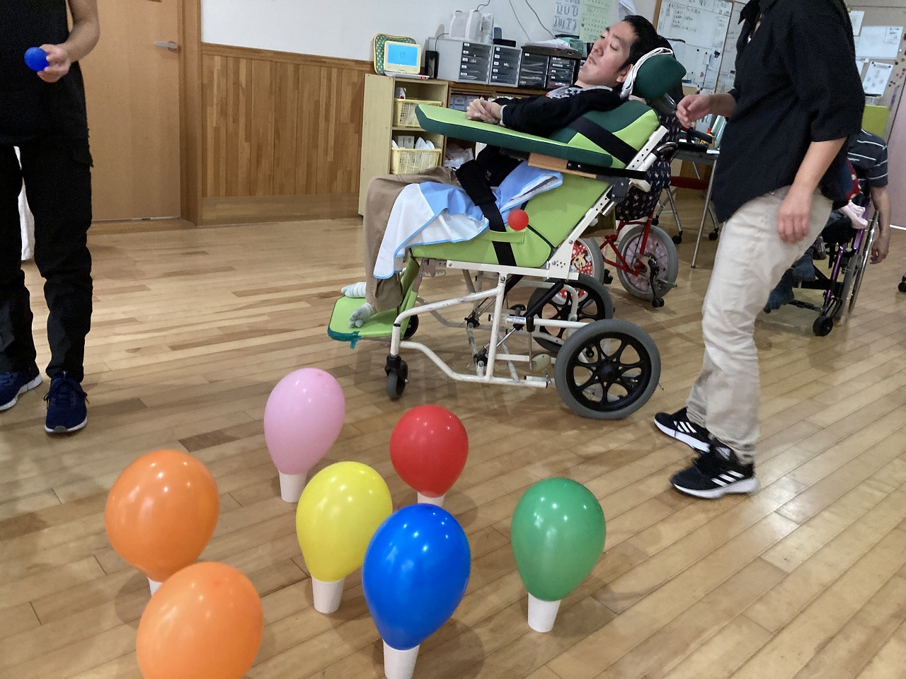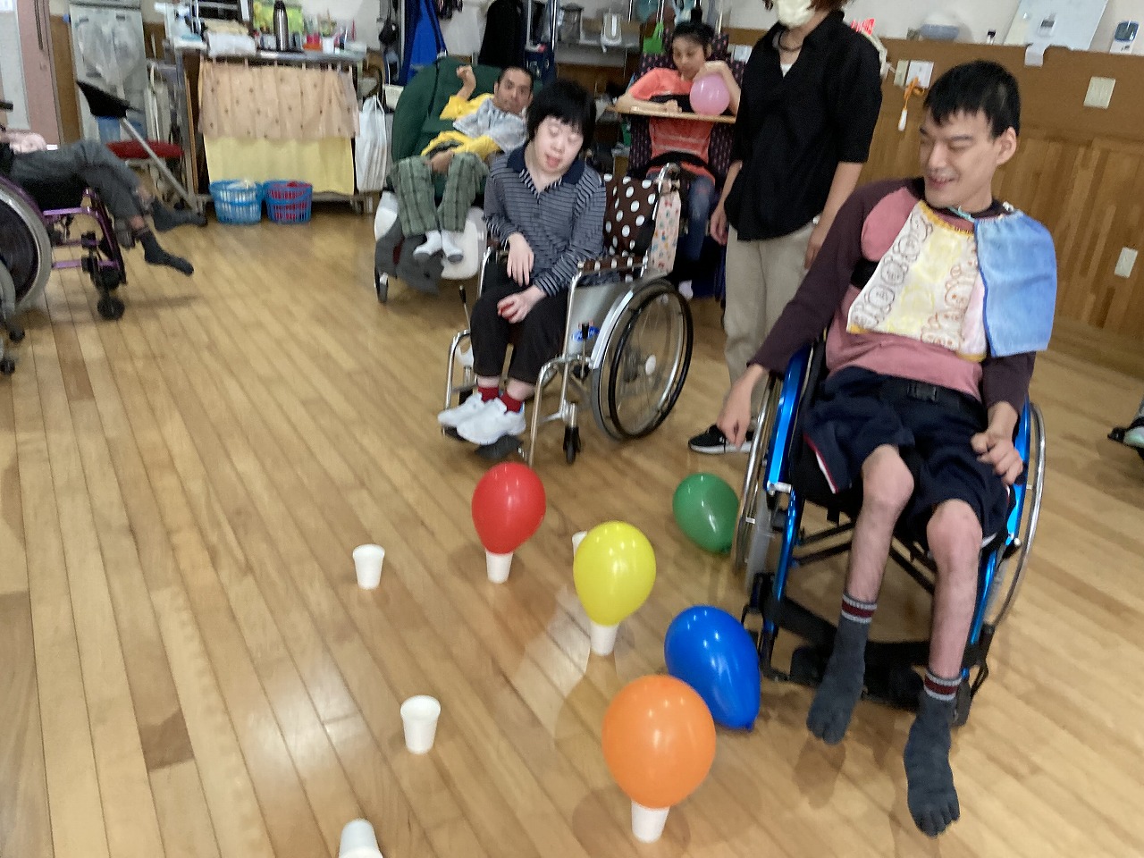 風船落としはカップに乗せられた風船をボールを投げて落とす競技でした。