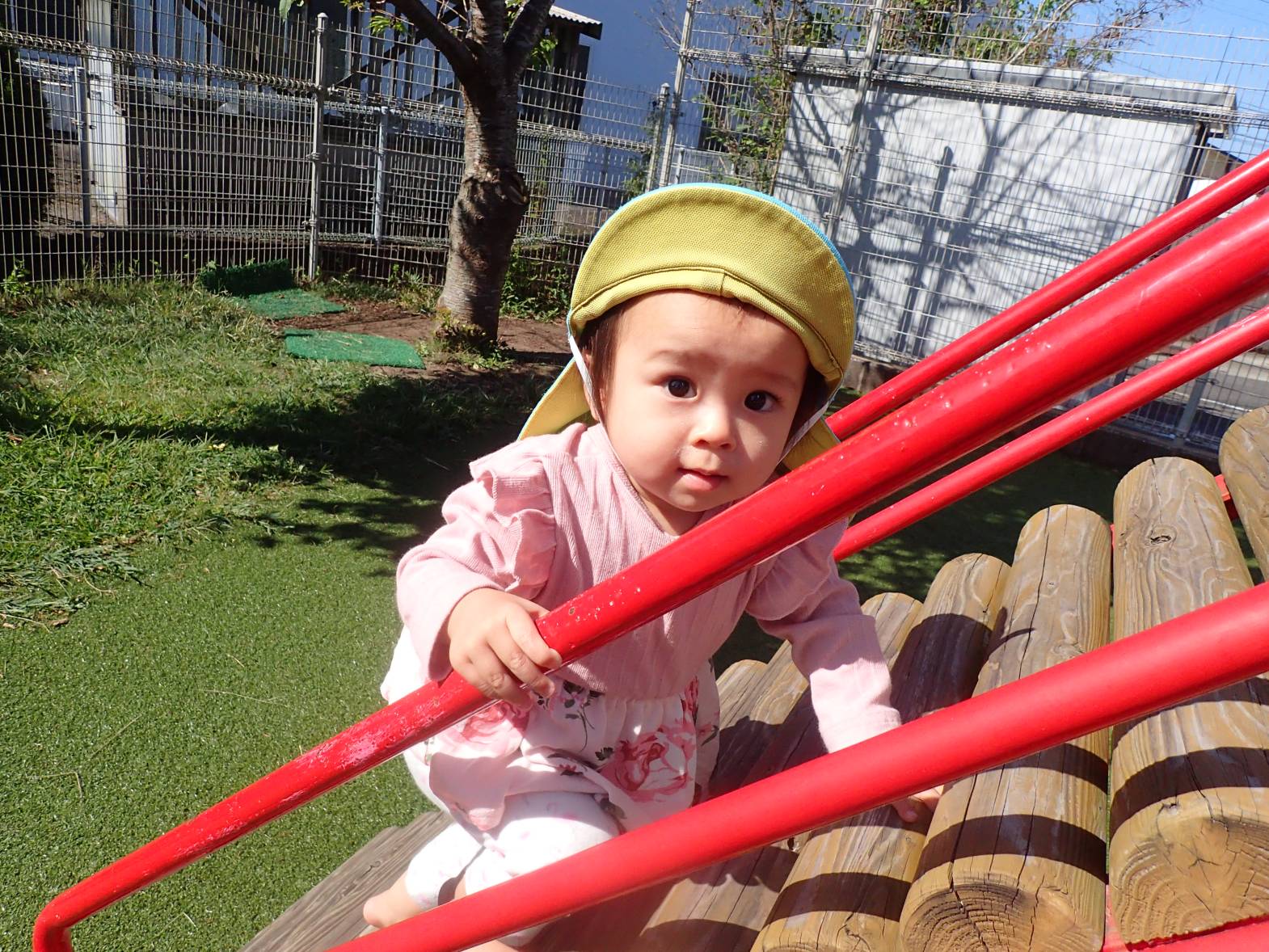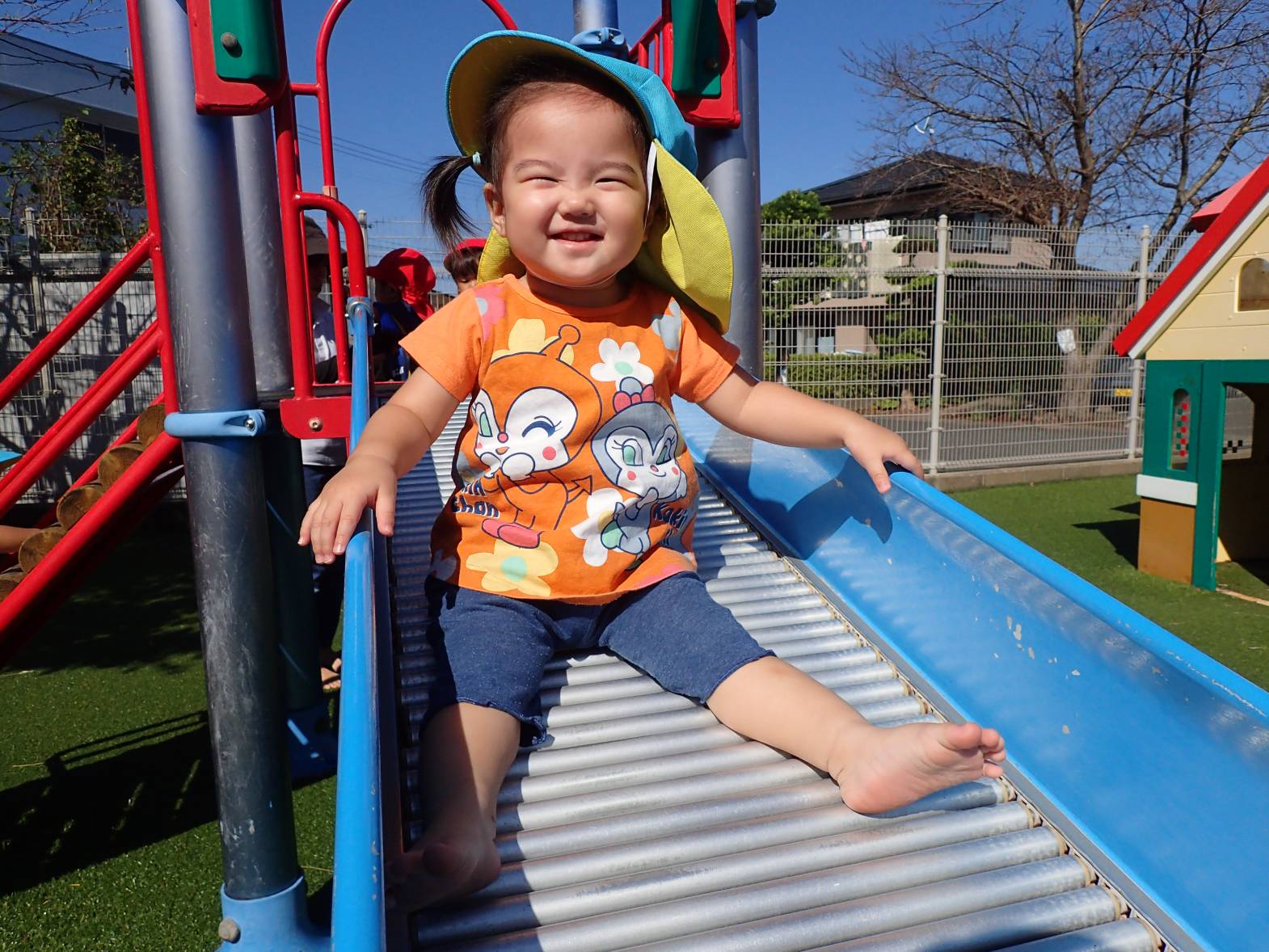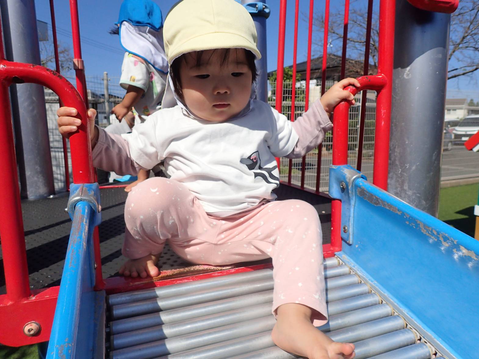 戸外では、滑り台遊びが大好きな子どもたち。 階段だけでなく丸太の坂の方から登ろうとする姿が増えました。 手足を上手に使って登る姿が見られます! 滑る時には、足を出し座って滑る姿勢になることを伝える中で、少しずつ覚えてきている子どもたち。 風を浴びて、気持ちよさそうなひよこ組さんでした!