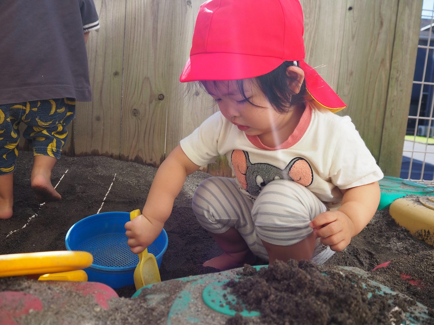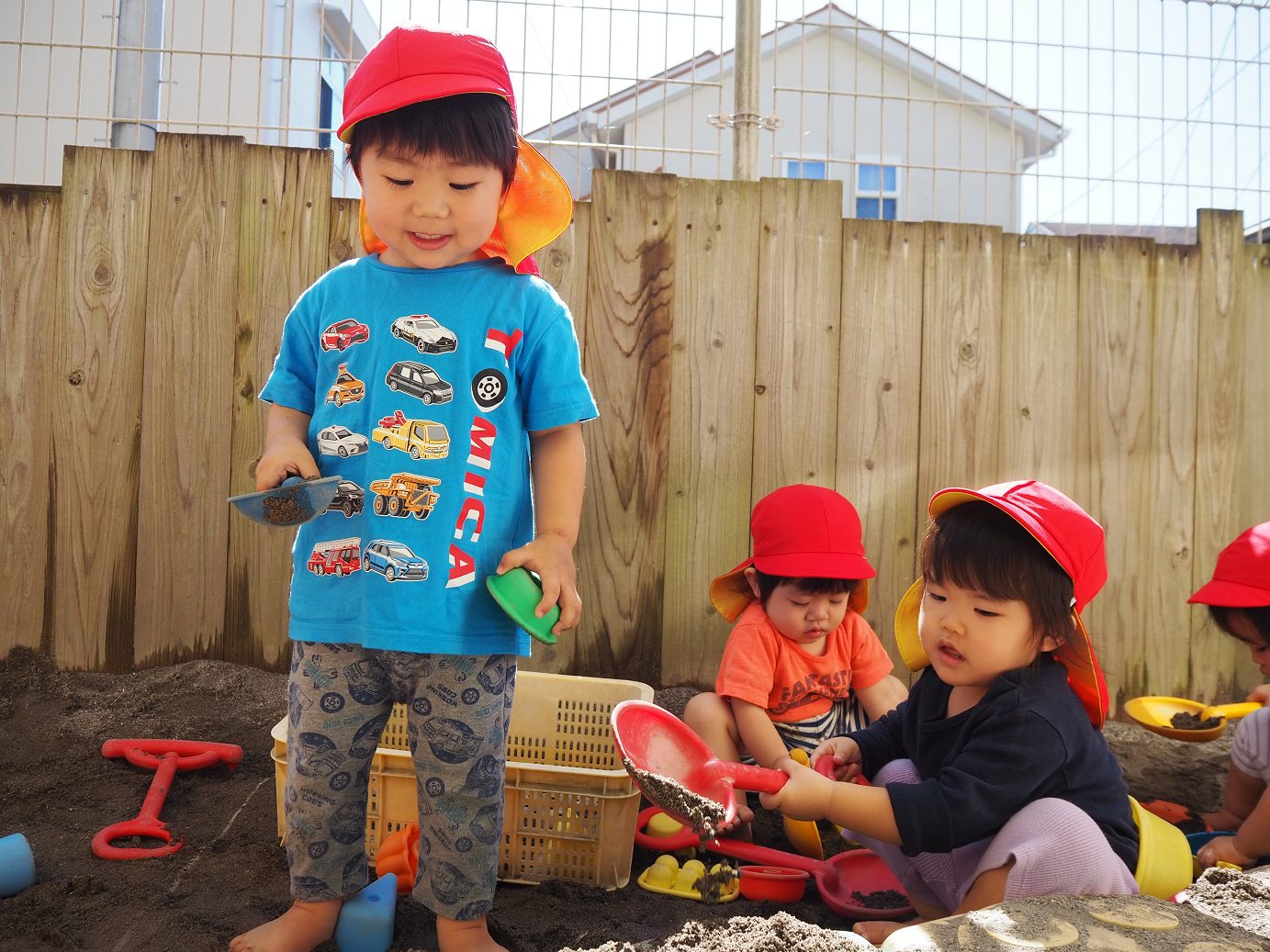 今日は初めて砂場に行ったこあら組さん。 約束事をしっかり確認し出発! 「わぁ~!」「砂だよ、先生!」と大興奮の子どもたち。 スコップで砂を掬ったり、お家の中から「おかえり~。」とおままごとをしたりと、思い思いに遊ぶ姿が見られました。 「楽しかったね!」「また行く?」と大満足で砂場を後にしたこあら組さんでした。 お話も上手になってきている子どもたち。 是非今日あったことを尋ねてみてくださいね。