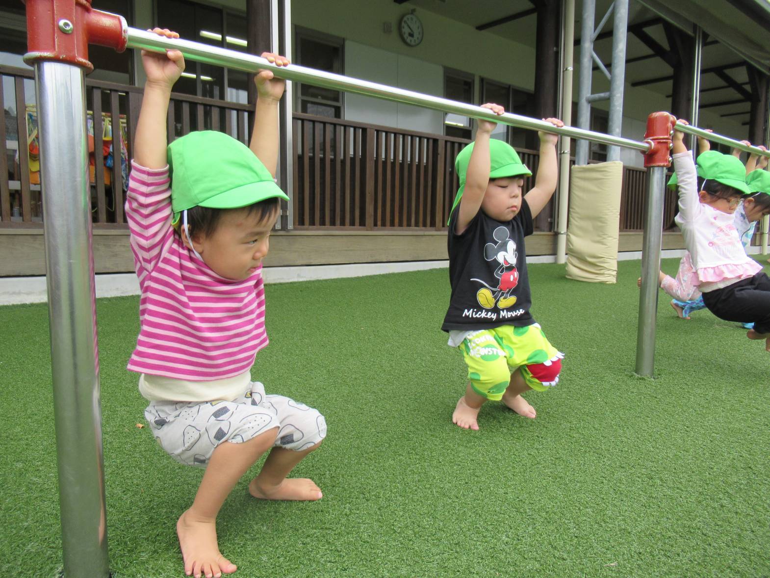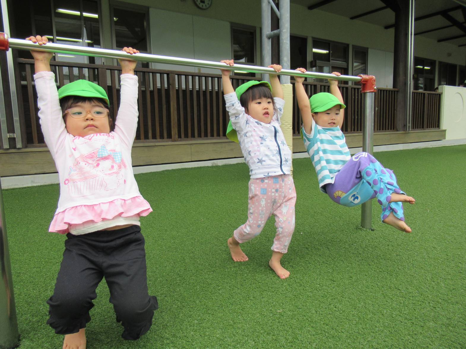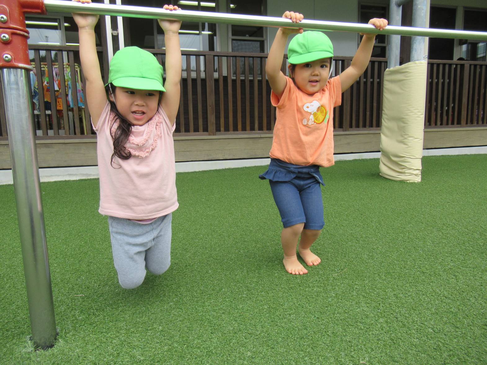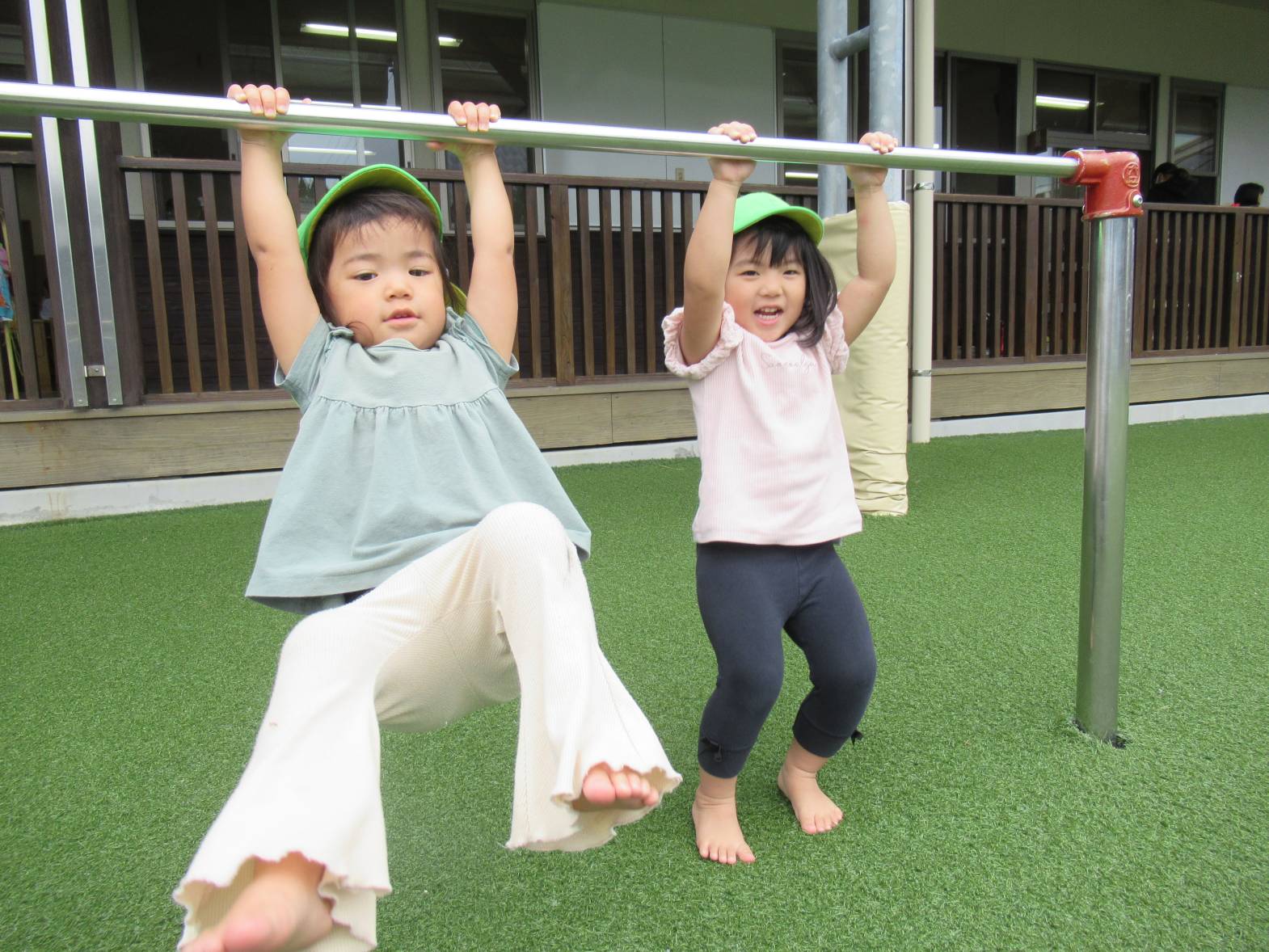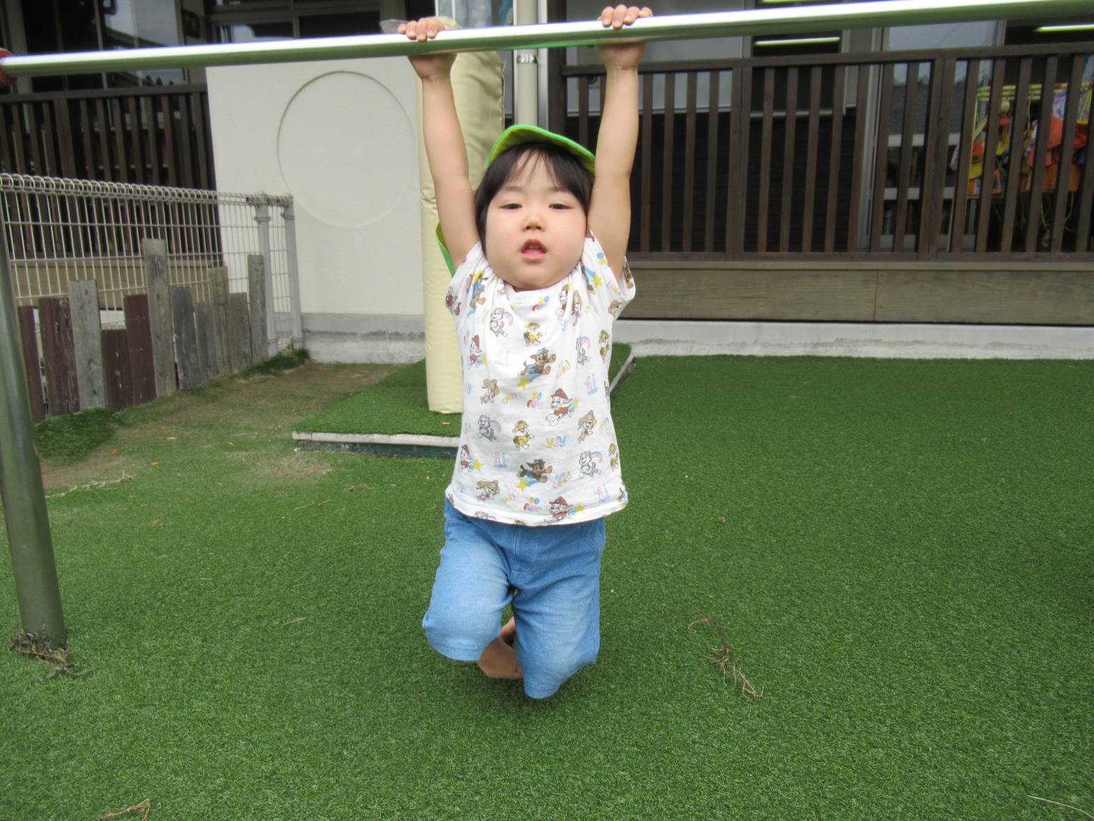 今日は、園庭に行き、鉄棒で遊びました。 鉄棒にぶら下がると、「見て!できた!」と嬉しそうな子どもたち。 「おさるさんになったよ!」とお猿さんになりきる姿が見られました! 握力や腕力を少しずつ鍛えていけたらと思います。