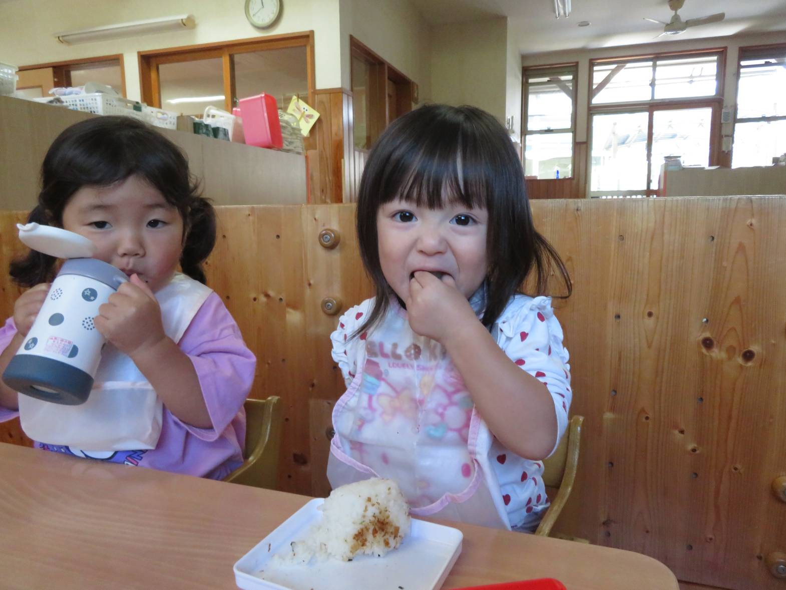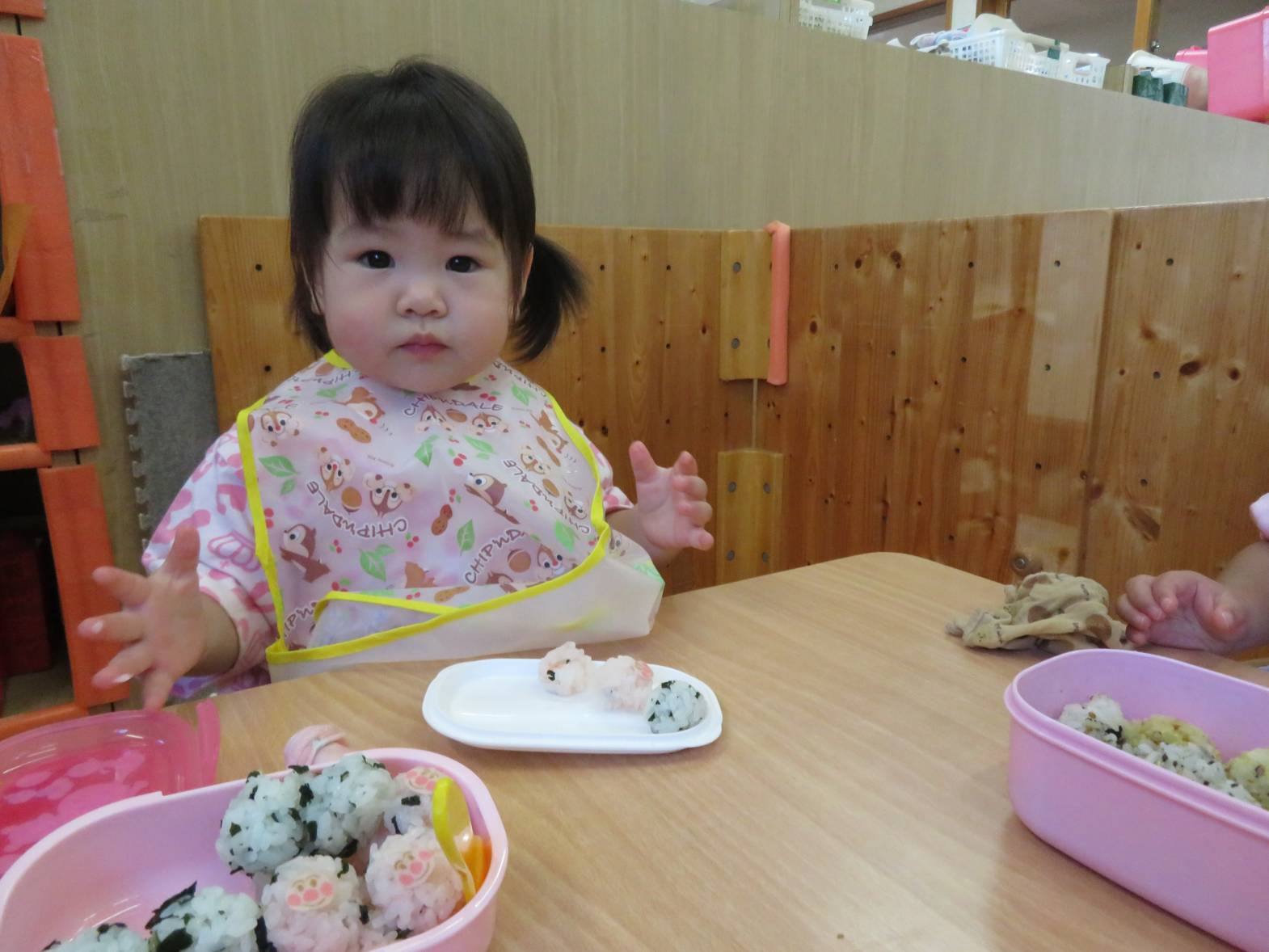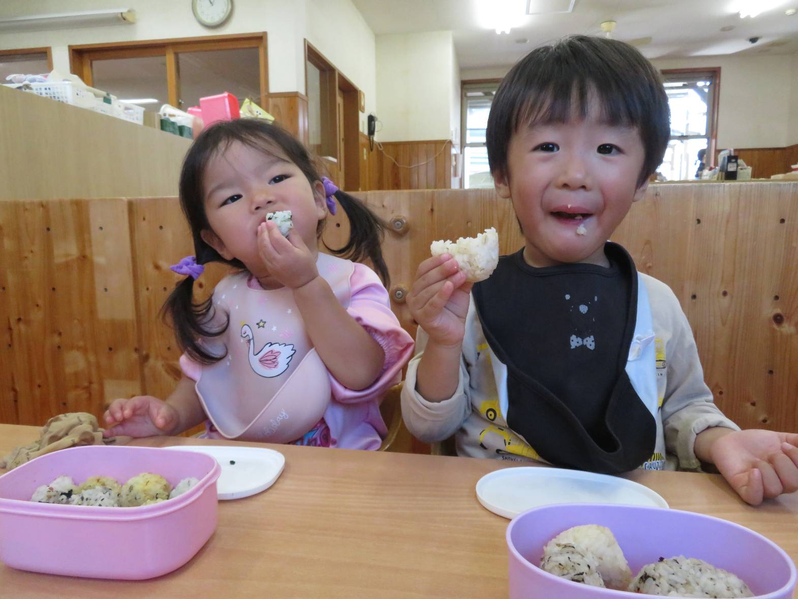 今日はおむすびの日でした。 おむすびが大好きなこあら組さん! 「おむすびの時間だよ~!」と言うと、「は~い!」と元気よく返事する姿が見られました。 頂きますをすると、意欲的に食べ進め、「おいしー!」と教えてくれたり、笑顔になったりする子どもたち。 おむすびを食べ終わると、とても満足そうなこあら組さんでした。 おむすびのご準備ありがとうございました。