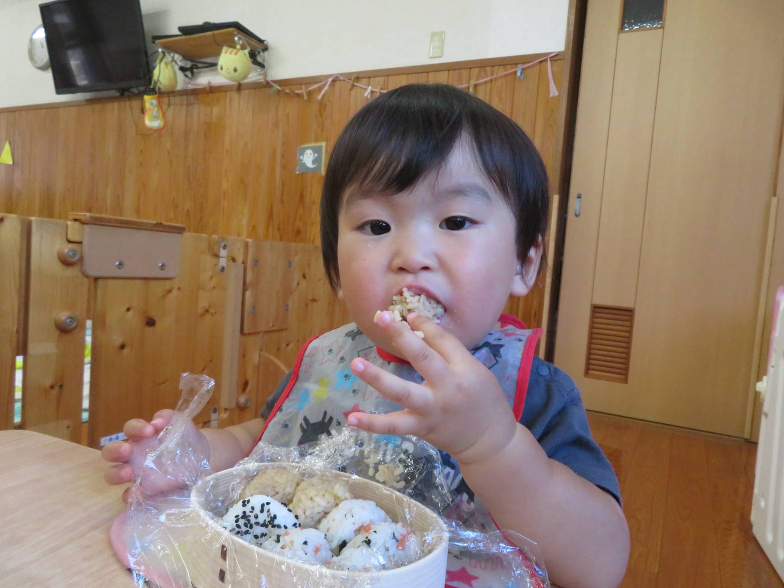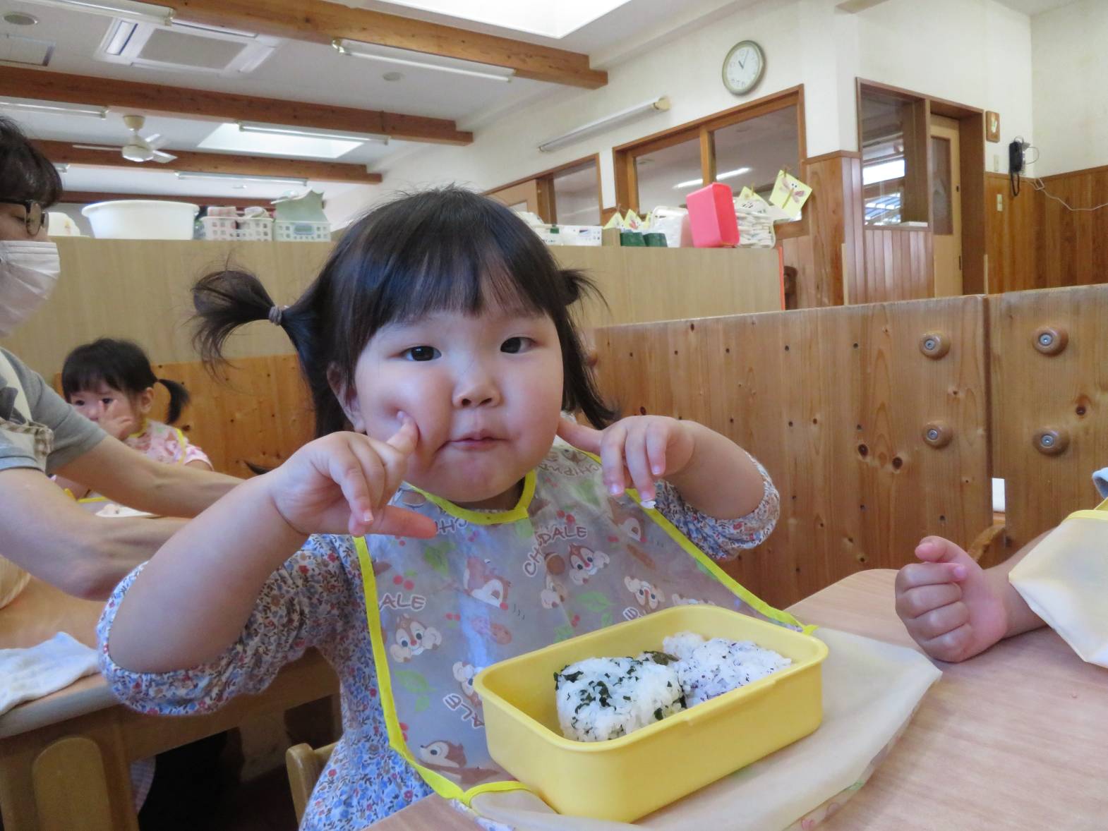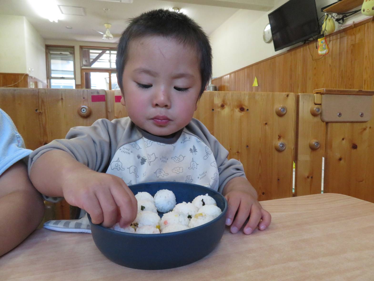 今日はおむすびの日でした。 おむすびが大好きなこあら組さん! 「おむすびの時間だよ~!」と言うと、「は~い!」と元気よく返事する姿が見られました。 頂きますをすると、意欲的に食べ進め、「おいしー!」と教えてくれたり、笑顔になったりする子どもたち。 おむすびを食べ終わると、とても満足そうなこあら組さんでした。 おむすびのご準備ありがとうございました。
