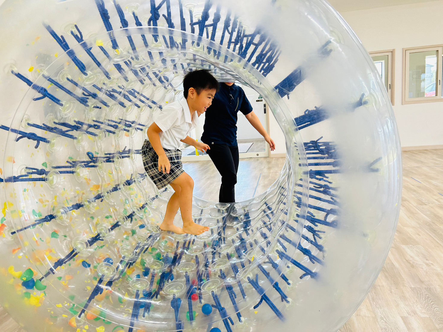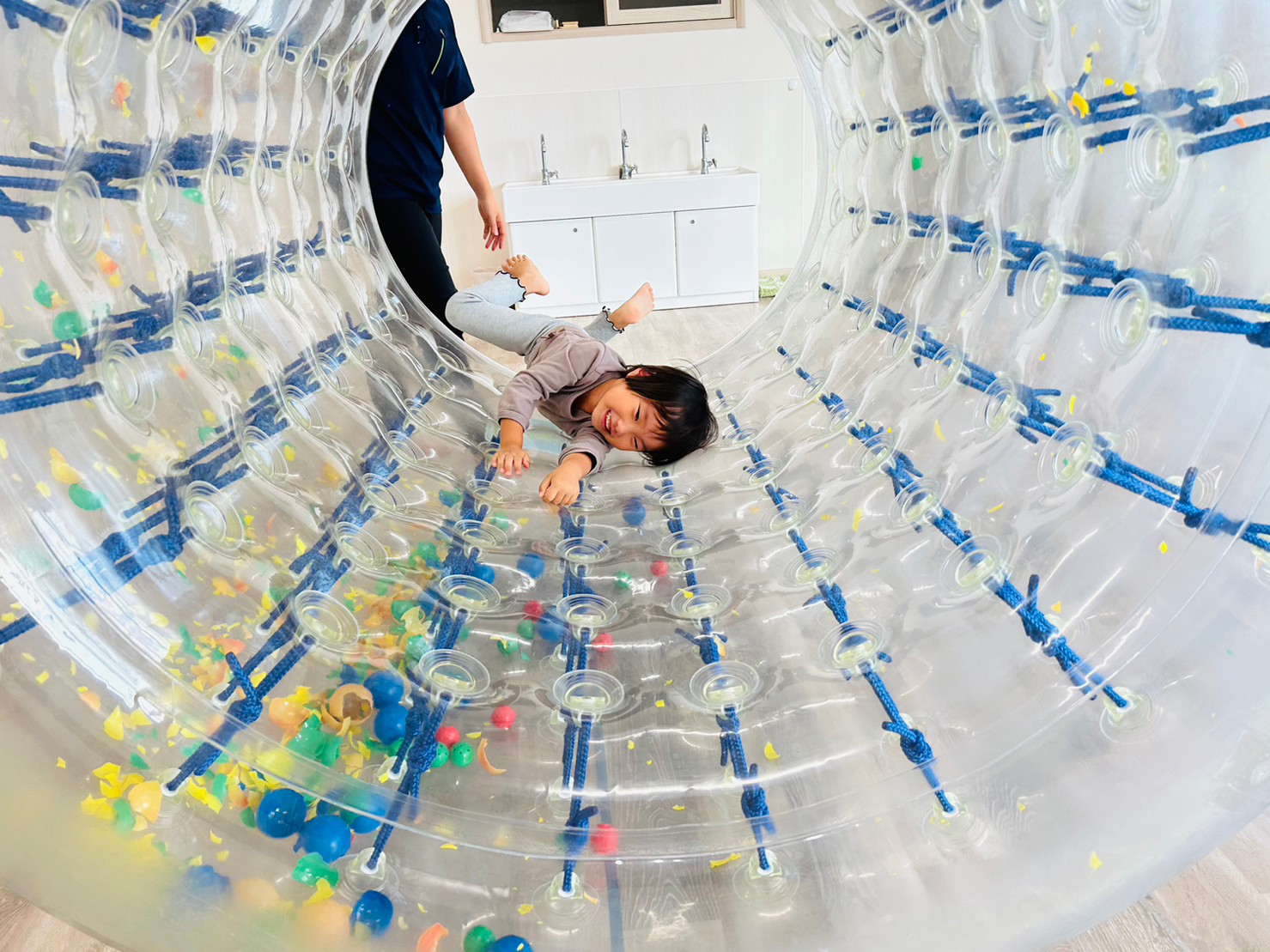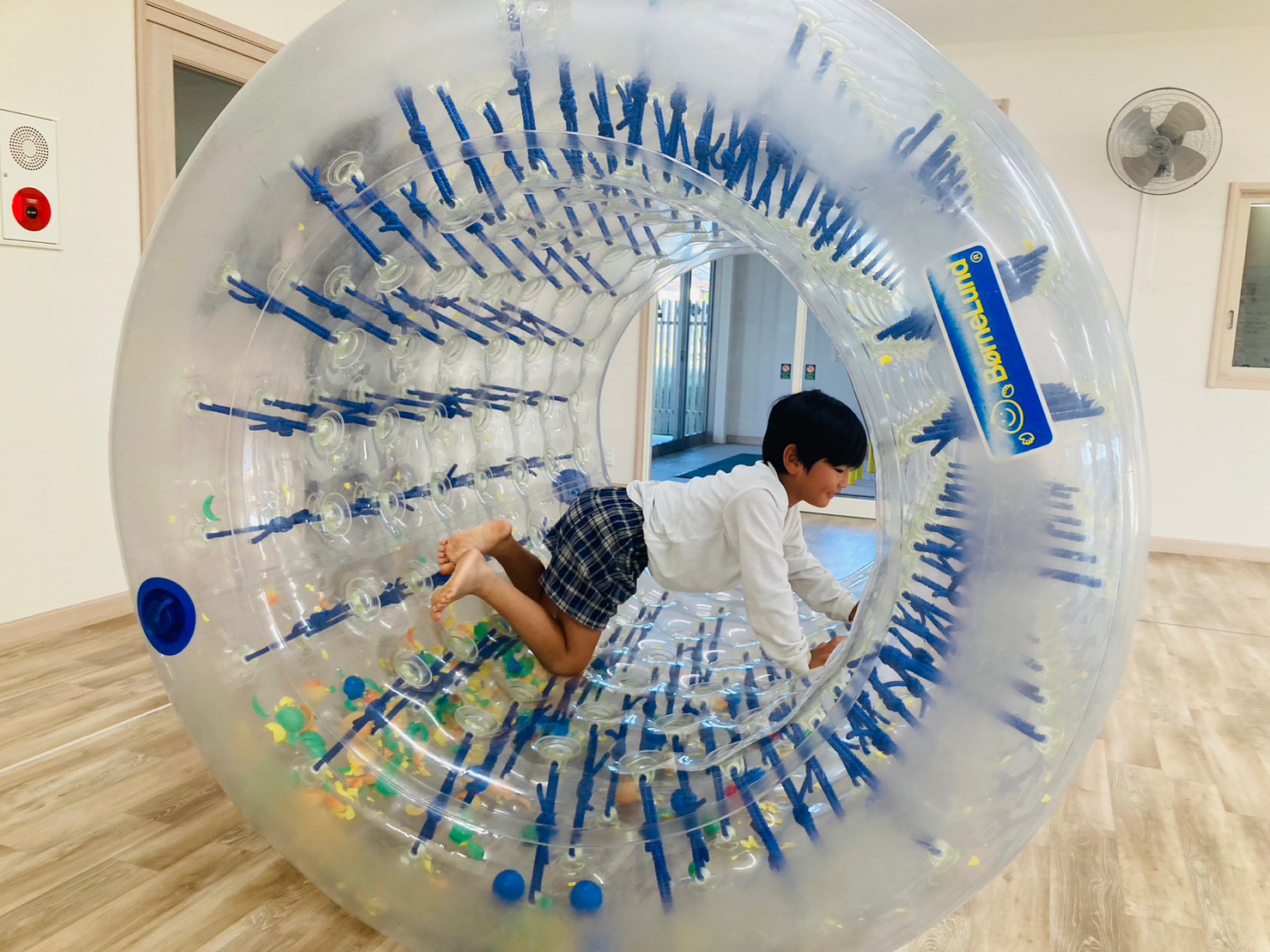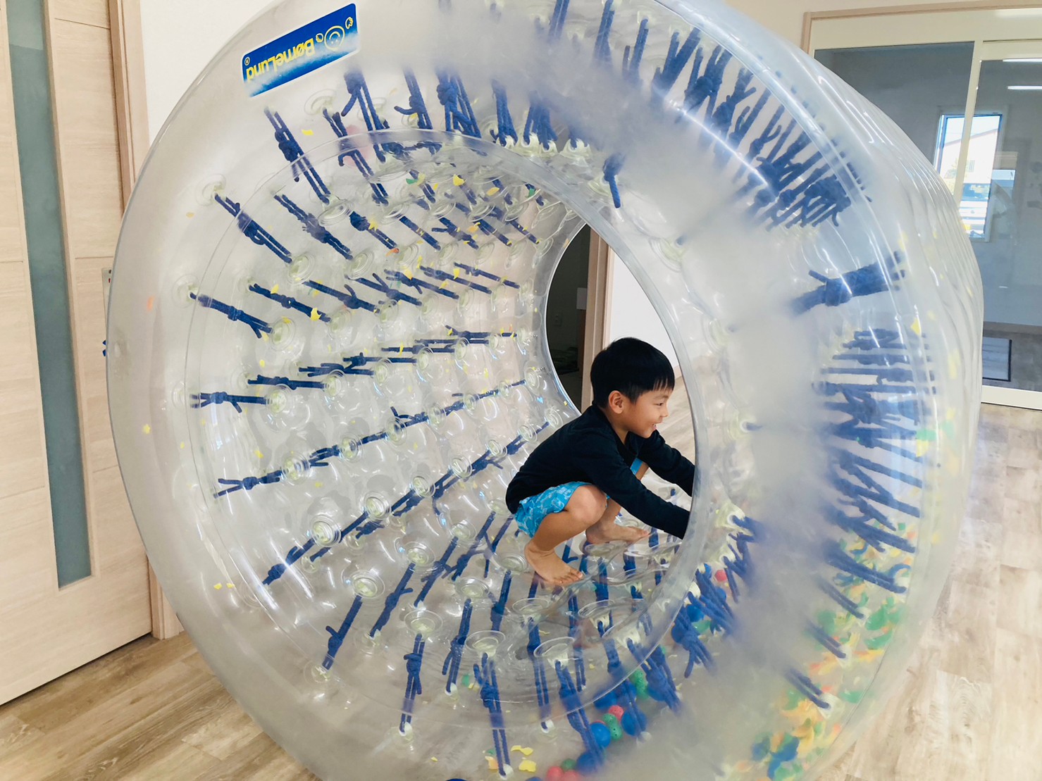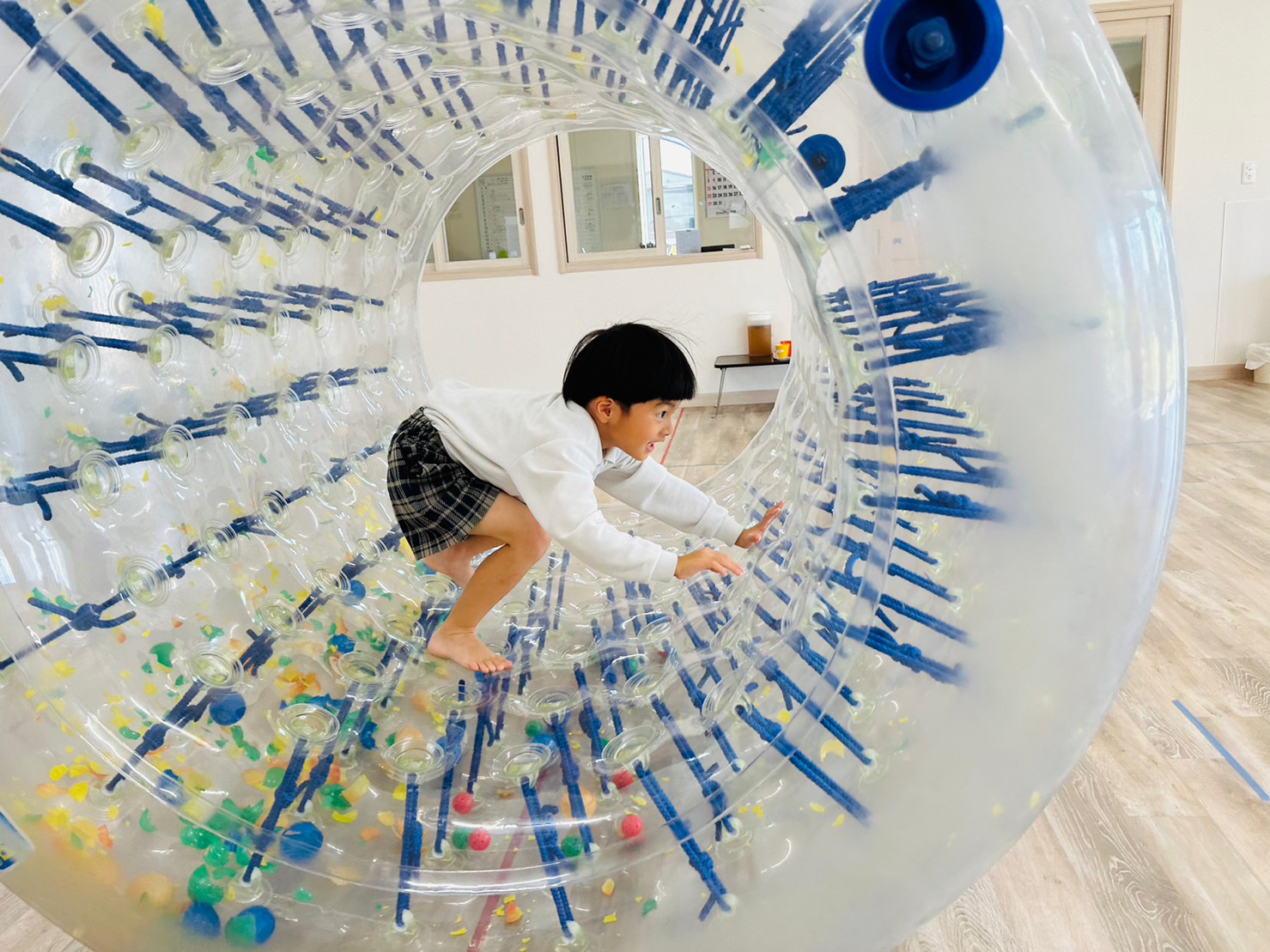 サイバーホイールを行いました ♪ ホイールの中に横になり、ゴロゴロと左右の揺れを楽しんだり、高這いや歩いてホイーるを回転させたりして遊びました! また、揺れや動きに慣れてくると、回転に合わせて前転をして楽しむ子どもの姿も見られました ♪