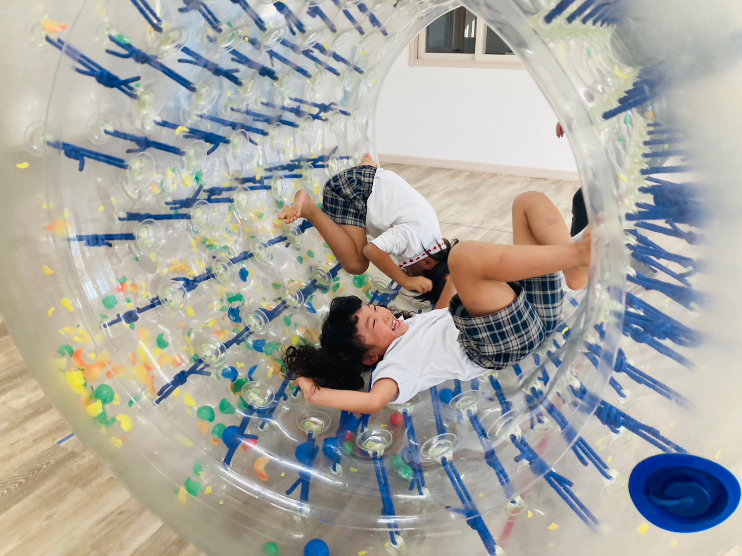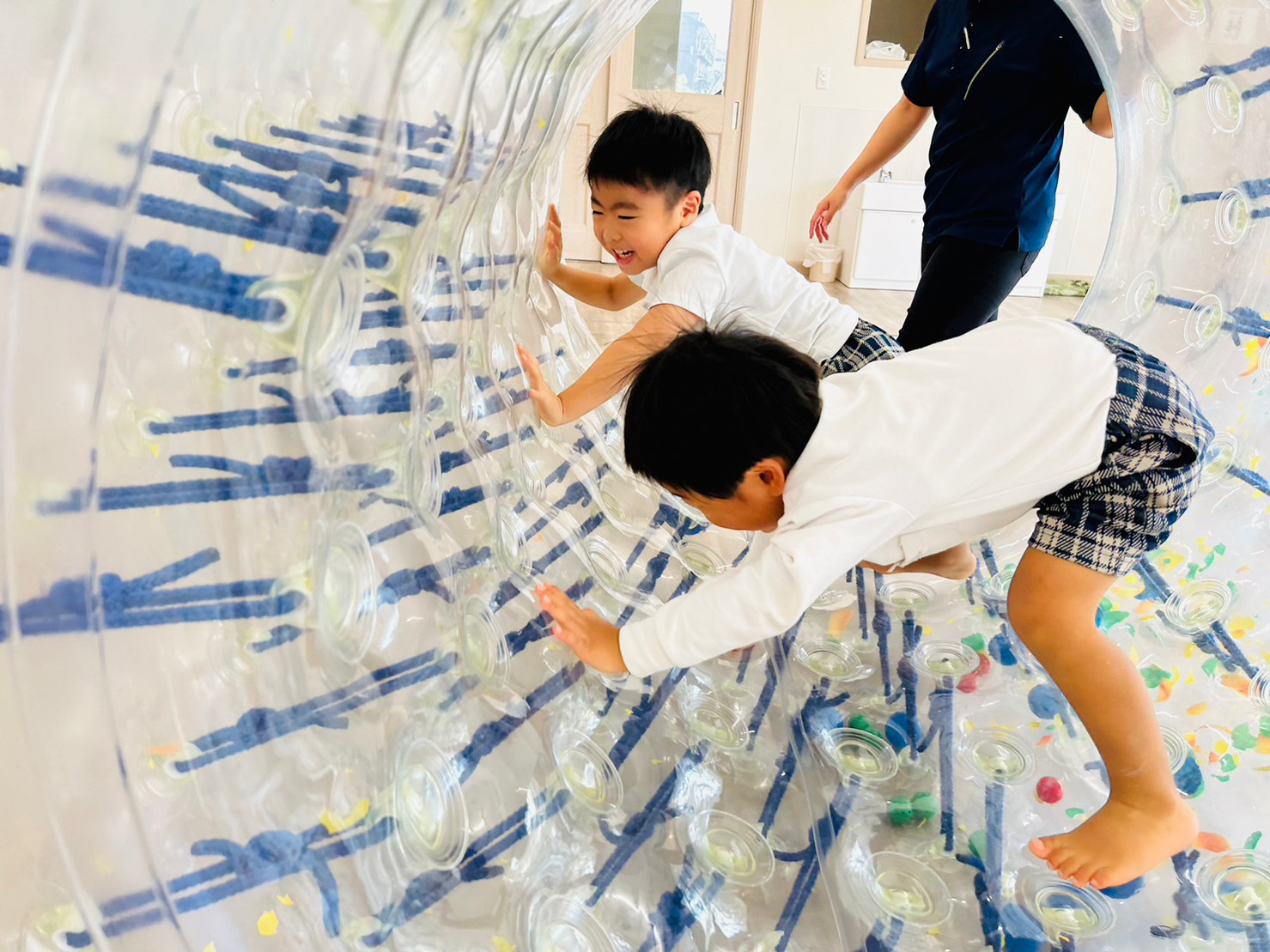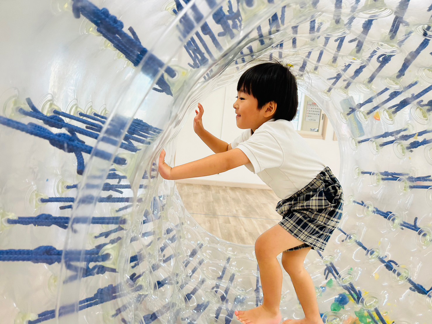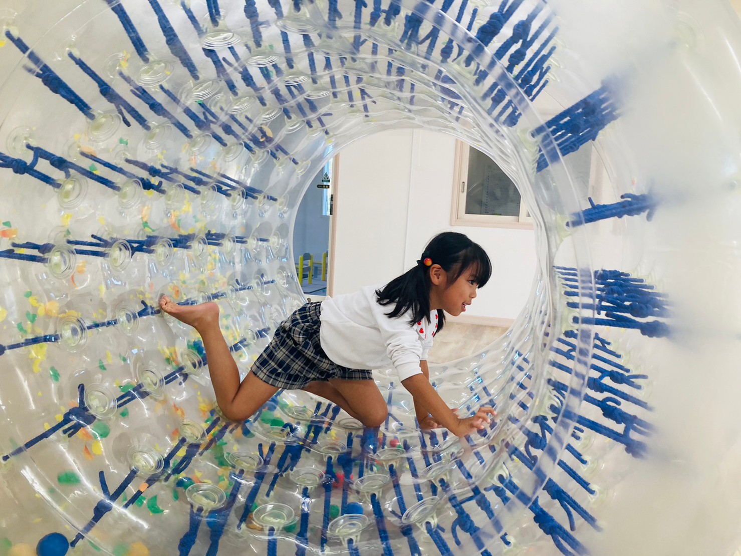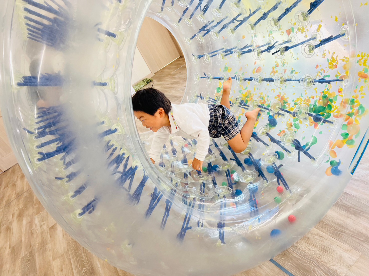 サイバーホイールを行いました ♪ ホイールの中に横になり、ゴロゴロと左右の揺れを楽しんだり、高這いや歩いてホイーるを回転させたりして遊びました! また、揺れや動きに慣れてくると、回転に合わせて前転をして楽しむ子どもの姿も見られました ♪