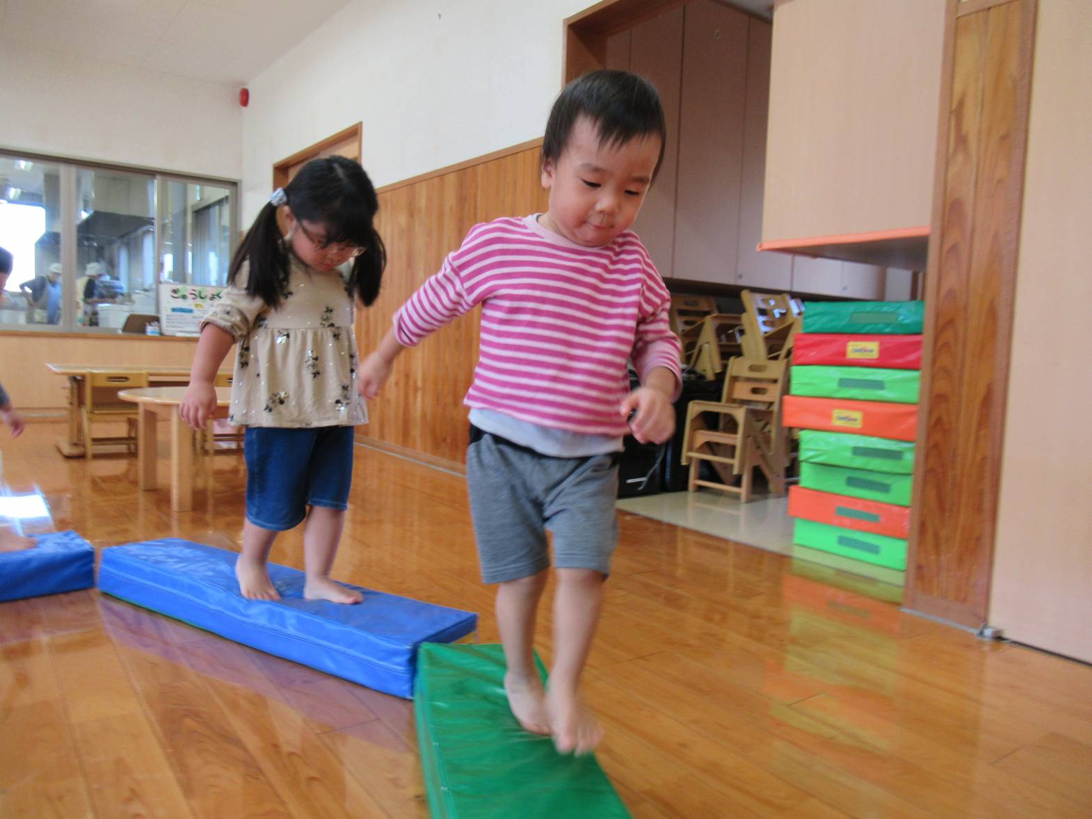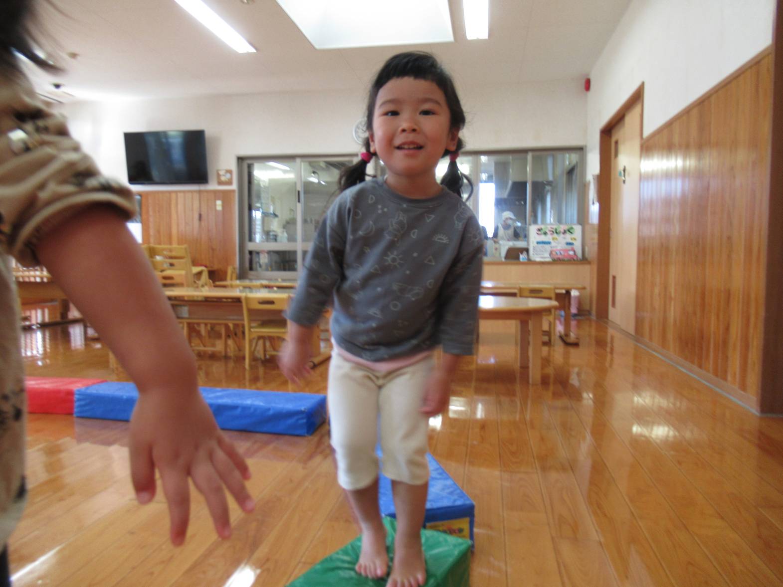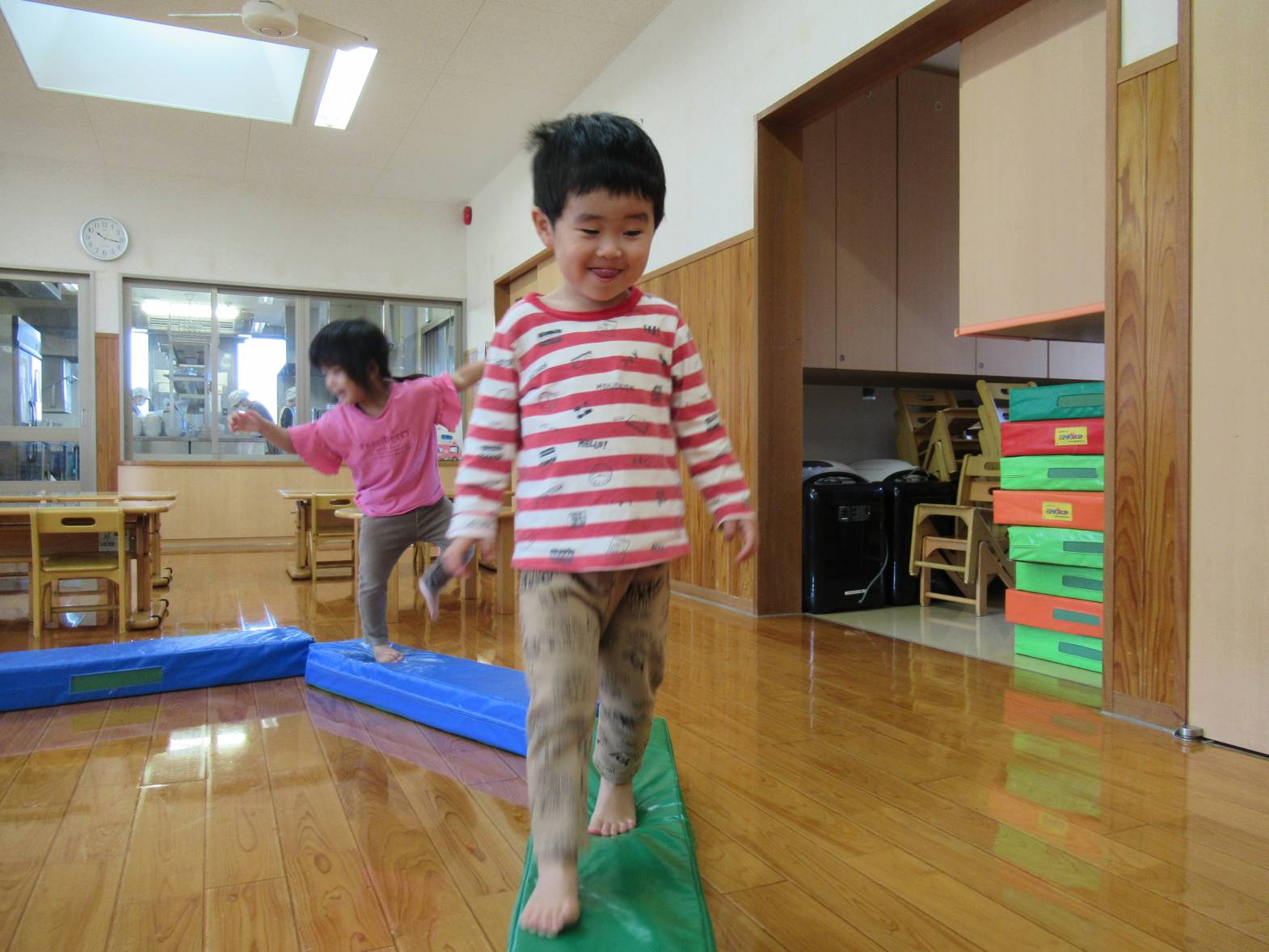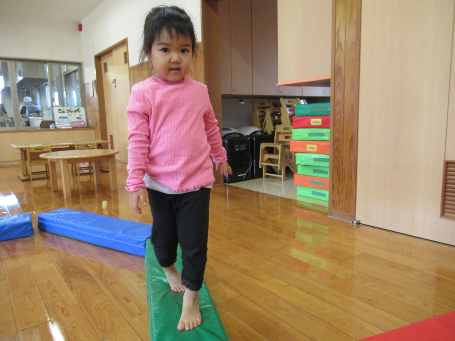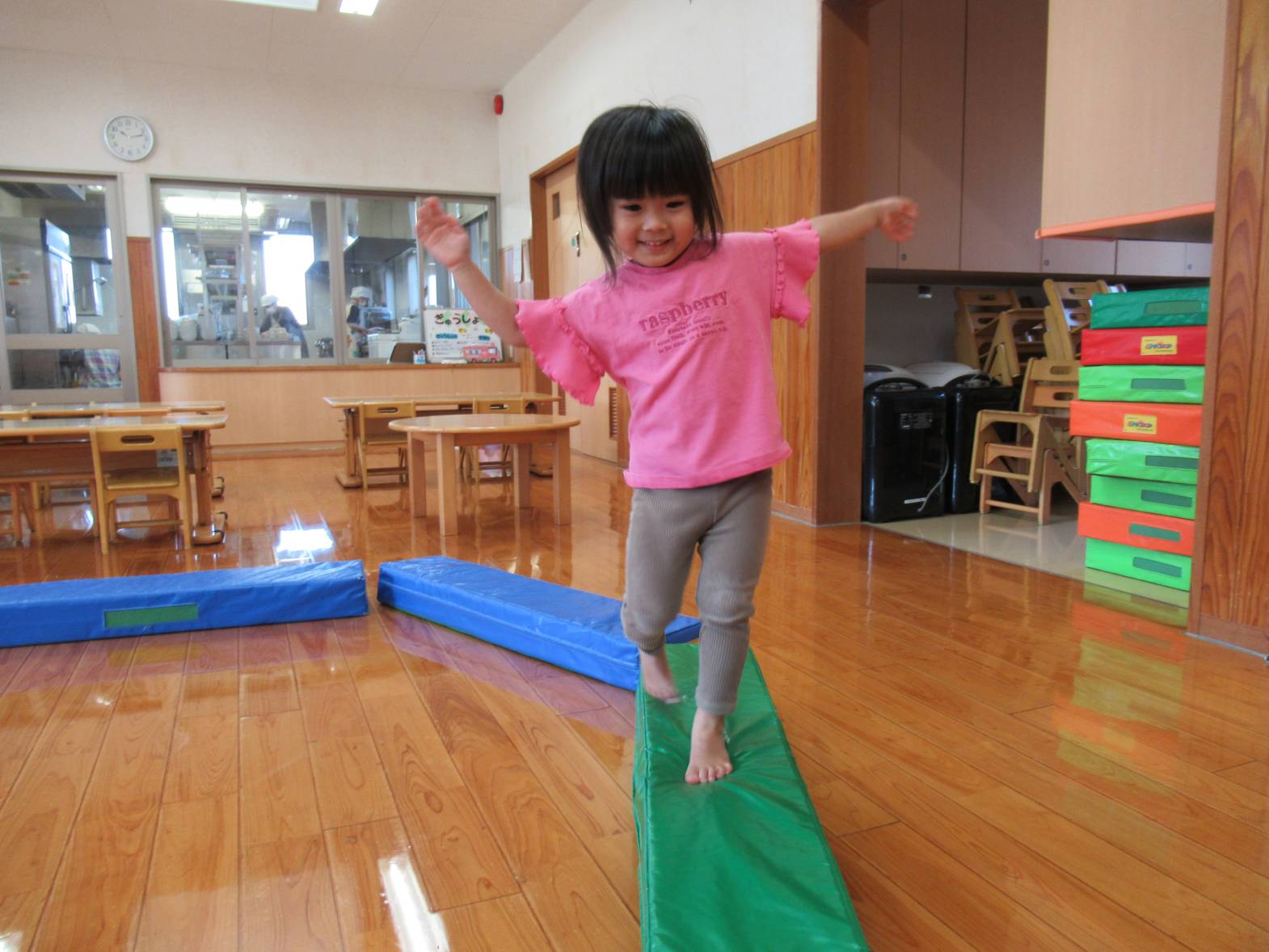 先日、プレイルームでマットなどの活動を行いました。 その中でも子どもたちに大人気だったのがバランス遊び! 細いマットを繋げてると、平均台のようにして落ちないように進む子どもたち。 「見て!できたよ!」と両手を広げてバランスをとる姿も見られました。 室内活動でもたくさん体を動かして遊んでいるぱんだ組さんです!