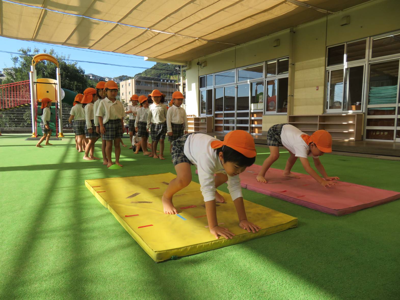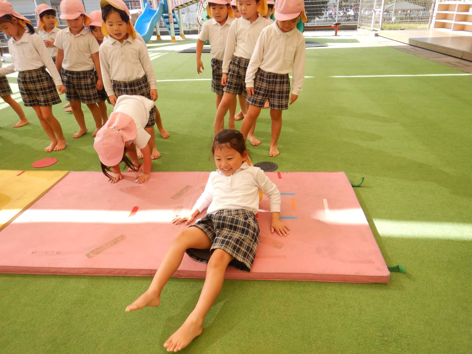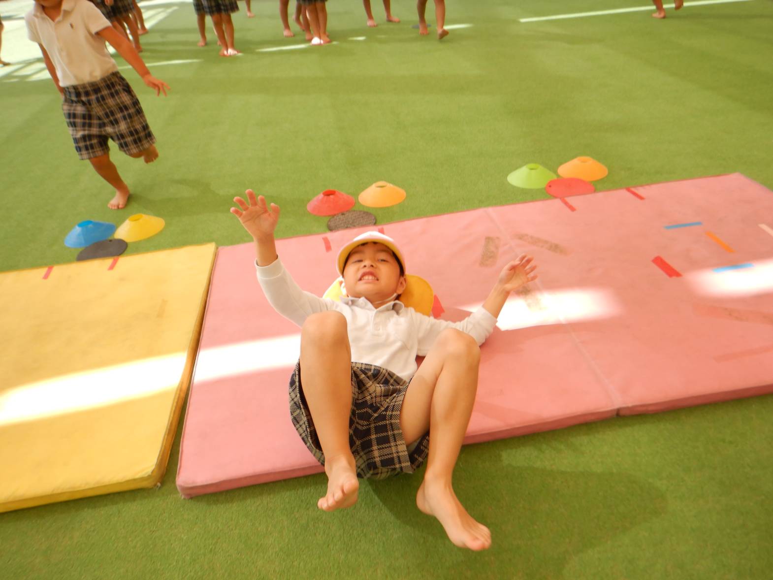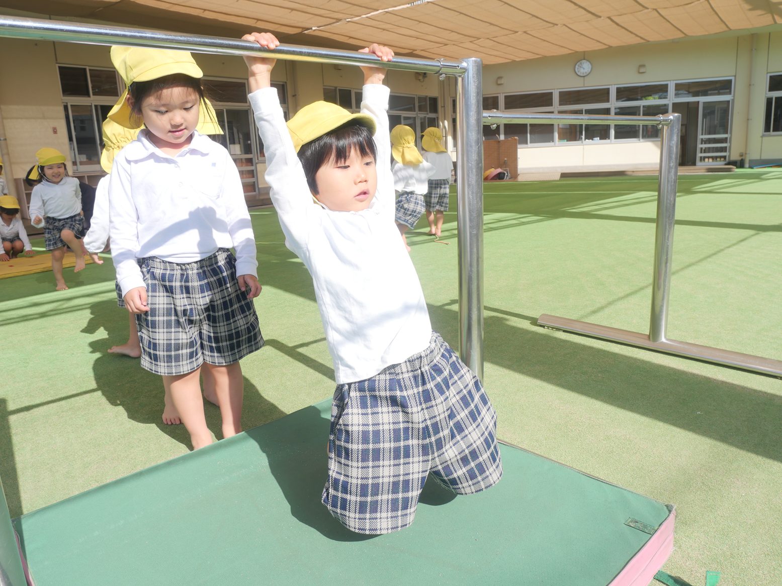 その後は、マットを使って前転を行ったり、鉄棒にぶら下がったりします。