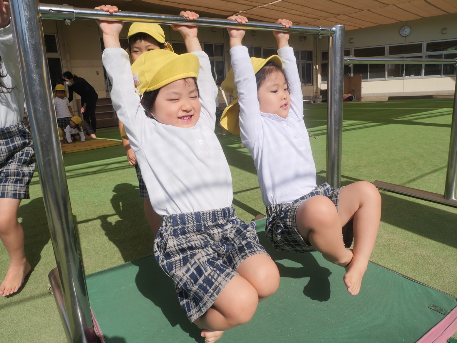 「ぶらぶら~。」「お猿さんみたいだね!」と、リラックスしながら鉄棒にぶら下がっていました。