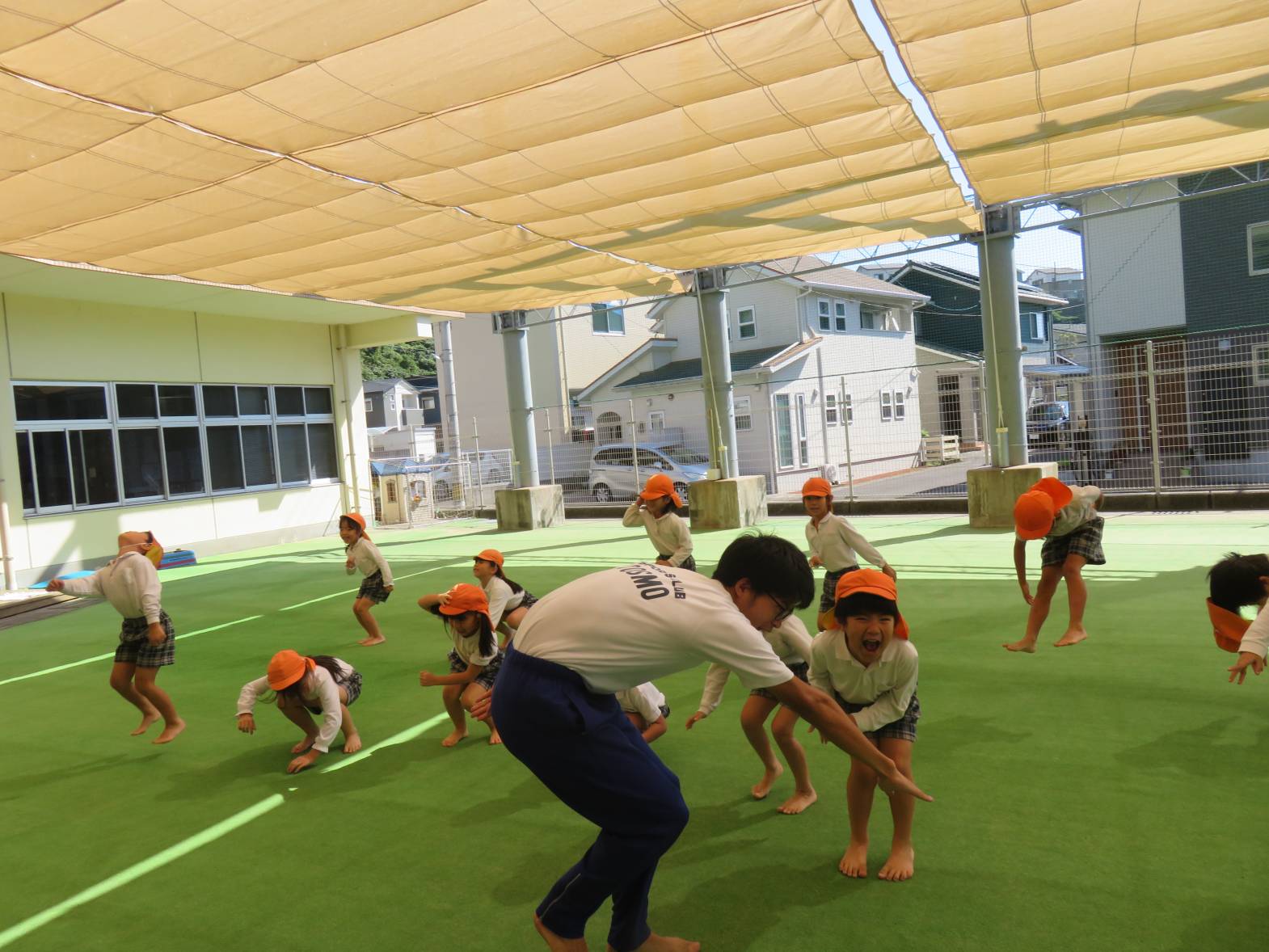 先生が上に手裏剣を投げるふりをするとしゃがみ、下に手裏剣を投げるふりをするとジャンプといった駆け引きを楽しむ子どもたち。