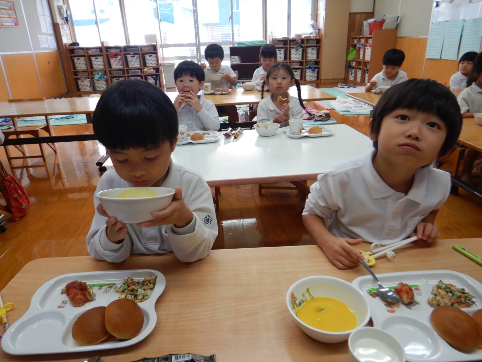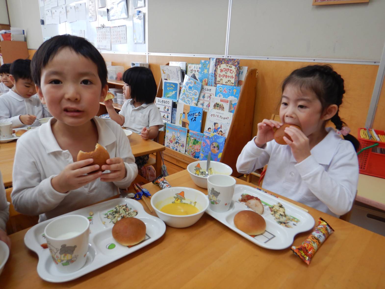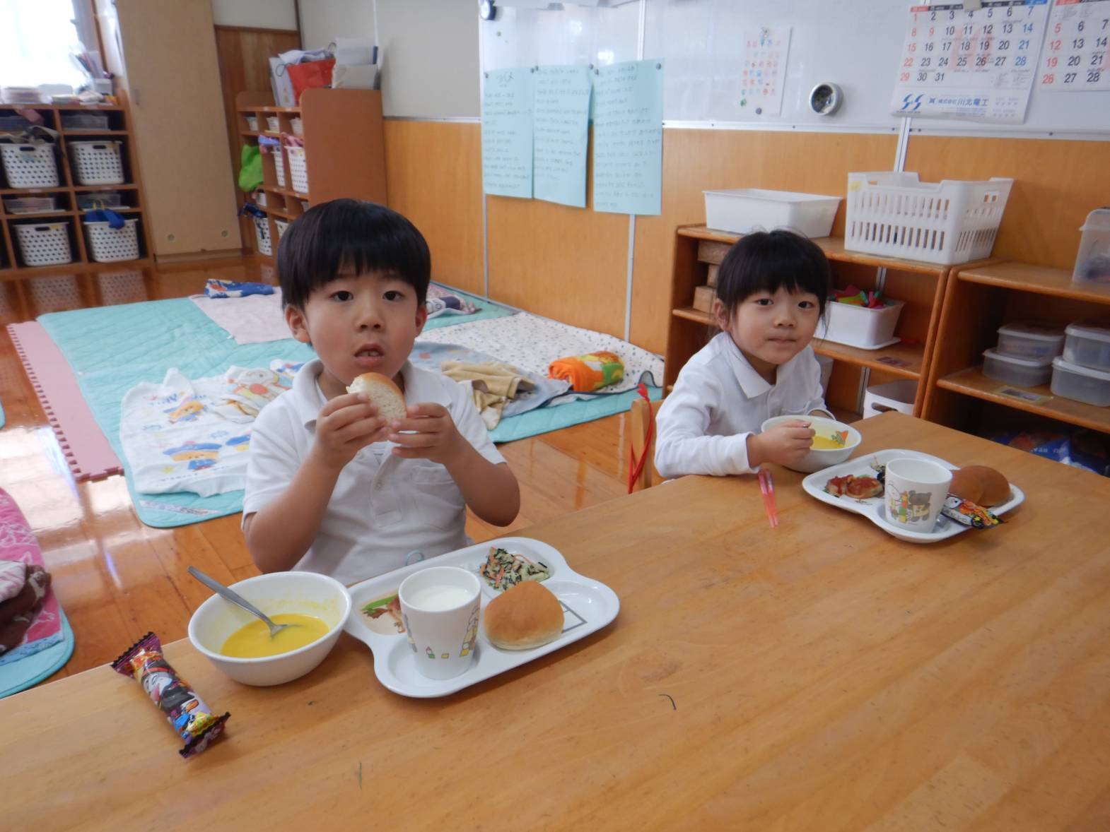 今月のわくわくメニューはハロウィンにちなんだ料理が出てきました。 「かぼちゃのスープ美味しいい。」「うまい棒もある!」と大興奮の子どもたち。 おやつにはお顔やクモなどのハロウィンデコレーションされたシュークリームを「見て!お顔が描いて絵あるよ!」と嬉しそうにお友だちと見せ合う姿が見られました。 次のわくわくメニューが待ち遠しいうさぎ組さんでした。