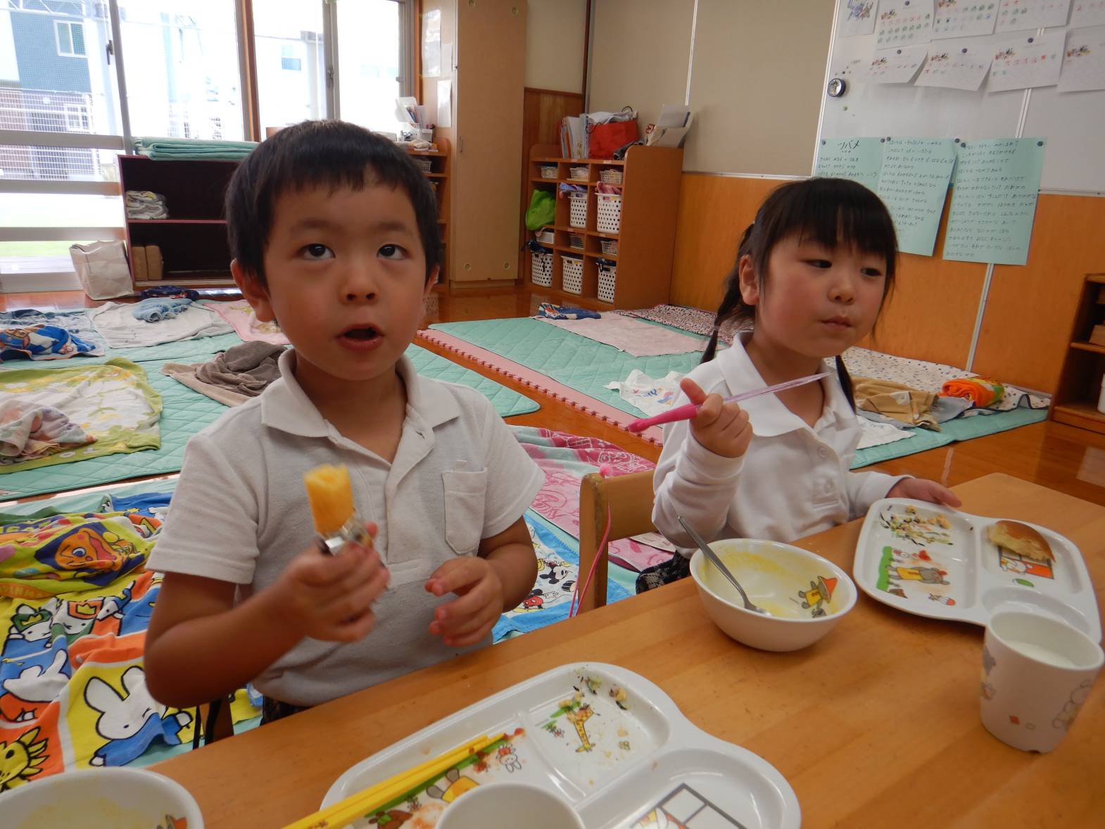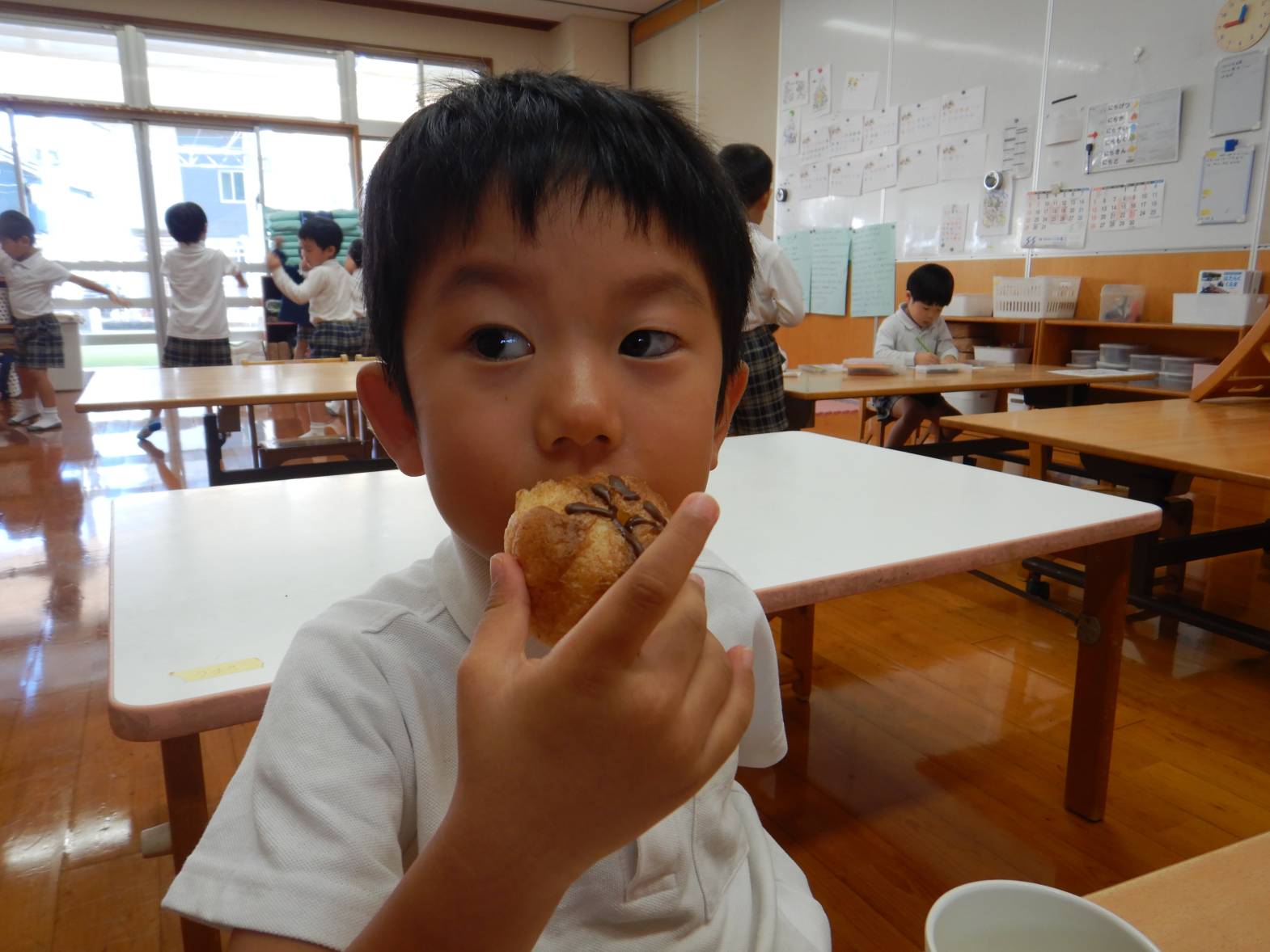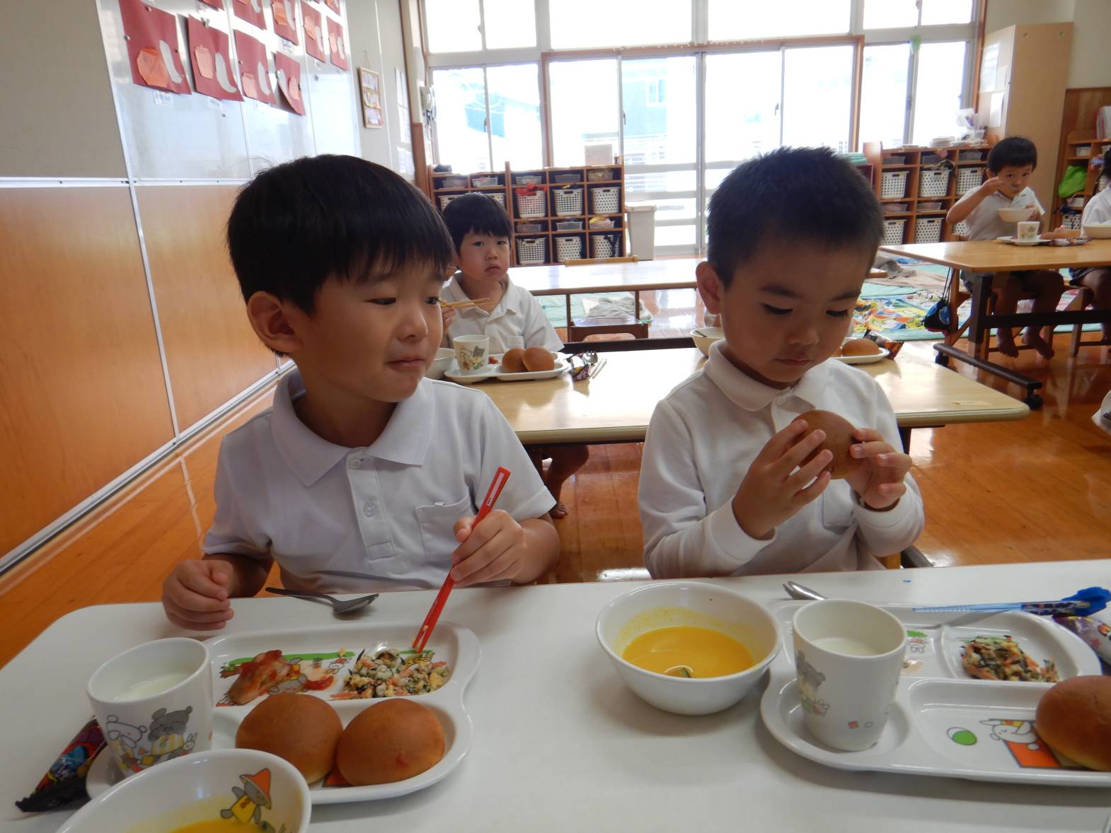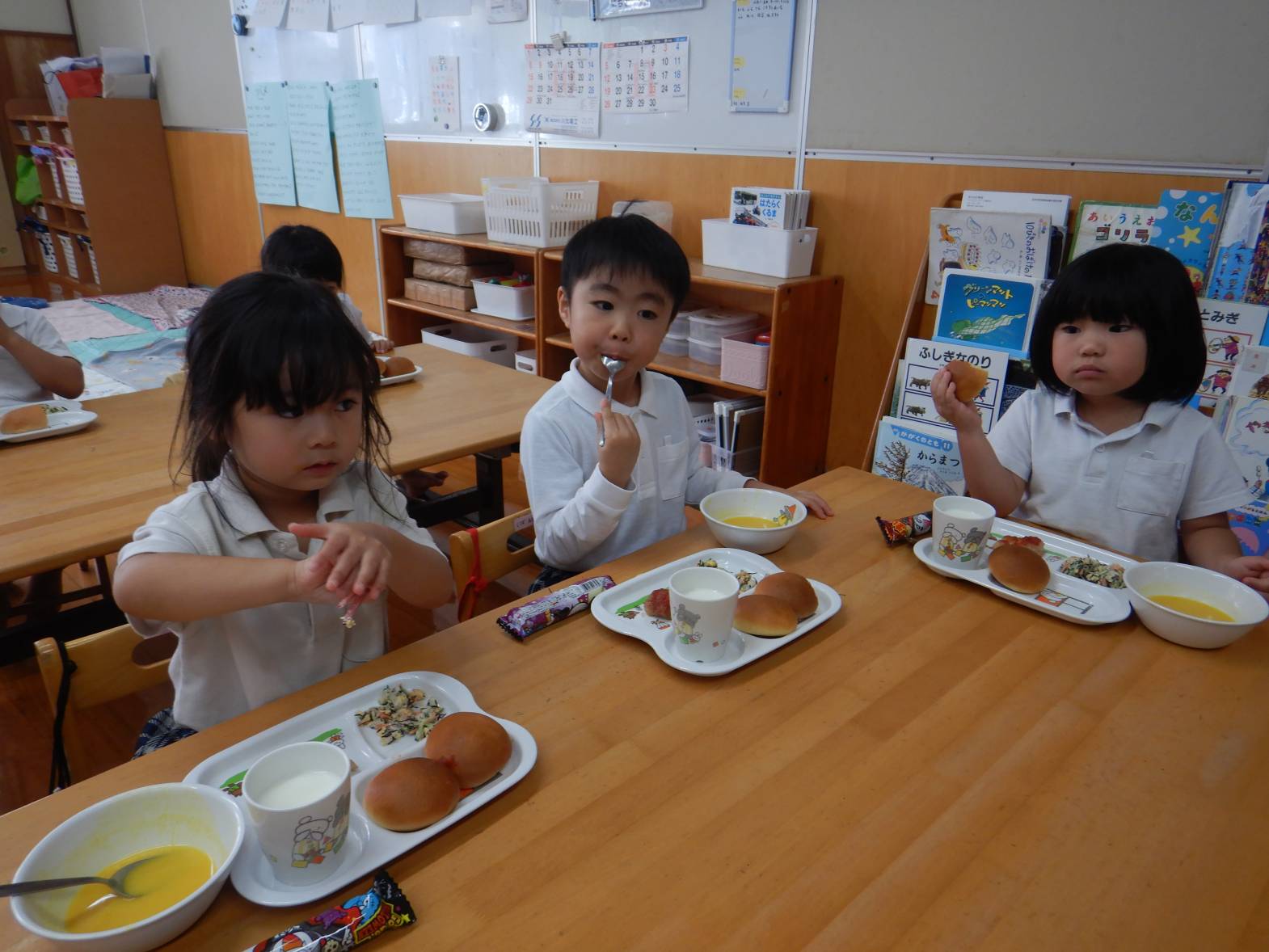 今月のわくわくメニューはハロウィンにちなんだ料理が出てきました。 「かぼちゃのスープ美味しいい。」「うまい棒もある!」と大興奮の子どもたち。 おやつにはお顔やクモなどのハロウィンデコレーションされたシュークリームを「見て!お顔が描いて絵あるよ!」と嬉しそうにお友だちと見せ合う姿が見られました。 次のわくわくメニューが待ち遠しいうさぎ組さんでした。