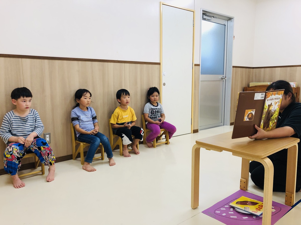 「あ、かぼちゃだ!」「いちょうの葉っぱもあるよ。」と絵本に隠された秋に気付くことができた子どもたち。集中して聞く姿が見られます。