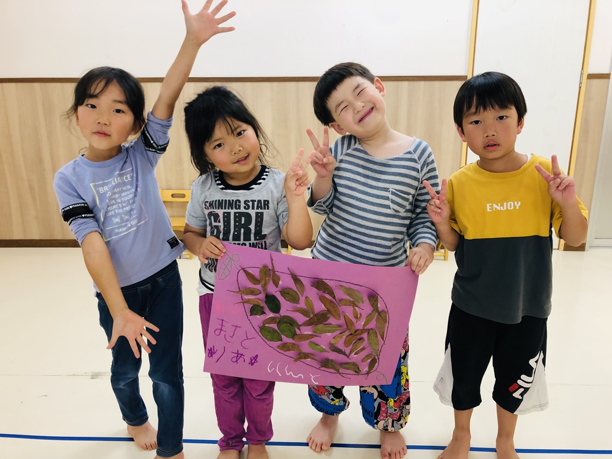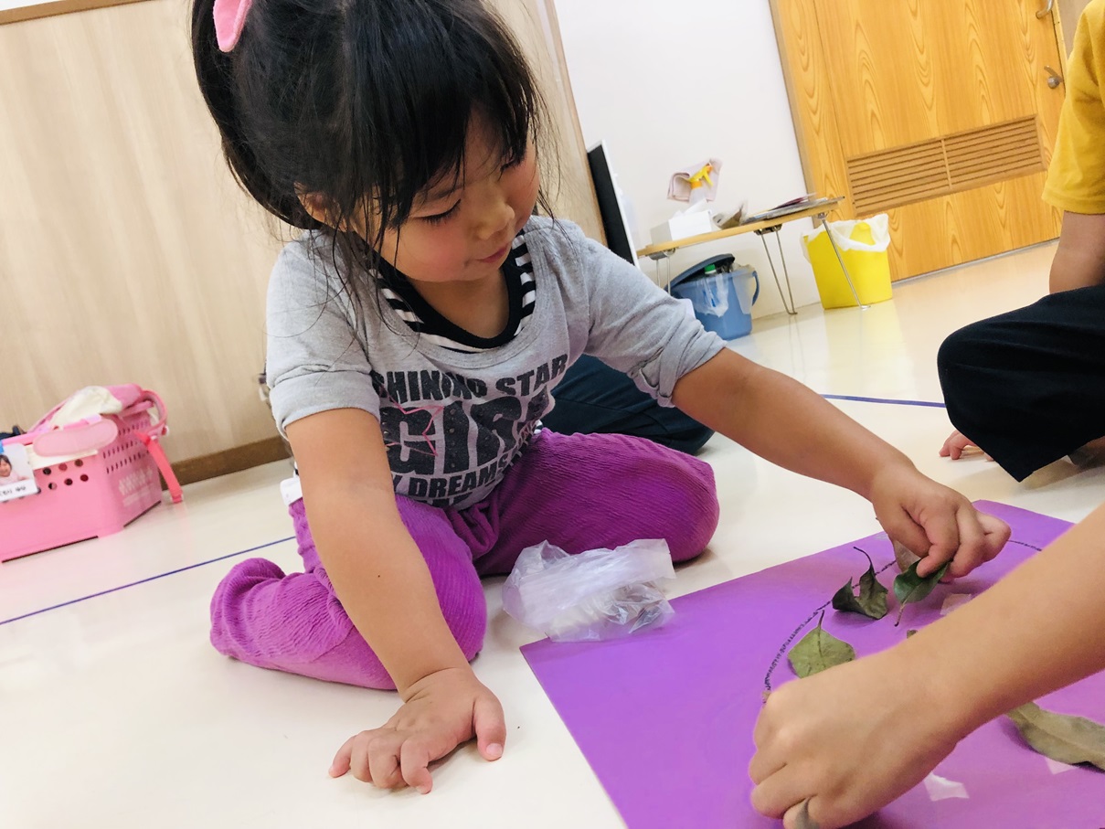 みんなで拾った落ち葉を焼き芋の形に張り付けていきます。完成すると、「お腹空いた食べちゃいたい!」と思わず食べたくなるほどのお芋が完成しました。