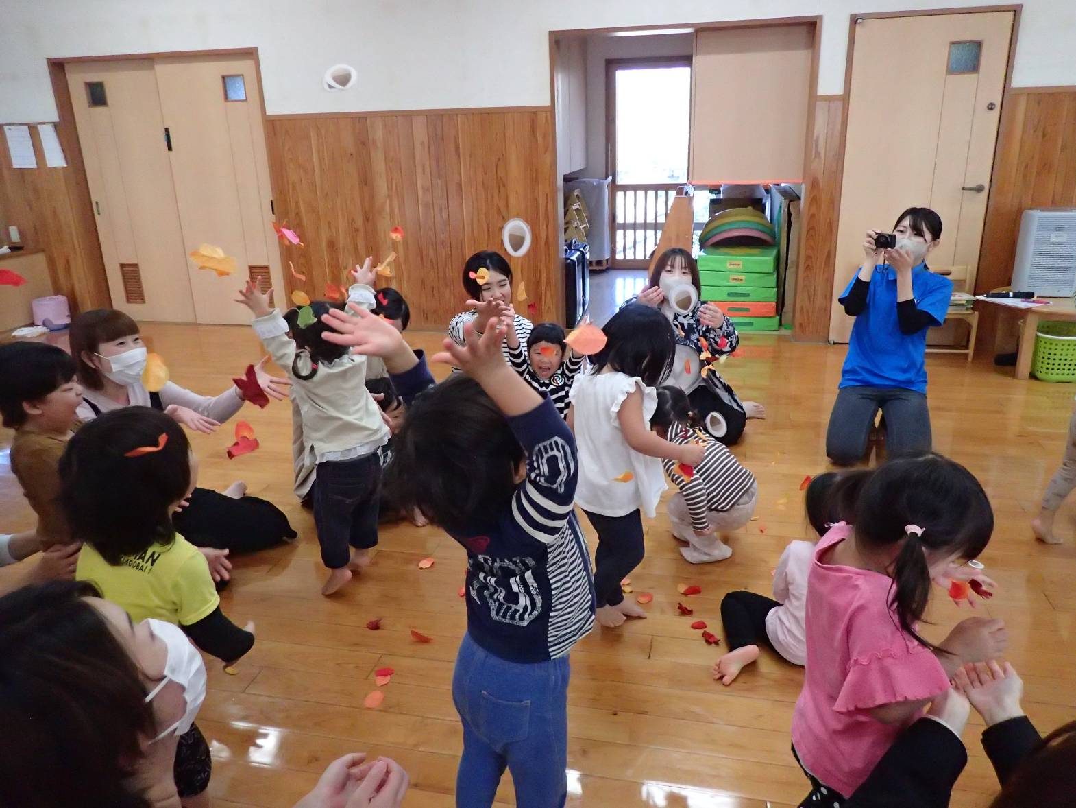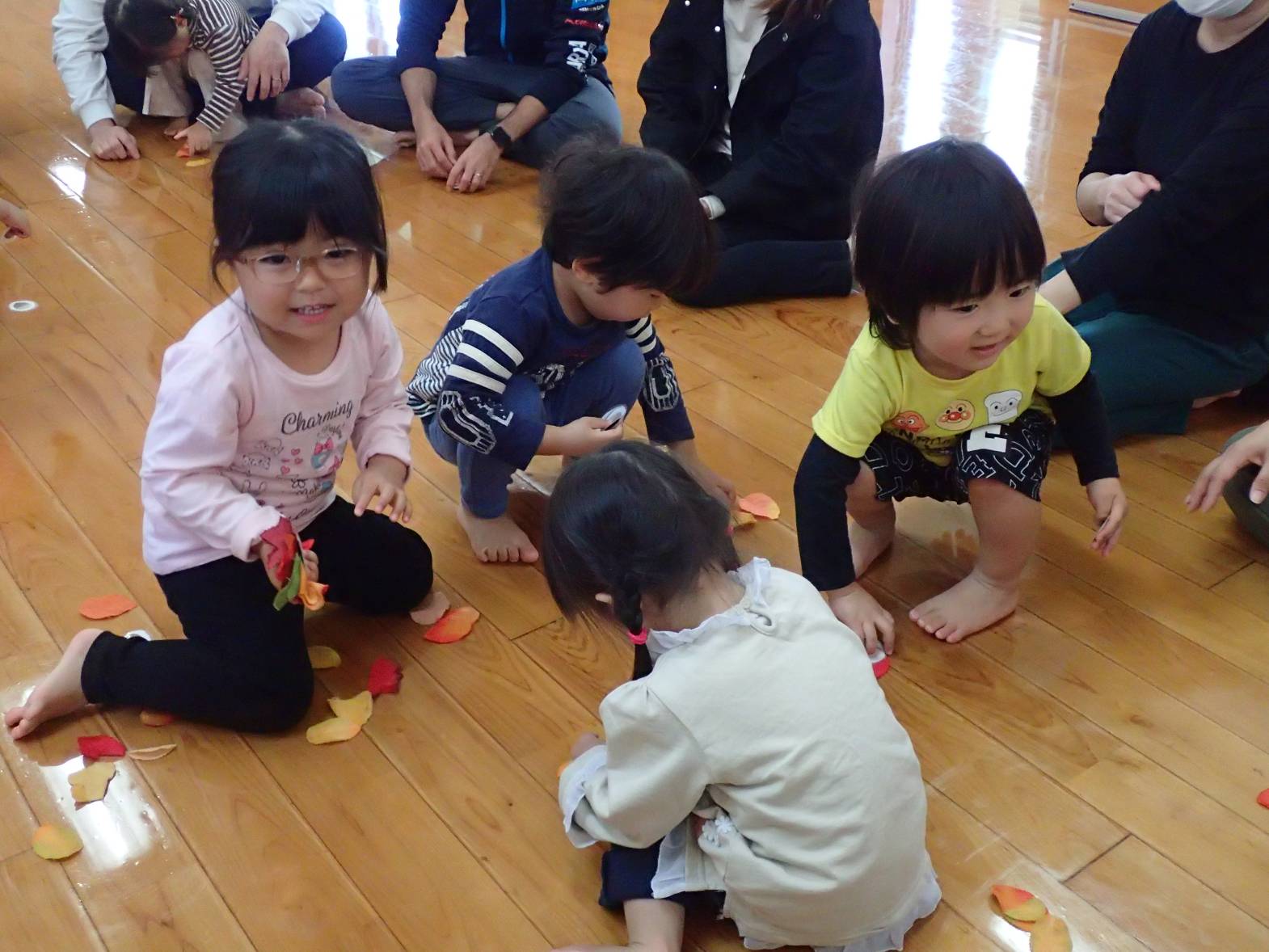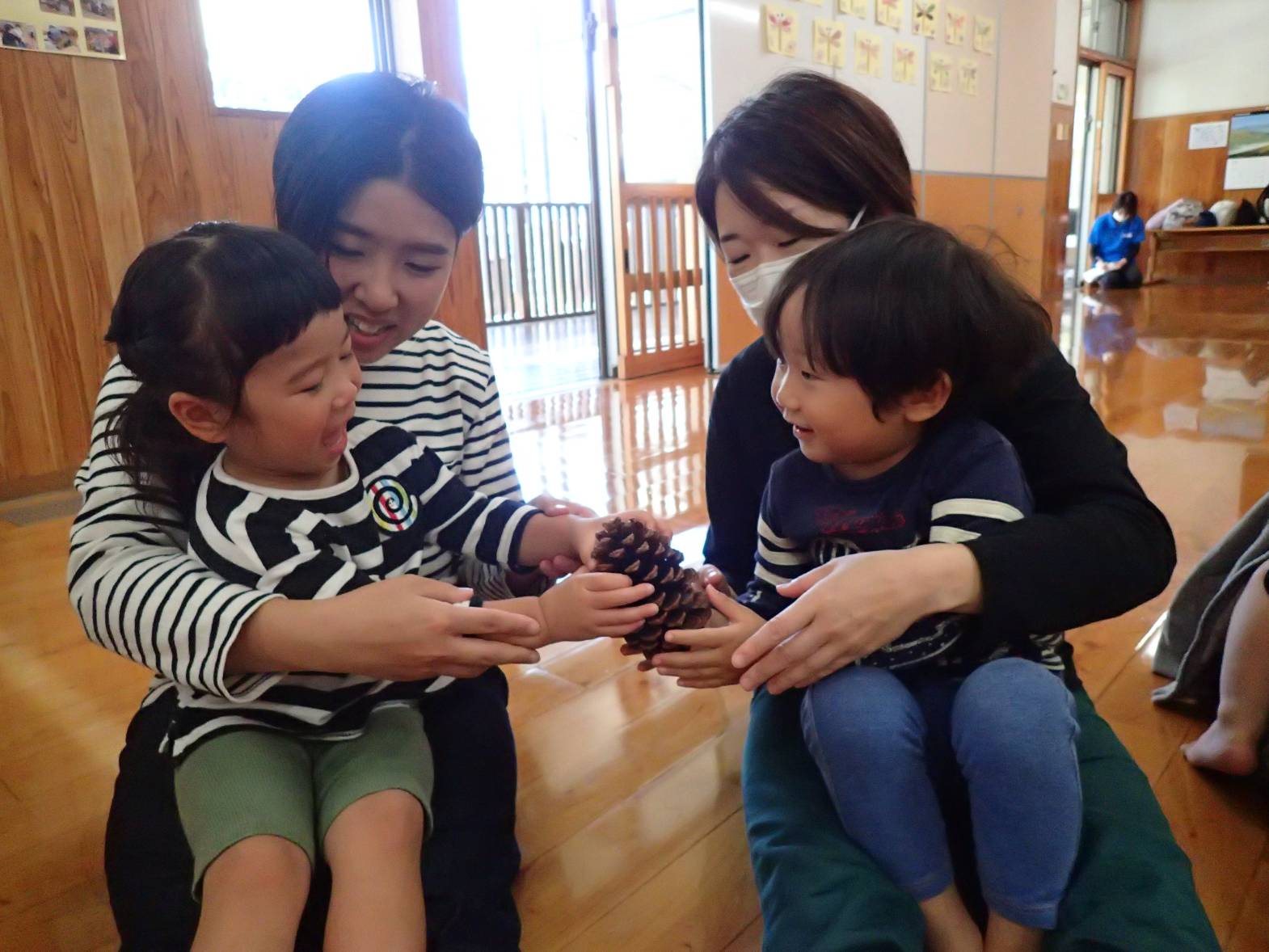 今日は、ぱんだ組で親子でのふれあい活動がありました。 講師の先生のお越し頂き、リトミックの活動を行ったぱんだ組さん。 どんぐりころころやまつぼっくりの歌に合わせて、親子で向かい合って体を動かしたり、まつぼっくりを隣の友だちに渡したりしながらリズム遊びを楽しんだ子どもたち。 「楽しかったね!」とたくさんの笑顔が見られ、お父さん、お母さんと一緒に楽しい時間を過ごすことができました! お忙しい中、ご参加下さり、ありがとうございました。