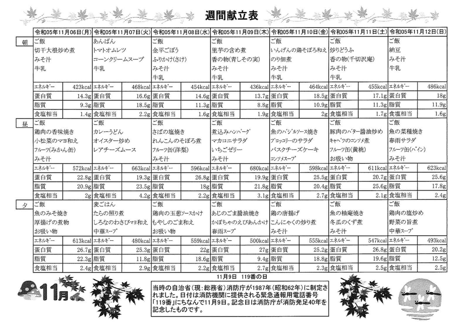 11月6日(月)~11月12日(日)の献立表になります。ぜひご覧ください。
