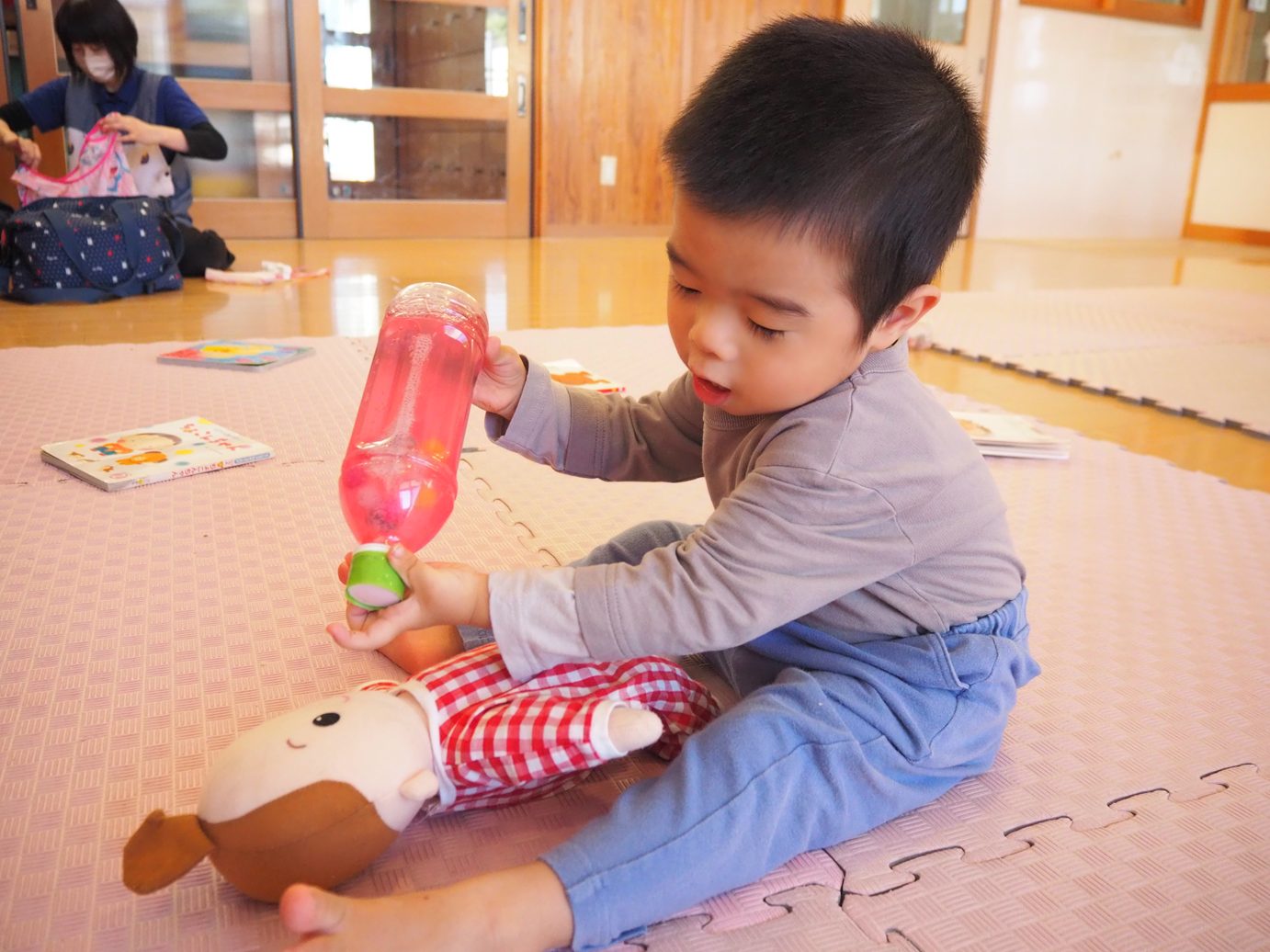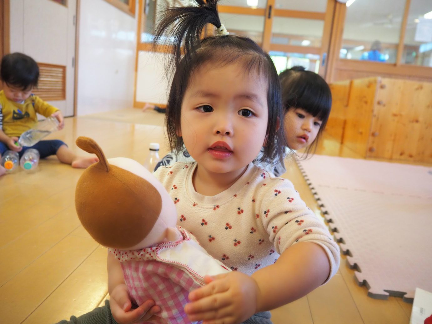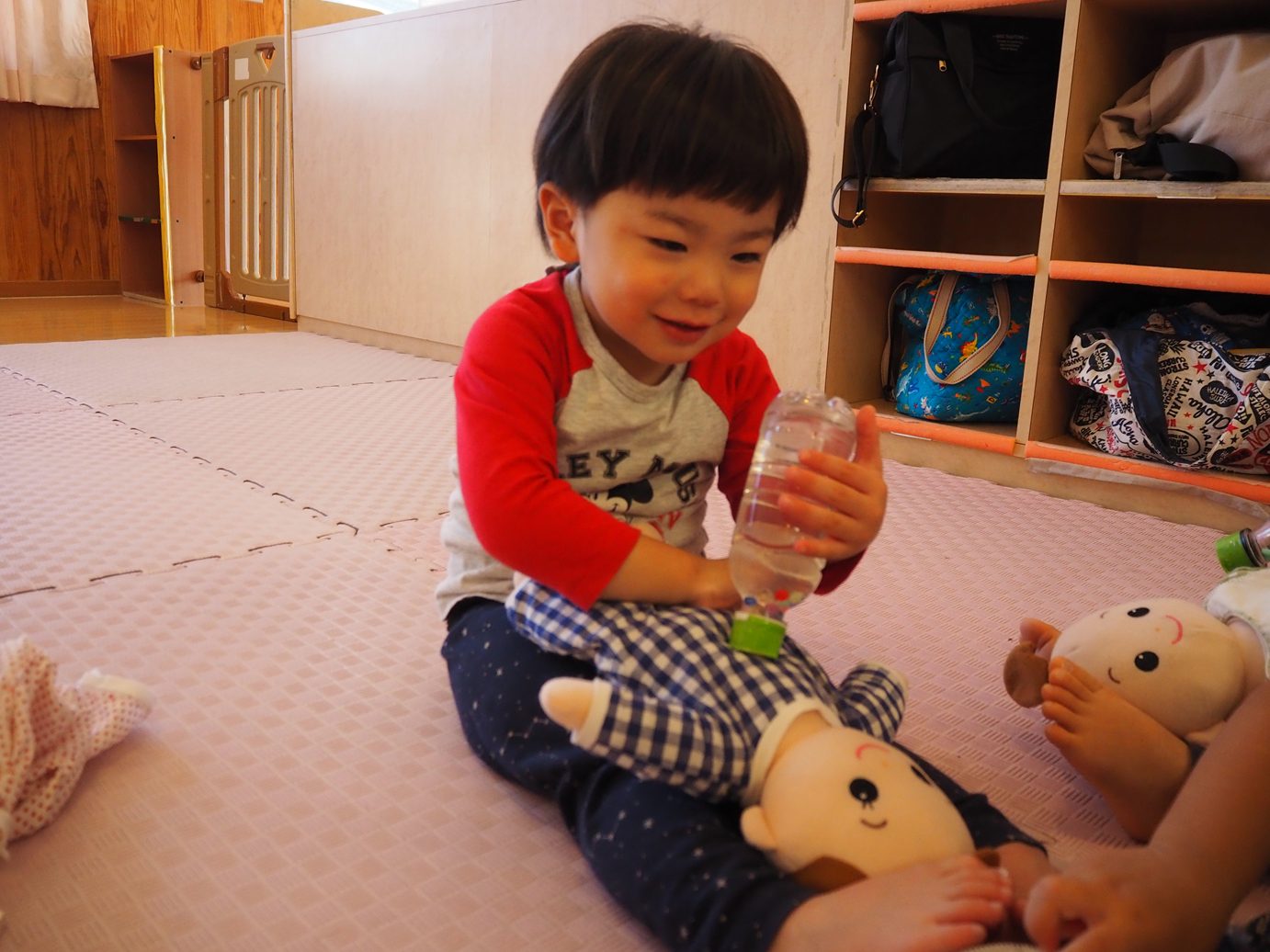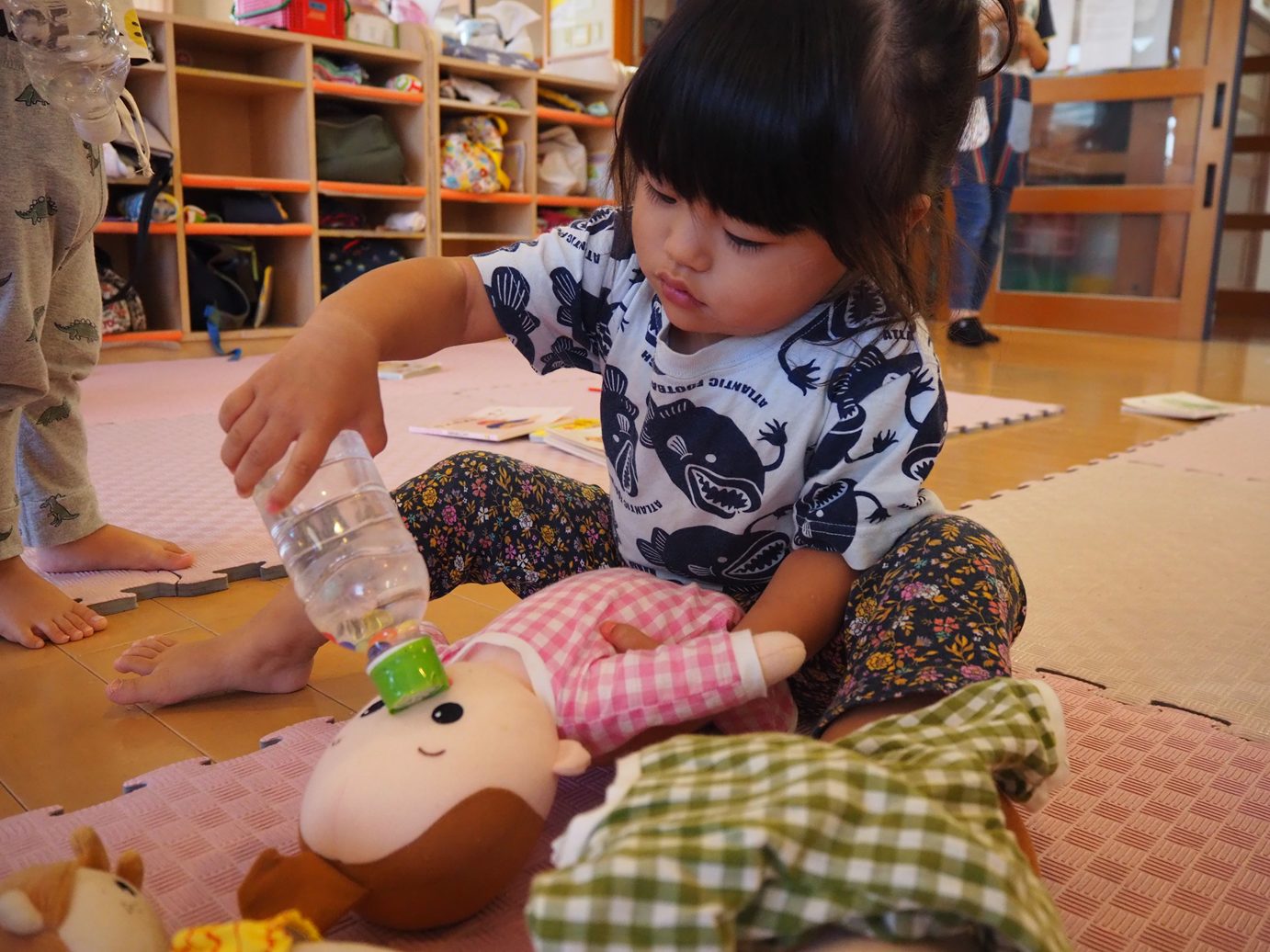 最近小さい組さんに興味を持つこあら組さん。人形遊びでは「ごくごくごく。」と声に出しながらミルクをあげる真似をする子どもたち。洋服なども脱がせることもできるようになってきました。 本当の赤ちゃんのように「眠たい?」、「よしよし。」と抱っこをして遊ぶ姿に成長を感じているところです。 みんなで集まっていたところを覗いてみると、子どもたち同士でも乾杯をしながら飲む真似をして楽しむこあら組さんでした。
