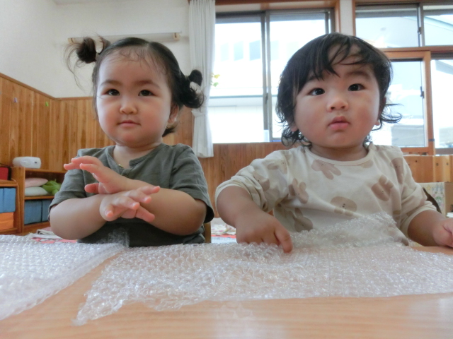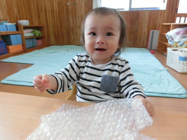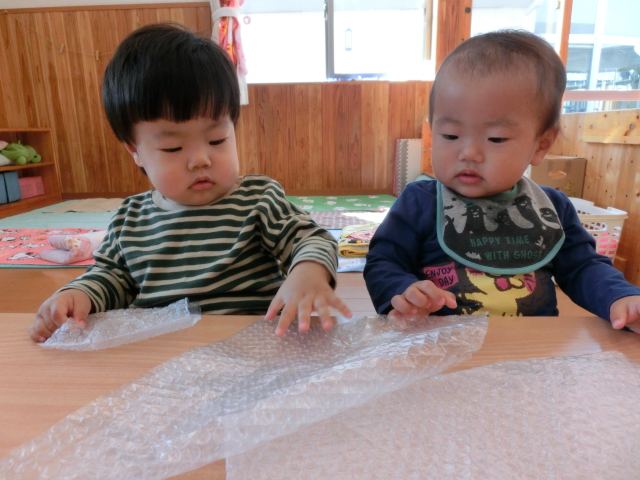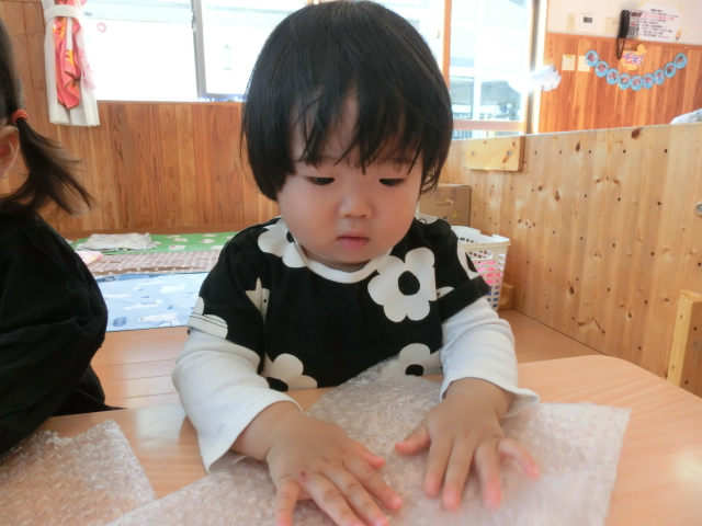 指先を使用する活動として、プチプチを渡してみました。 始めは、「なんだろう…?」という表情を見せていた子どもたちでしたが、 保育者が実際に触れて見本を示すと、動きを真似て触る姿がありました! ぎゅっと強く握ったり、小さな気泡に指先でツンツンと触れたりと、 各々感触を楽しむひよこ組さんでした。 また、隣に座っている友だちと一緒に触ったり、笑い合ったりする様子もありました♪
