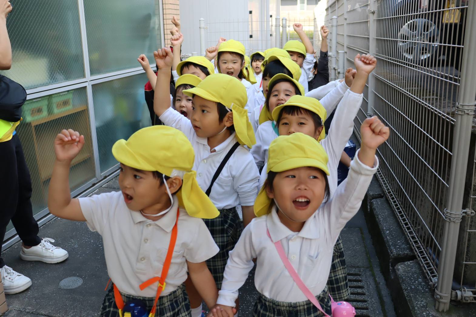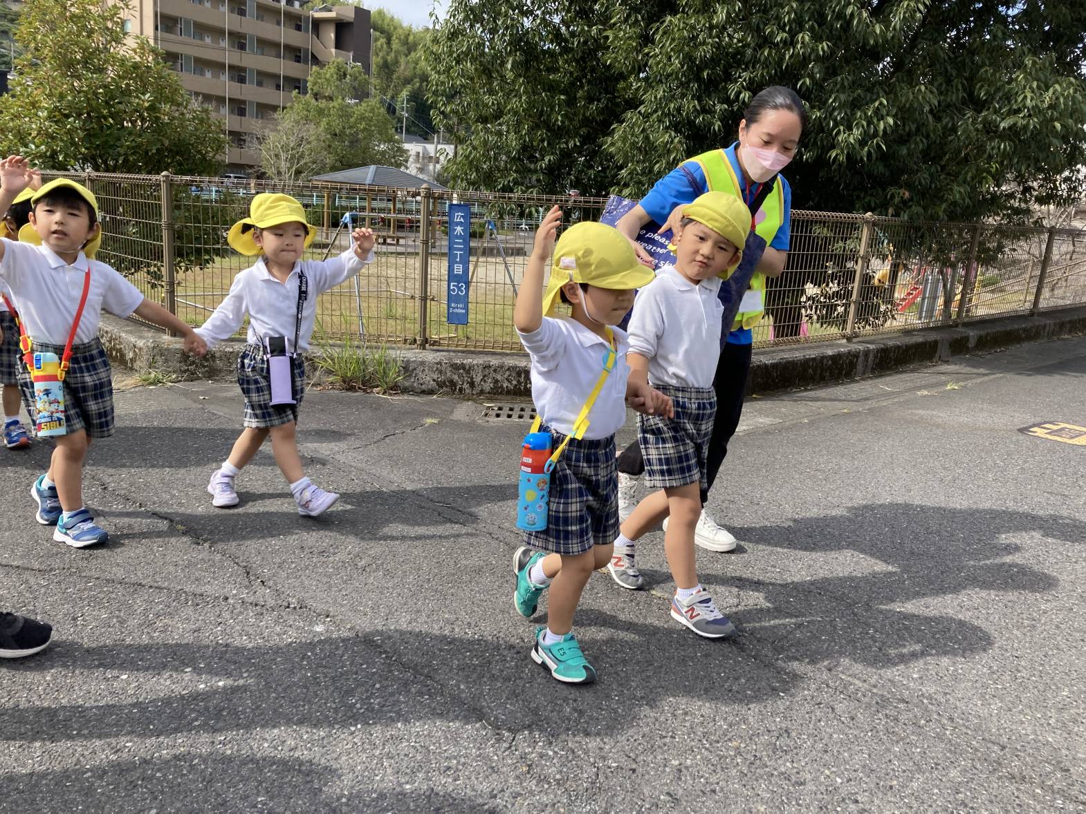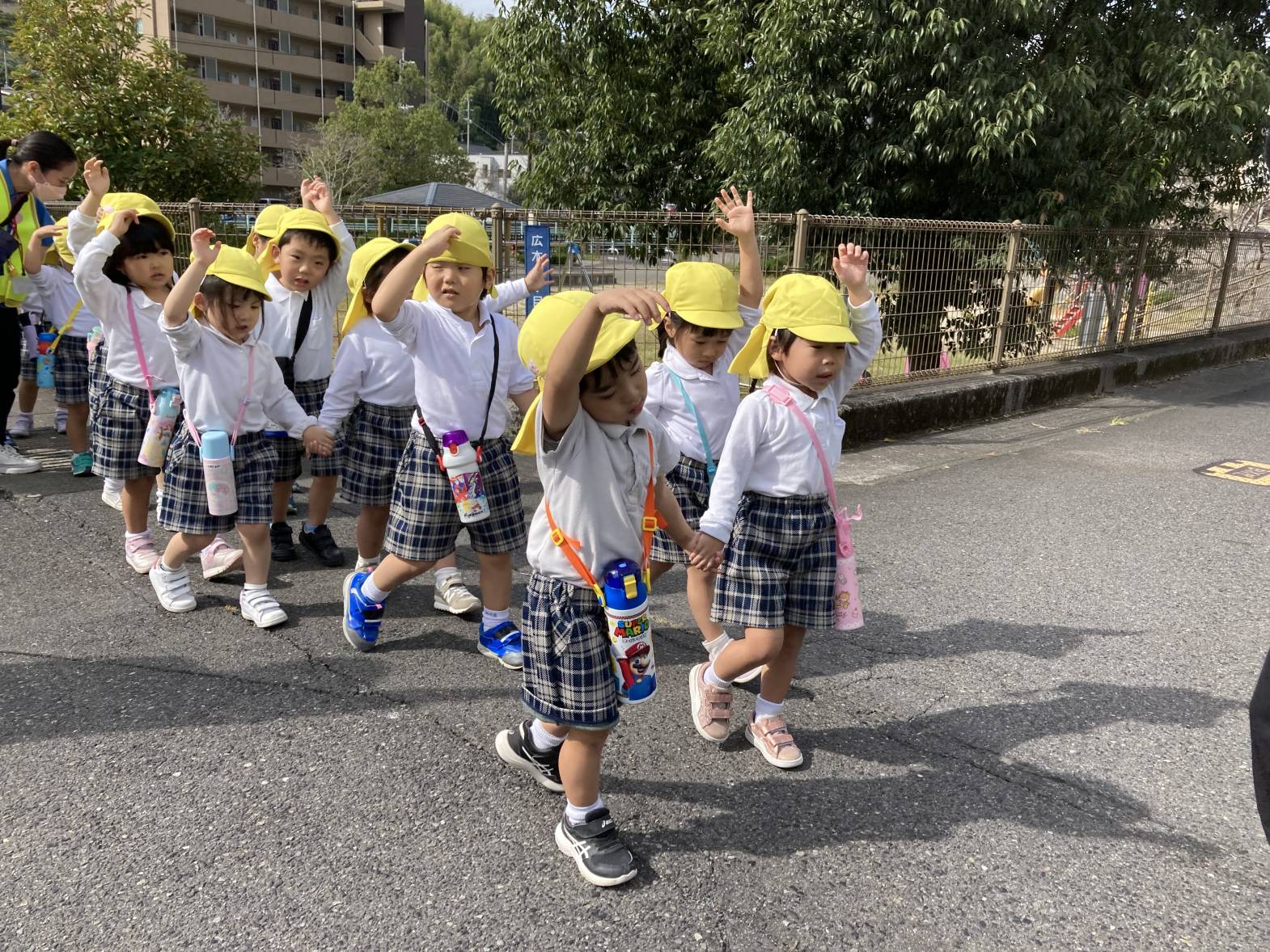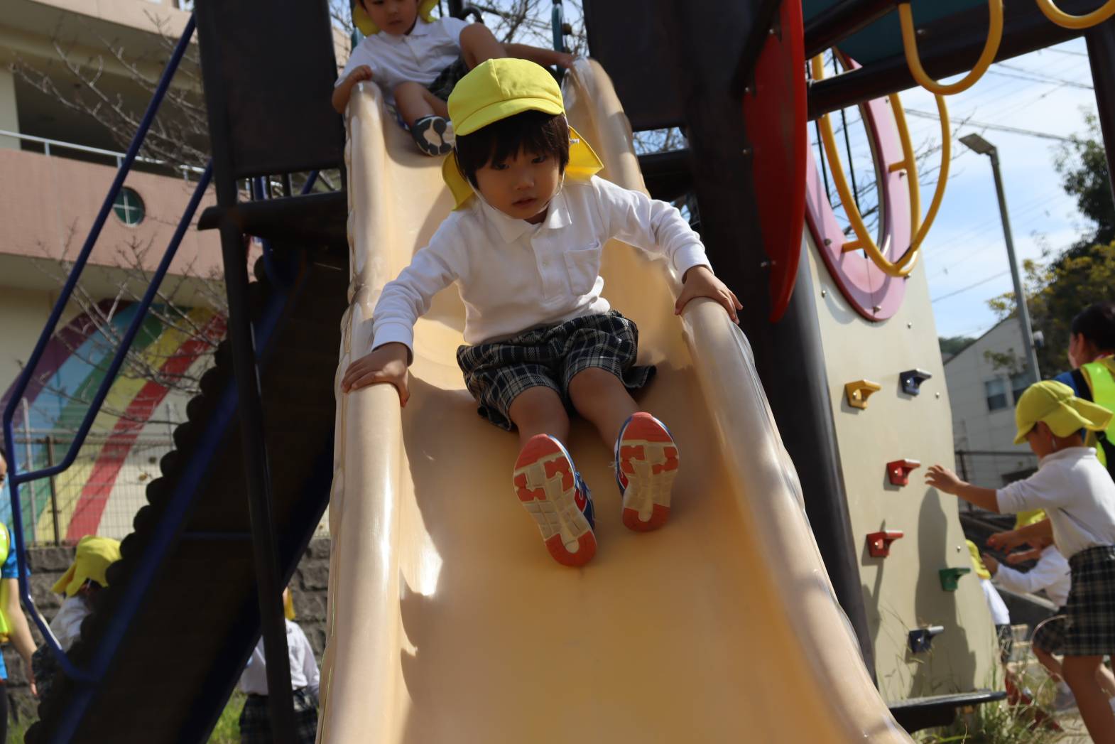 今月のおむすびの日は広木第2公園に行きました。 登園すると、「公園に行くんだよね!」「滑り台とブランコに乗りたいな!」 と、わくわくした表情を見せる、りす組さん。 「えいえいおー!」と、みんなで掛け声をして、元気いっぱいに出発です。 道路横断も、上手に手を挙げて渡ることができました! 公園に着くと早速遊具で遊び始める子どもたち。 「公園楽しかったね!」「また遊ぼうよ!」 と、時間いっぱいに活動を楽しんだりす組さんでした!