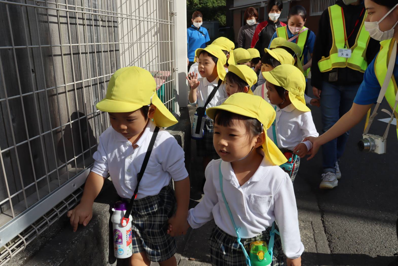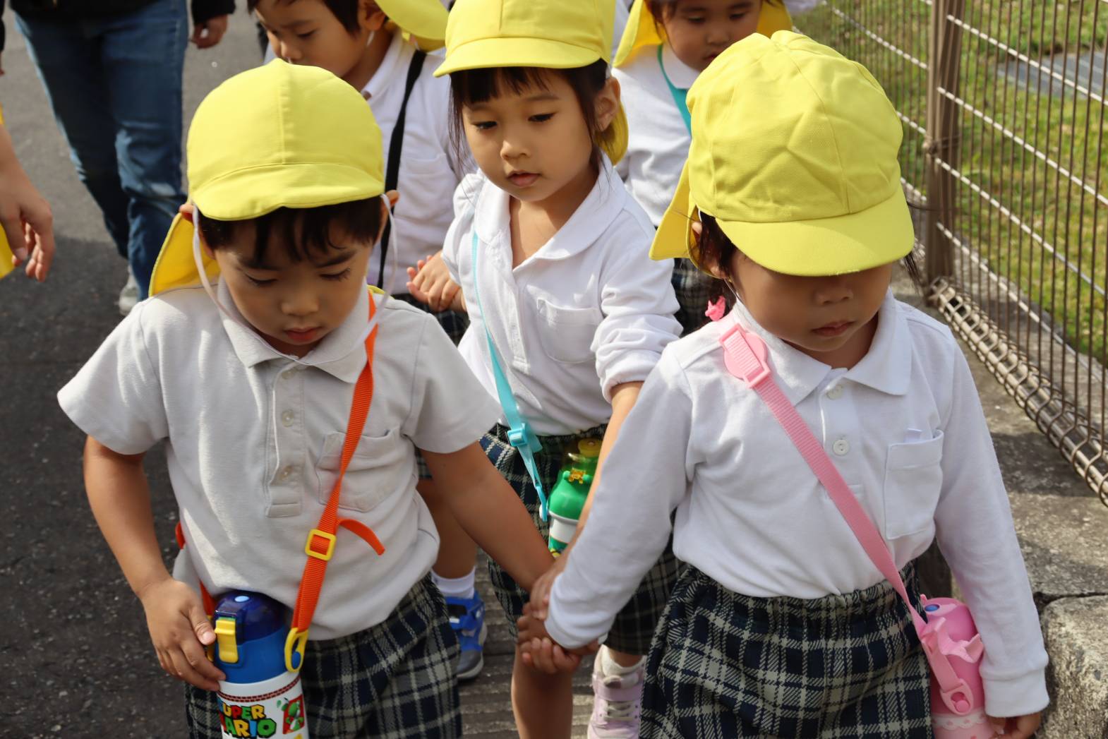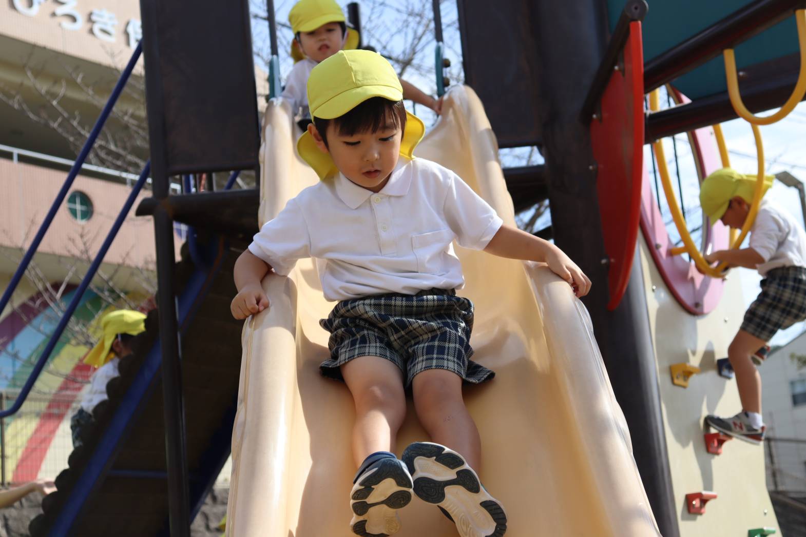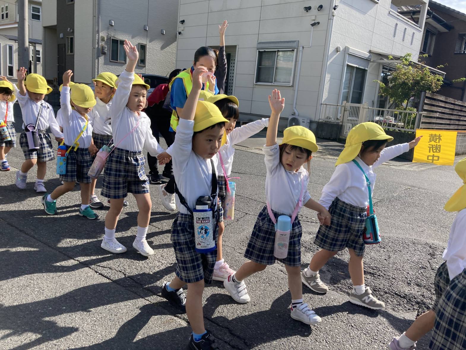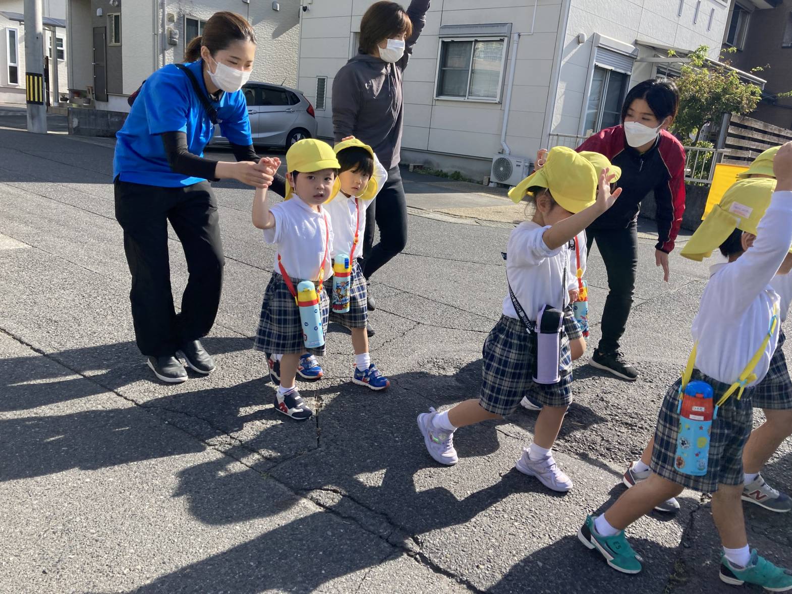 今月のおむすびの日は広木第2公園に行きました。 登園すると、「公園に行くんだよね!」「滑り台とブランコに乗りたいな!」 と、わくわくした表情を見せる、りす組さん。 「えいえいおー!」と、みんなで掛け声をして、元気いっぱいに出発です。 道路横断も、上手に手を挙げて渡ることができました! 公園に着くと早速遊具で遊び始める子どもたち。 「公園楽しかったね!」「また遊ぼうよ!」 と、時間いっぱいに活動を楽しんだりす組さんでした!