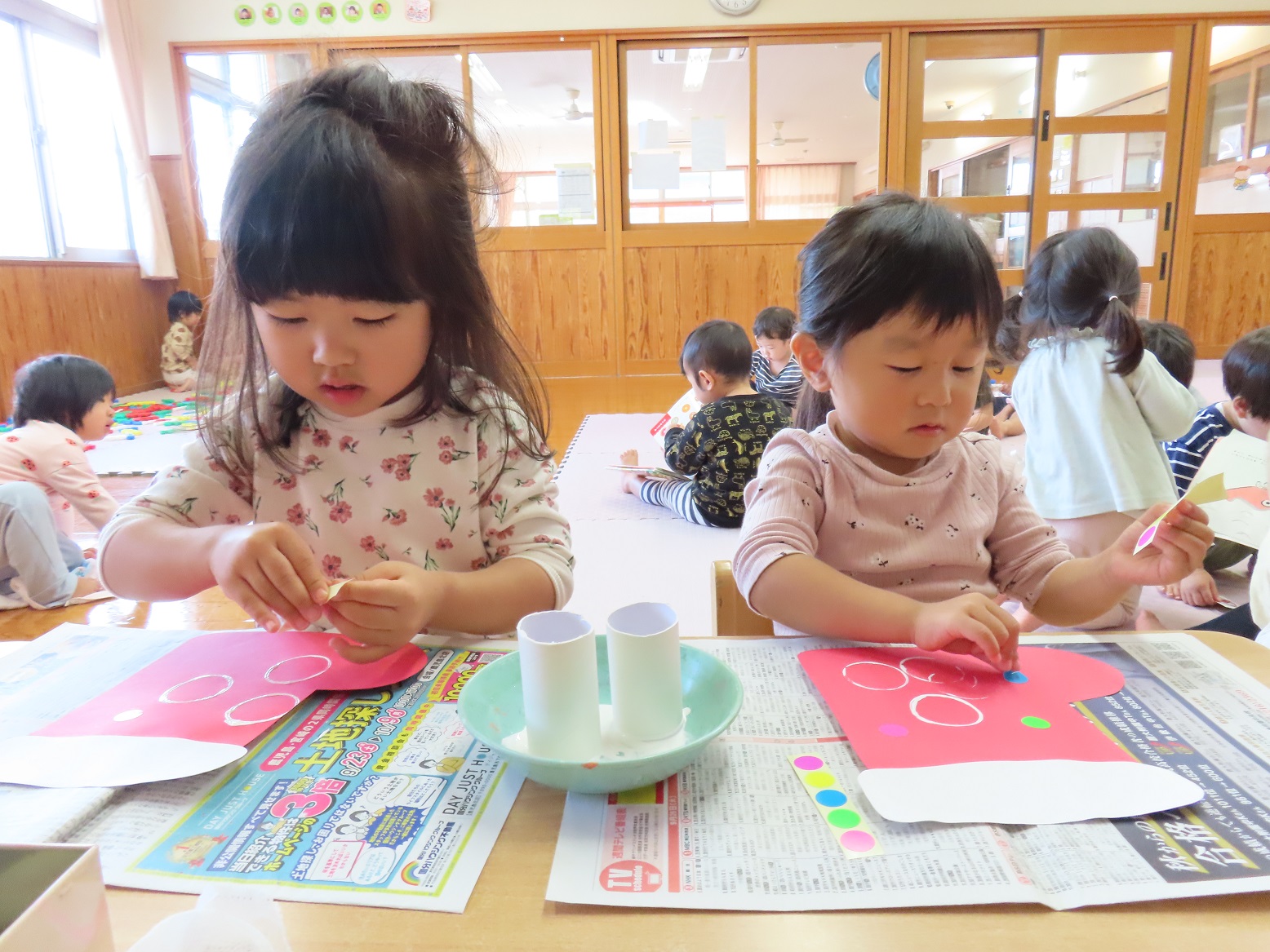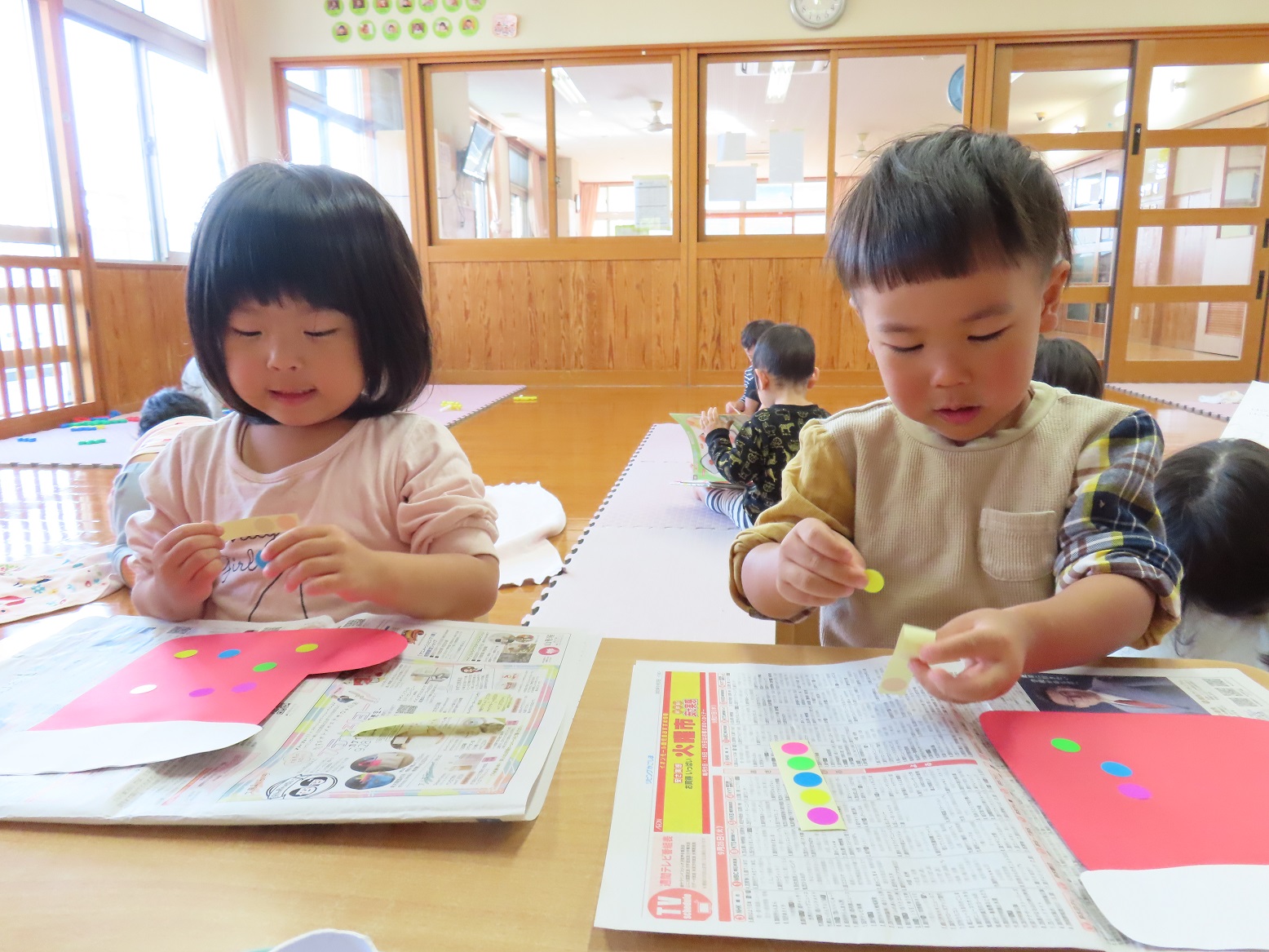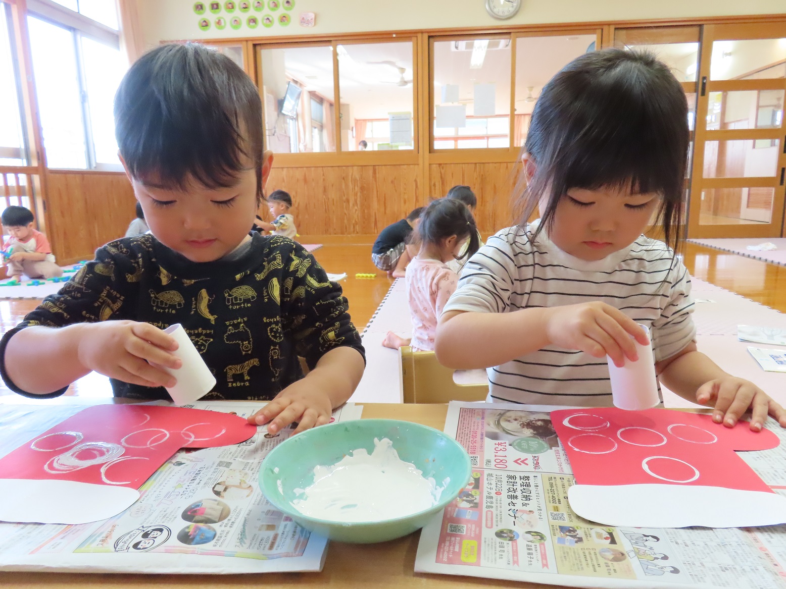 ぱんだ組では、来月行われるクリスマス会の会場に飾る靴下の製作を行いました。 少しずつ、クリスマスやサンタクロースについて詳しくなってきており、「サンタさんがプレゼント持ってきてくれるんだよね!」とクリスマスにどきどきわくわくしている様子です。 製作では、靴下の形をした画用紙に模様を付けたり、キラキラシールを貼ったりしました。 靴下が出来上がってくると、「上手にできたよ!」「キラキラしている!」と嬉しそうな子どもたち。 クリスマス会当日、子どもたちの作品を楽しみにしていて下さい!