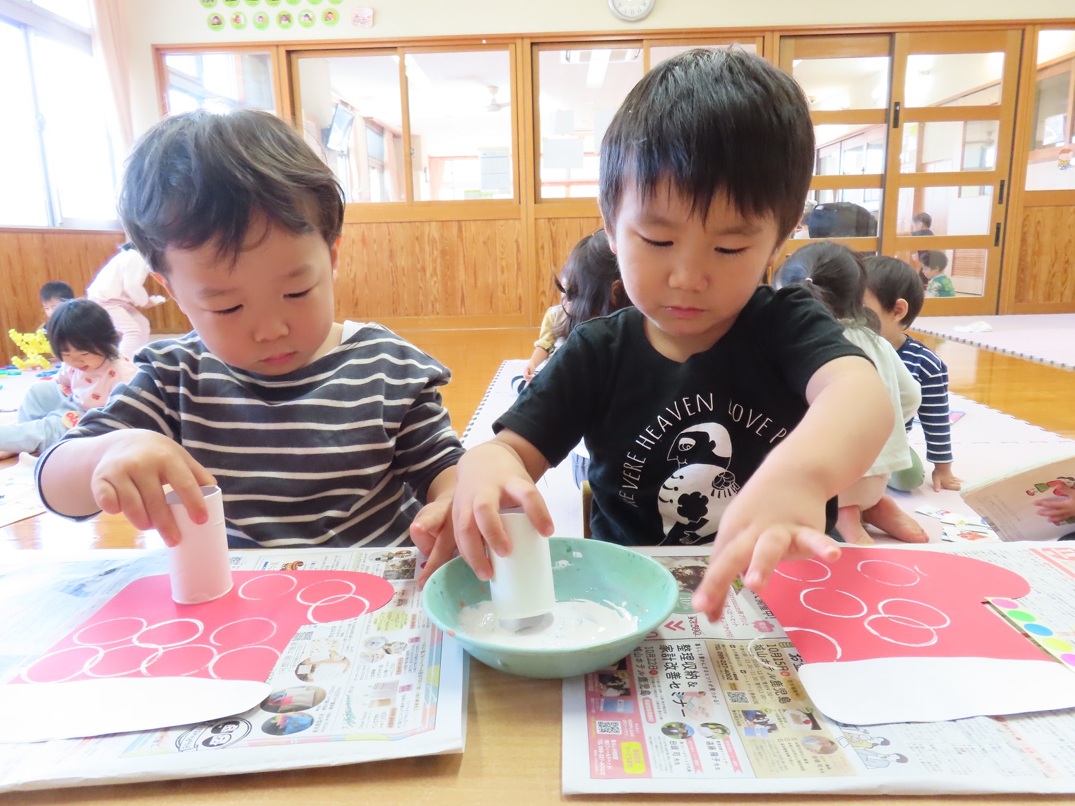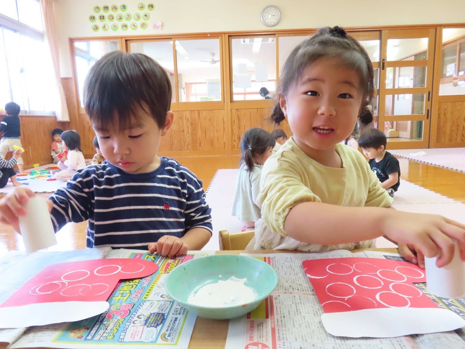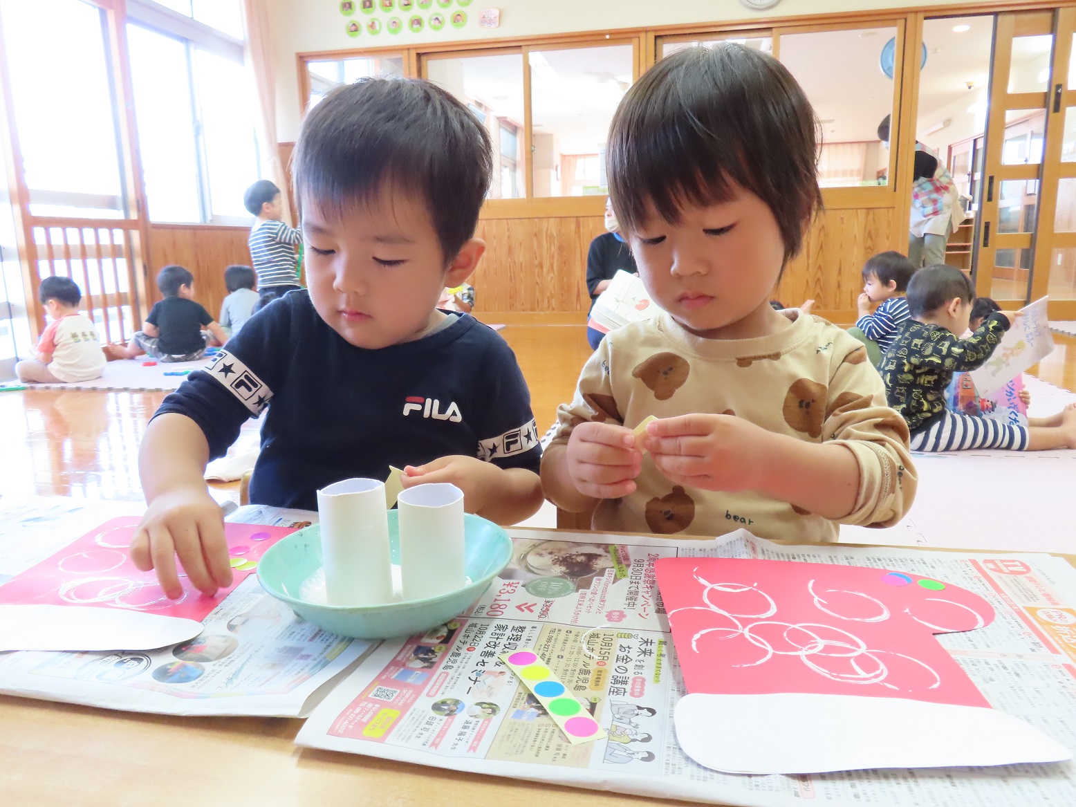 ぱんだ組では、来月行われるクリスマス会の会場に飾る靴下の製作を行いました。 少しずつ、クリスマスやサンタクロースについて詳しくなってきており、「サンタさんがプレゼント持ってきてくれるんだよね!」とクリスマスにどきどきわくわくしている様子です。 製作では、靴下の形をした画用紙に模様を付けたり、キラキラシールを貼ったりしました。 靴下が出来上がってくると、「上手にできたよ!」「キラキラしている!」と嬉しそうな子どもたち。 クリスマス会当日、子どもたちの作品を楽しみにしていて下さい!
