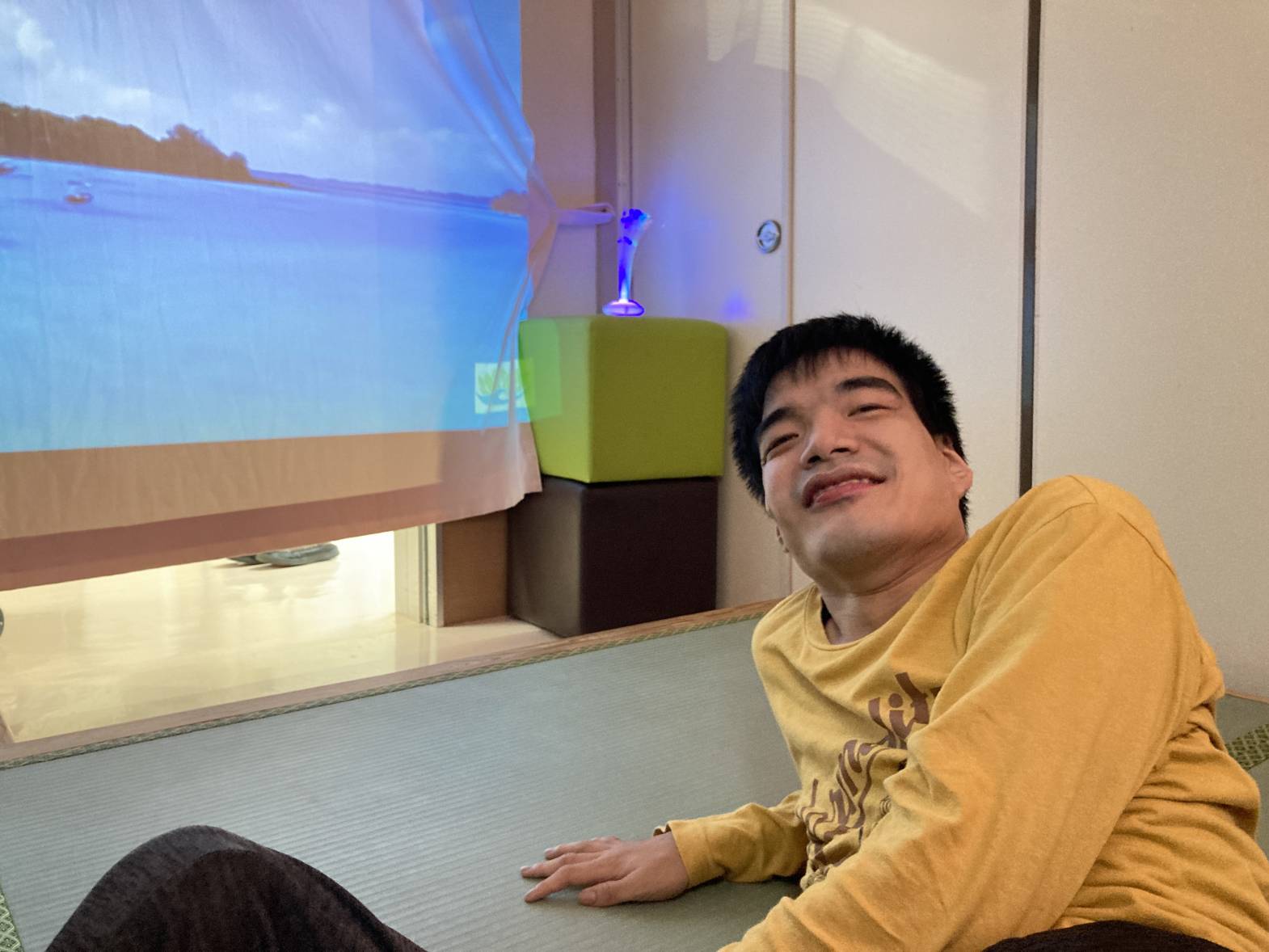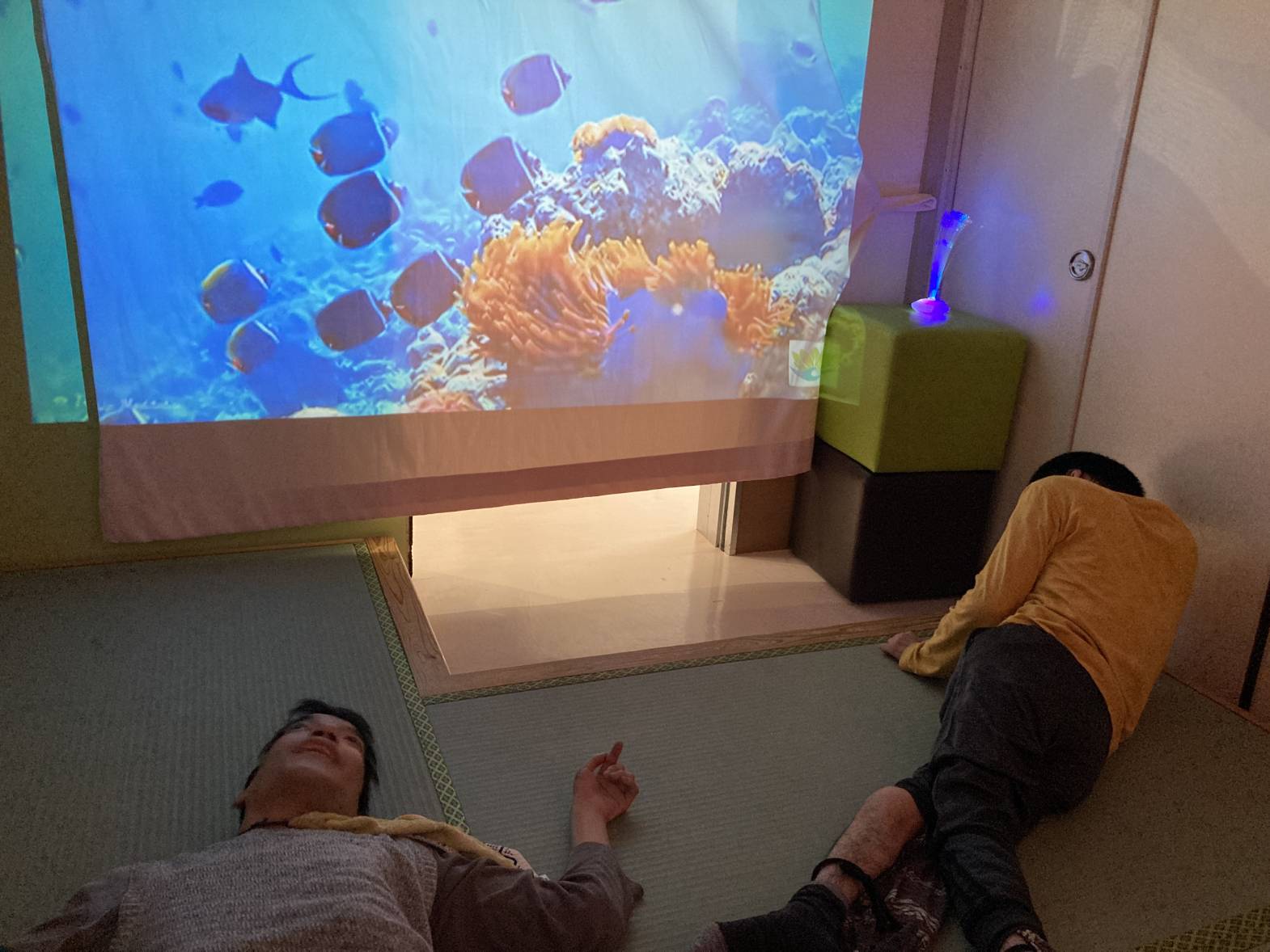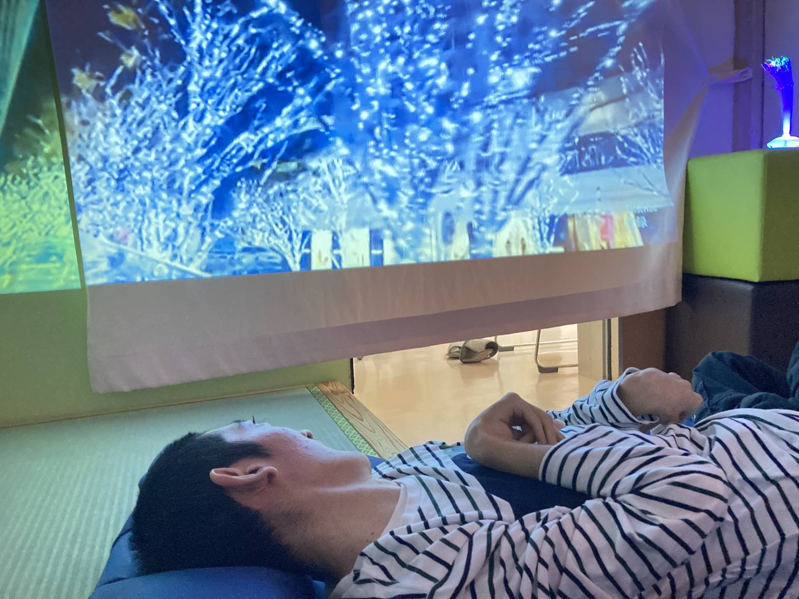スヌーズレン活動を行いました。 アロマを焚き、プロジェクターで癒しの動画を流しながら、 幻想的な雰囲気の中でゆったりとくつろぎました。 夜景やイルミネーション 海の映像などを流し、皆さん水の音などにも癒されながら、 リラックスして過ごされていたようです。 これから寒くなって体もこわばりがちになってくるので、リラックスした時間を 取り入れていきましょう☆