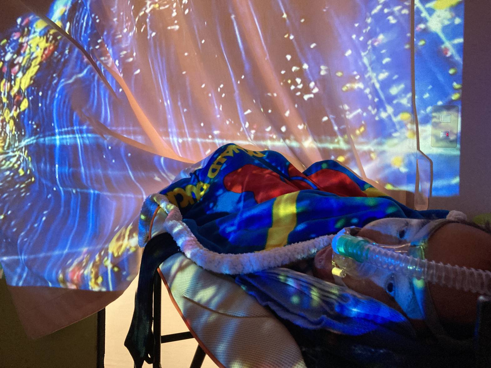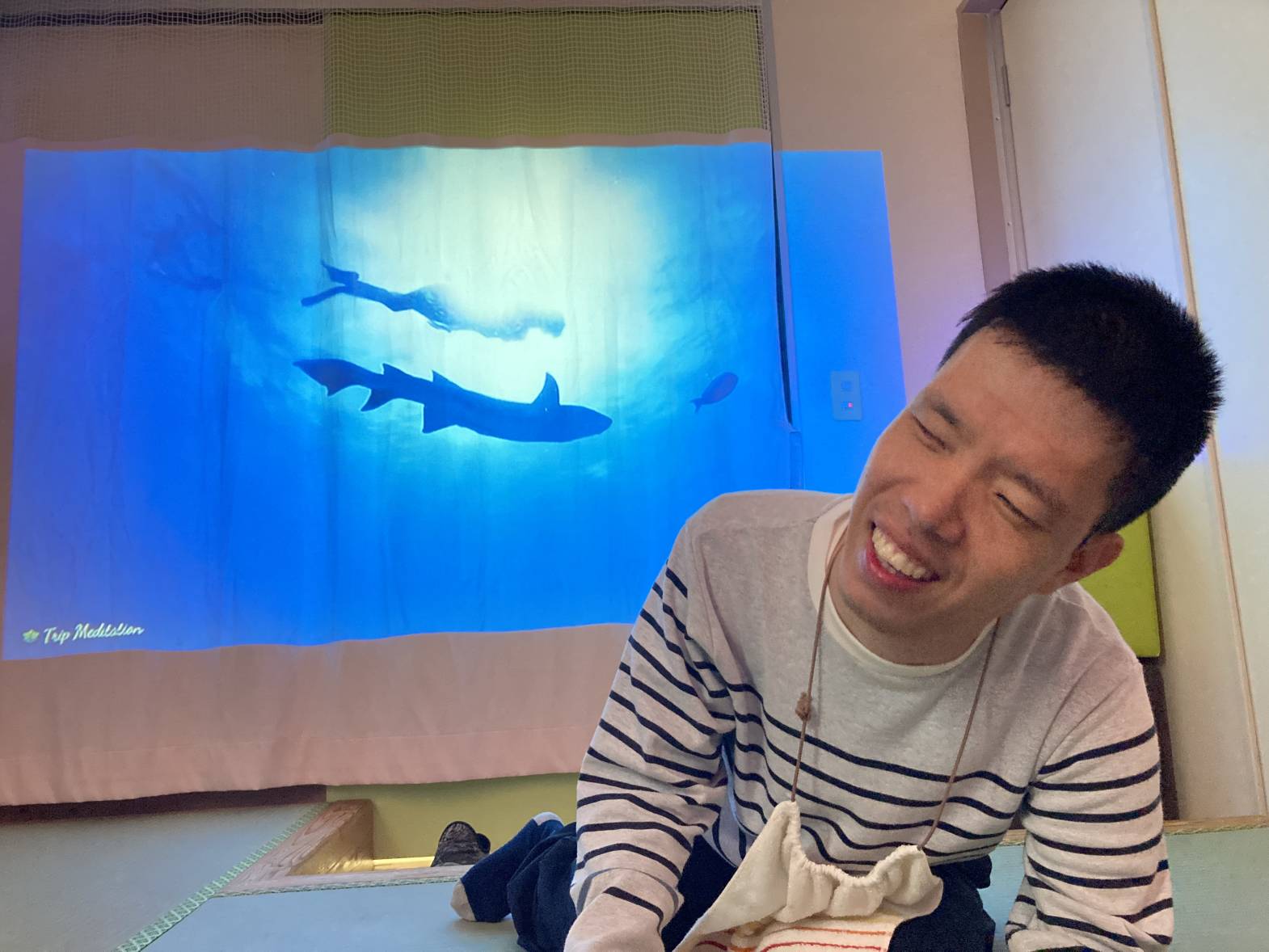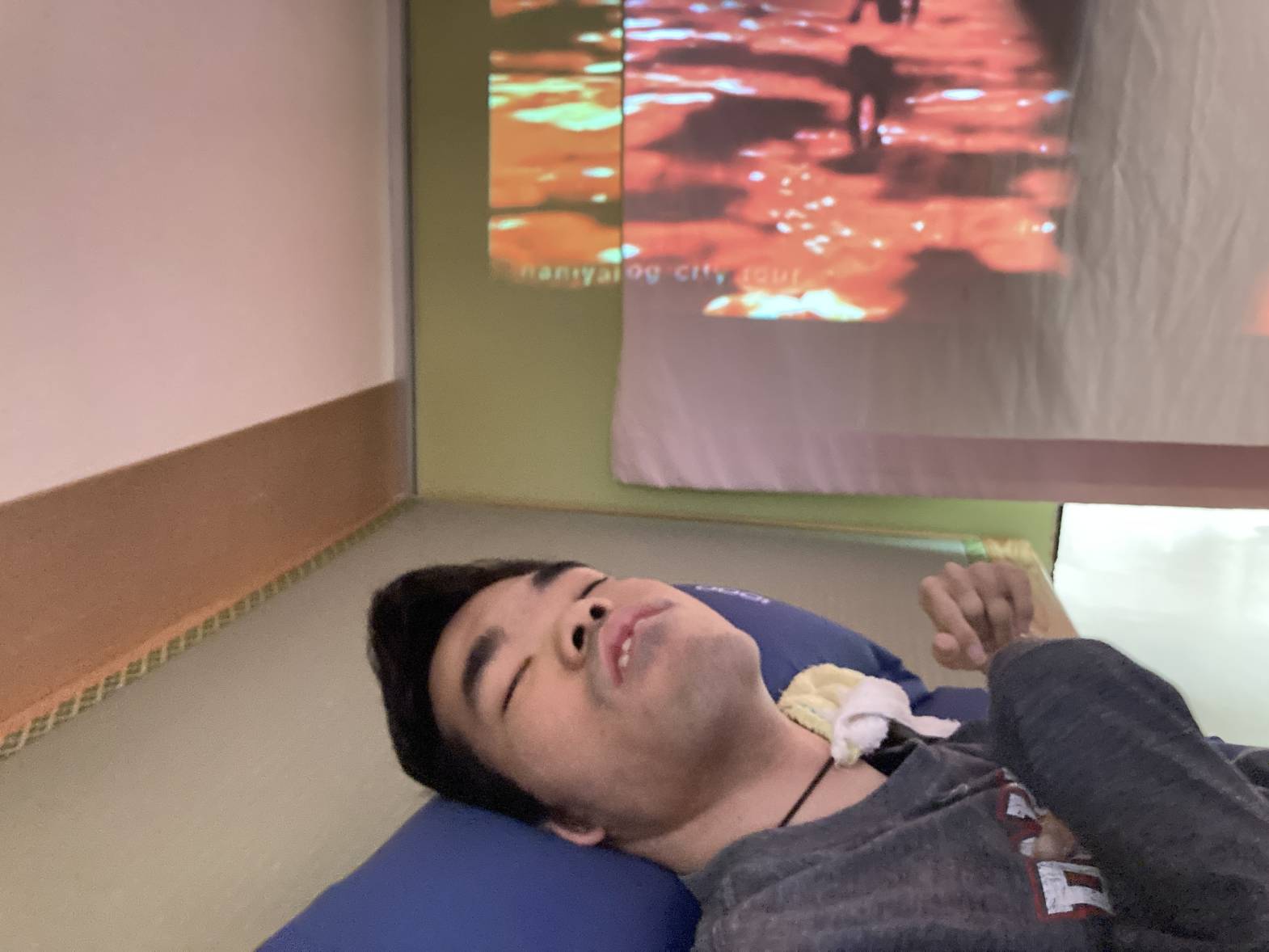 スヌーズレン活動を行いました。 アロマを焚き、プロジェクターで癒しの動画を流しながら、 幻想的な雰囲気の中でゆったりとくつろぎました。 夜景やイルミネーション 海の映像などを流し、皆さん水の音などにも癒されながら、 リラックスして過ごされていたようです。 これから寒くなって体もこわばりがちになってくるので、リラックスした時間を 取り入れていきましょう☆