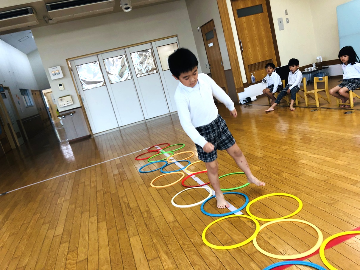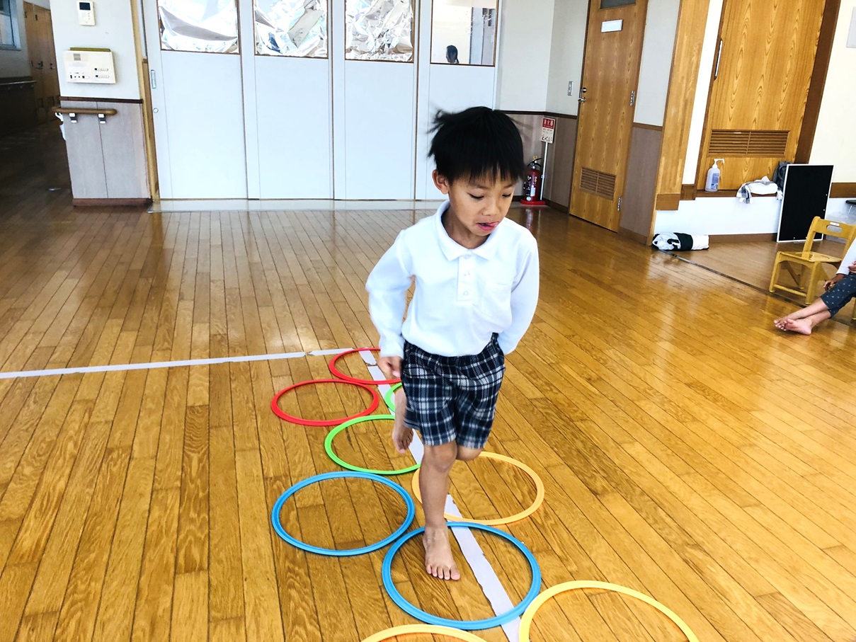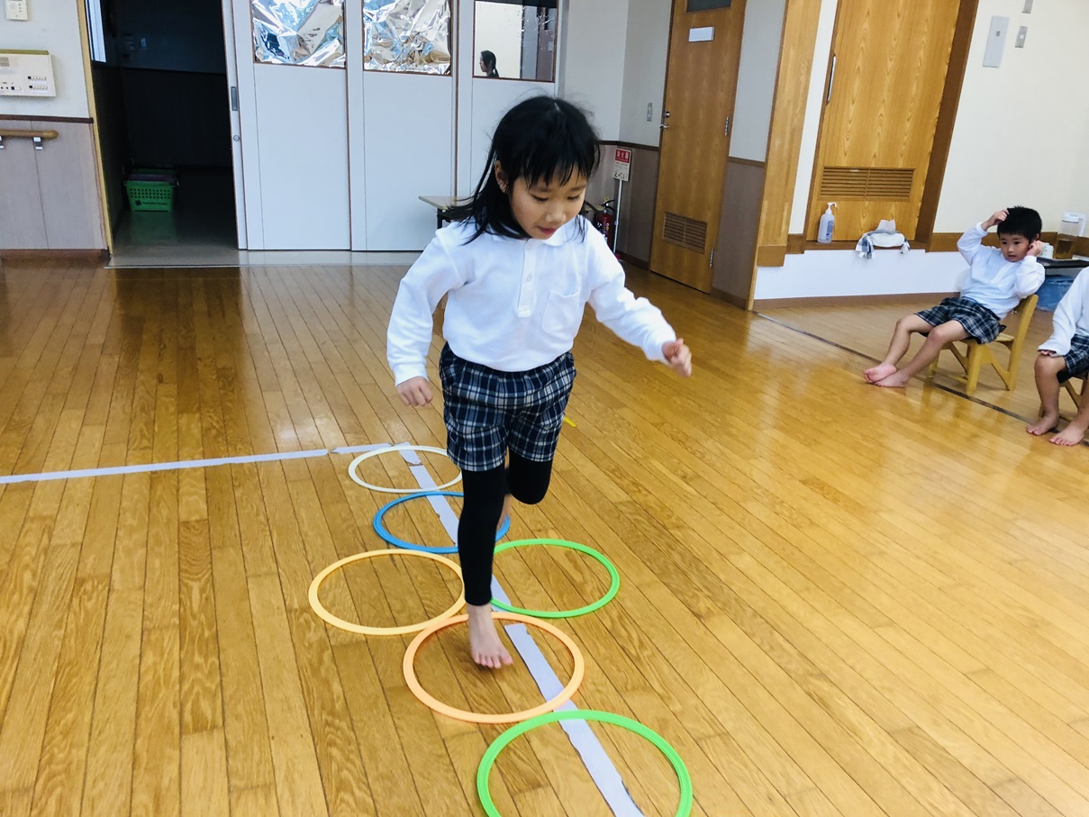 まずはケンケンパの練習です。リズムよく跳ぶことができるよう意識して跳びます。