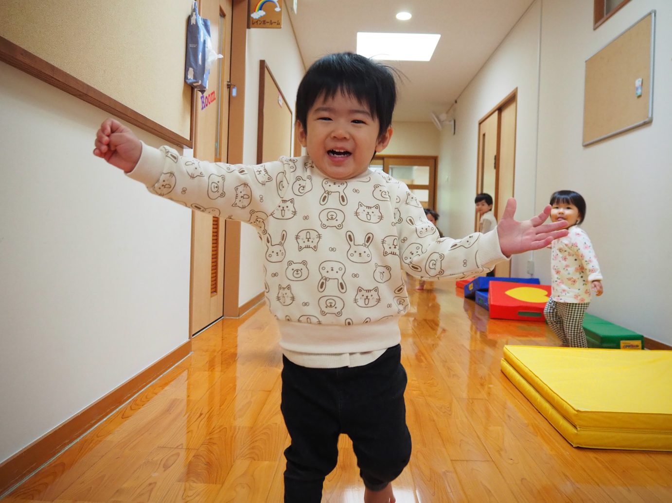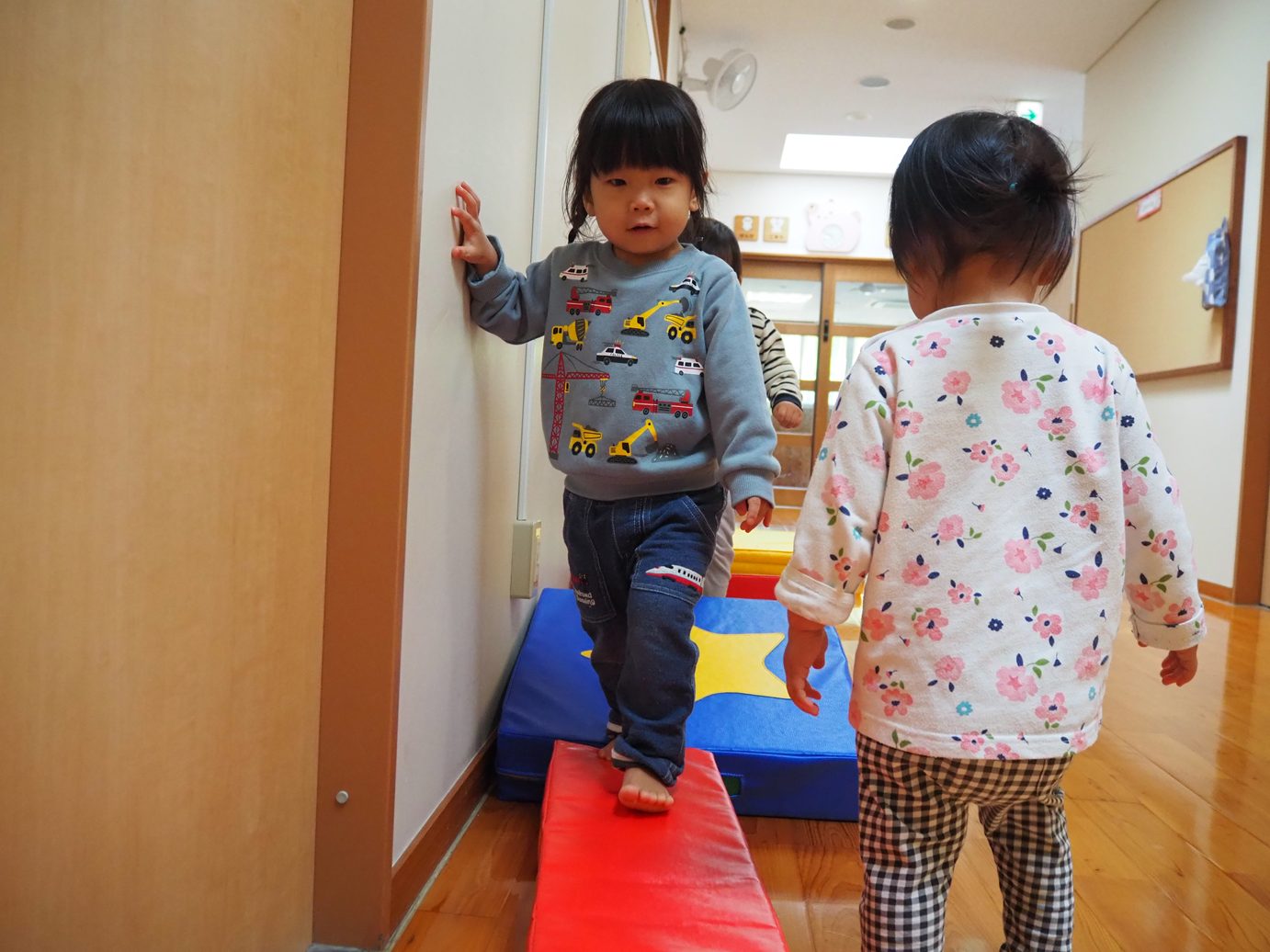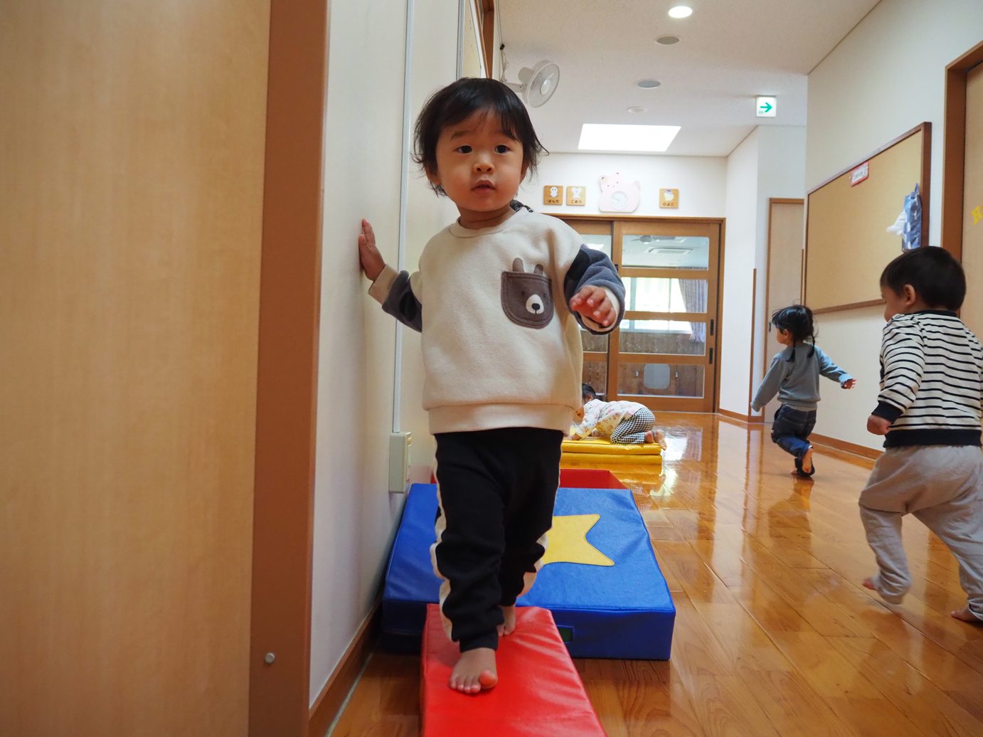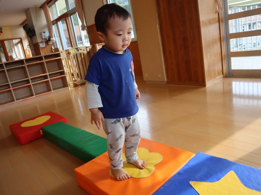 体を動かすことが大好きなこあら組さん。バランスを取りながら歩くことに夢中です。大きなマットから細いマットまで壁をつたいながら歩くことができるようになってきました。