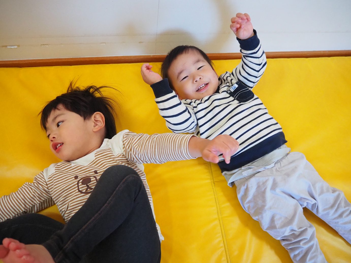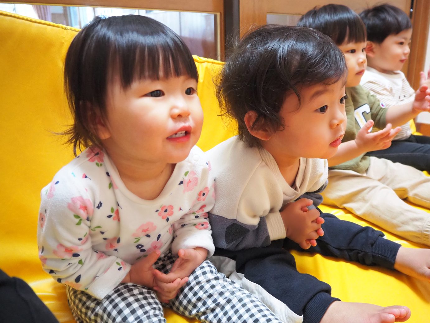マットを椅子に見立ててみるとみんなで座り、走っている友だちを「がんば~れ!」と応援したり、交代交代で走ったりと楽しむこあら組さん。