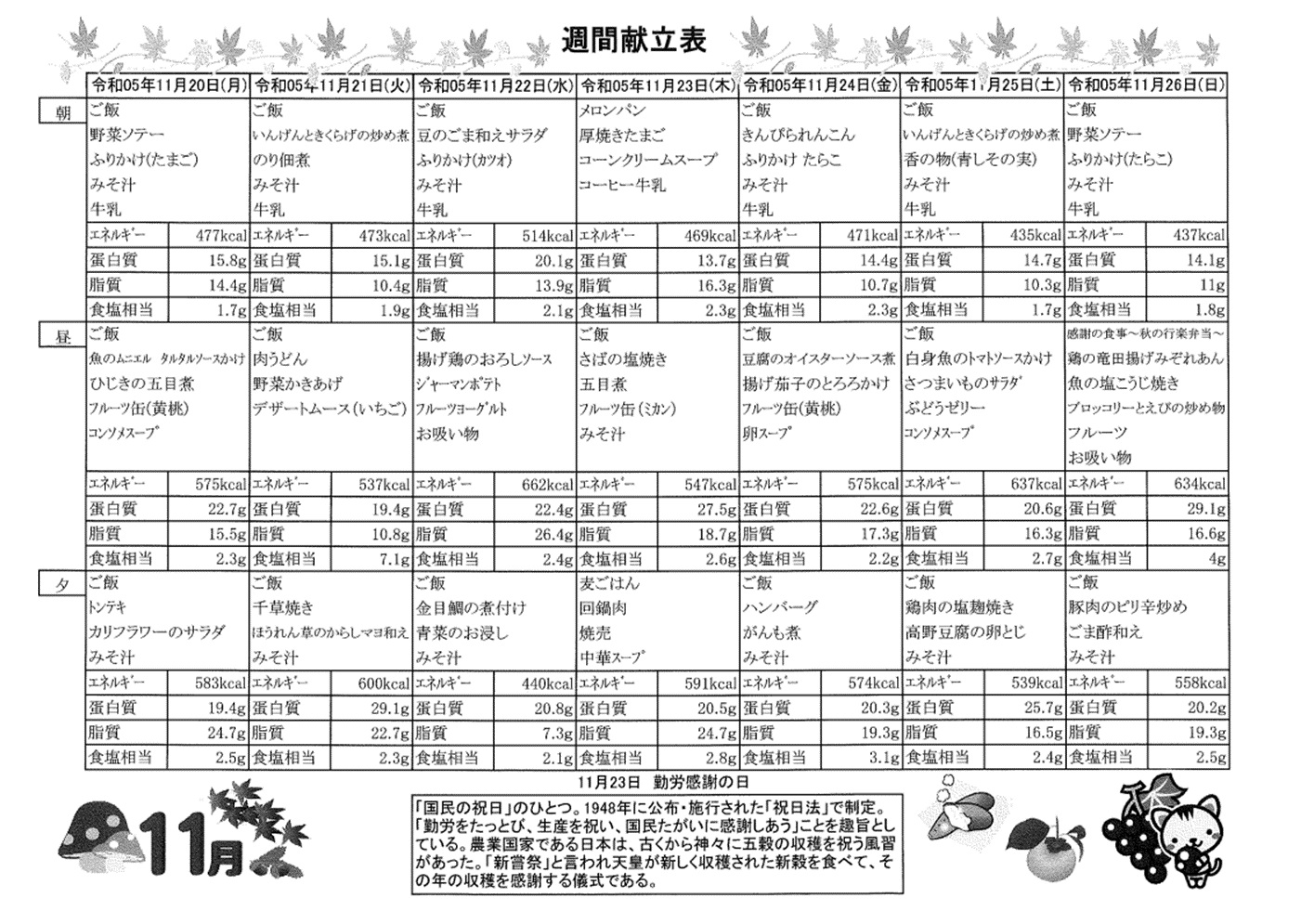 11月20日(月)~11月26日(日)の献立表になります。ぜひご覧ください。
