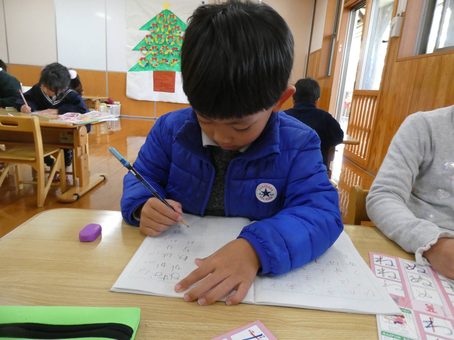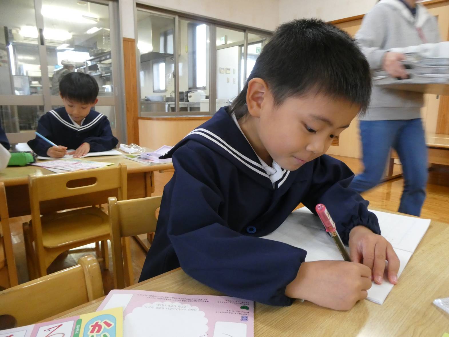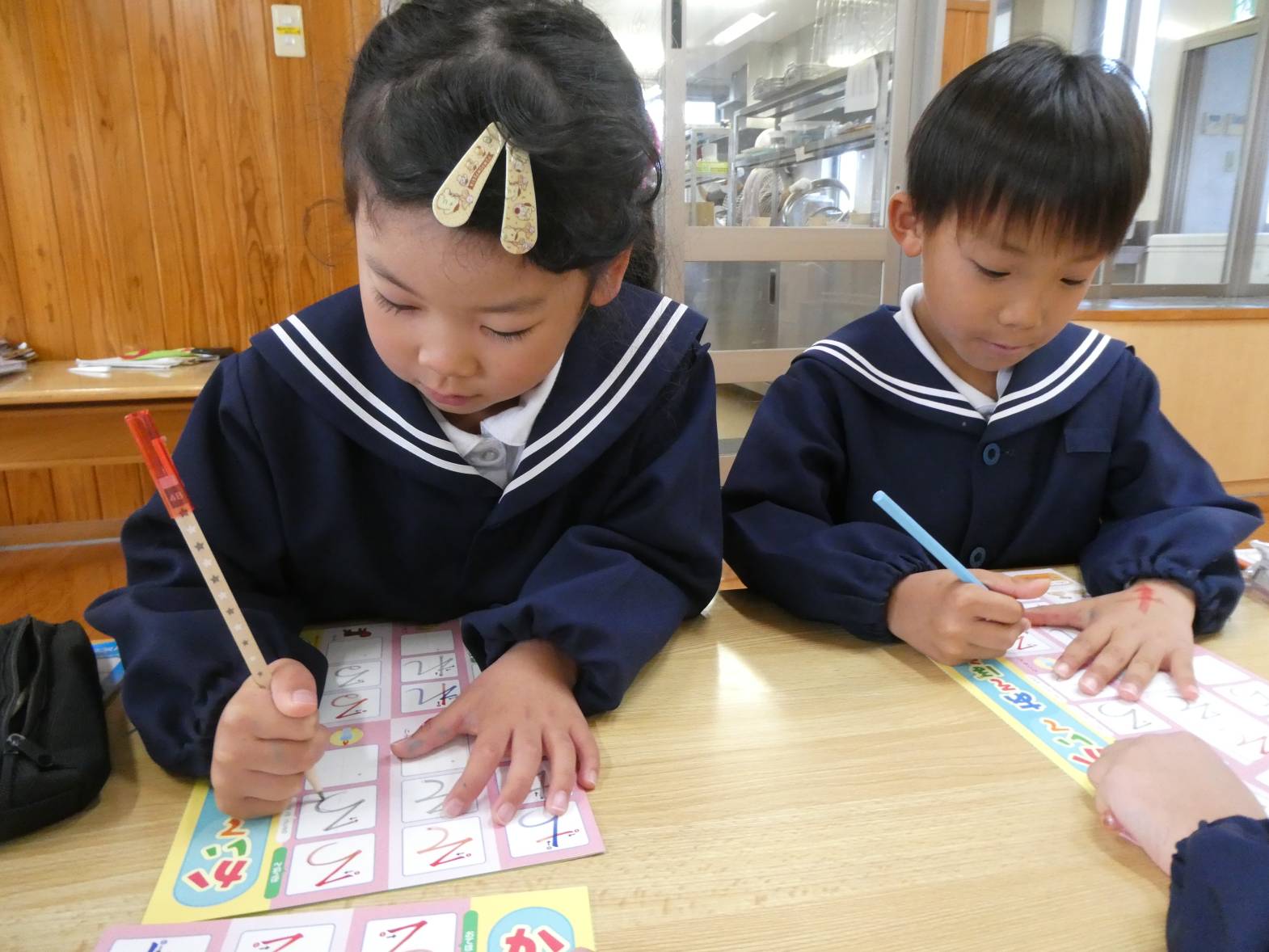 文字遊びでは、ノートに平仮名や数字の書く練習を一生懸命頑張っている子どもたち! 「自分の名前が書けるようになったから次はお父さん、お母さんの名前を書く練習をしようかな!」、「僕は動物の名前を書けるようになる。」と、自分自身で文字遊びに取り組む様子があります。 また、月間絵本に付いている、付録も積極的に活用して文字の練習に励んでいます。 「小学校に行ったら、完璧に平仮名を書けるようになるぞ!」、「カタカナの練習もしようね。」と、文字遊びを楽しみながら、意欲的に取り組むきりん組さんでした。