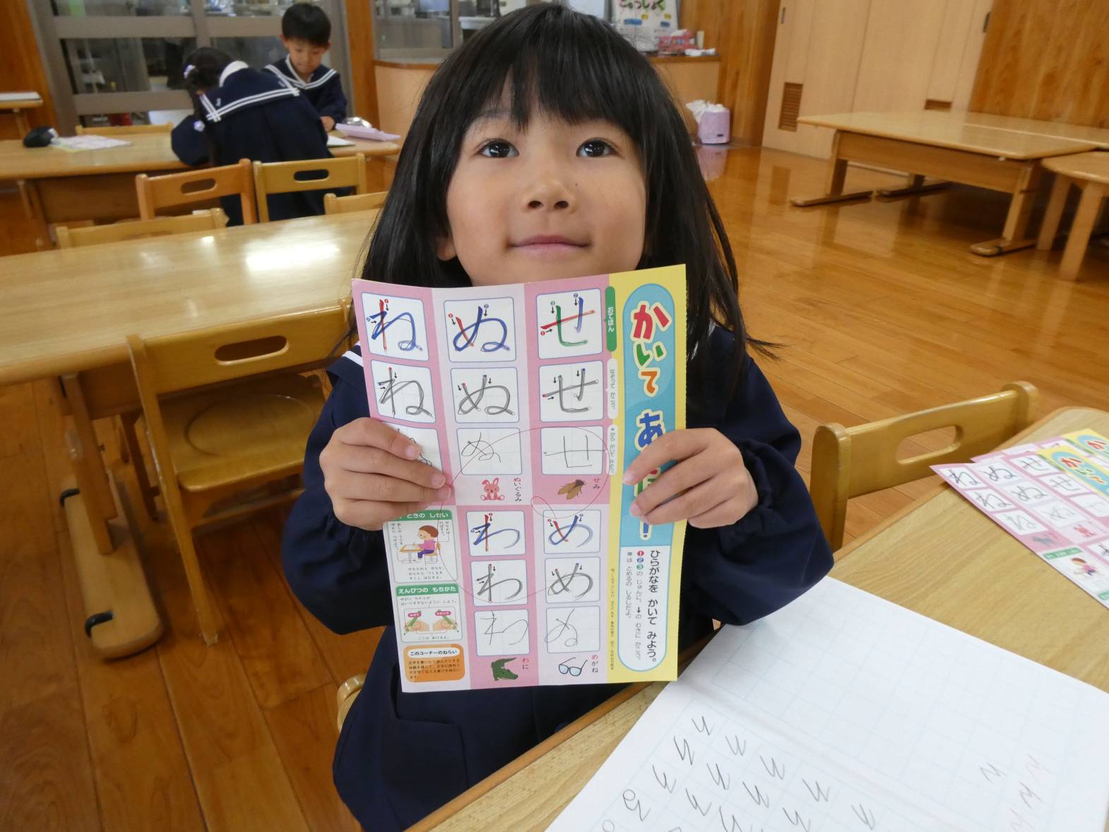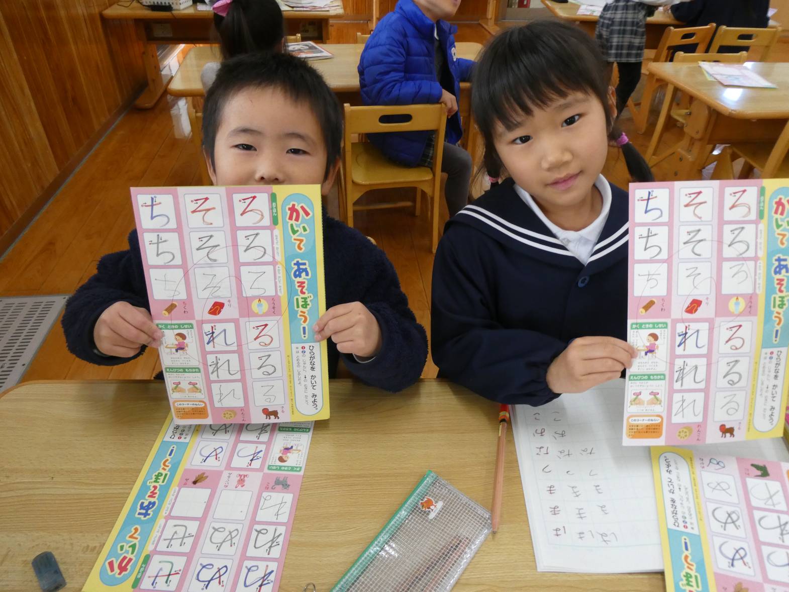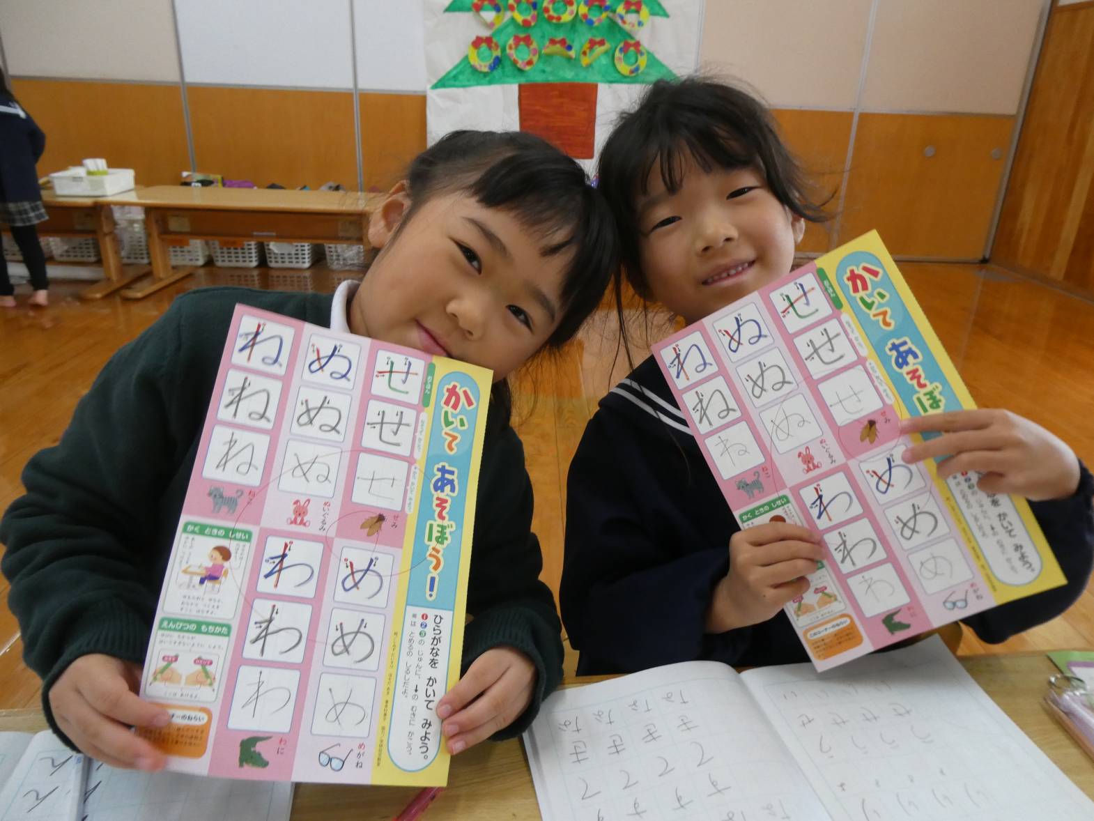 文字遊びでは、ノートに平仮名や数字の書く練習を一生懸命頑張っている子どもたち! 「自分の名前が書けるようになったから次はお父さん、お母さんの名前を書く練習をしようかな!」、「僕は動物の名前を書けるようになる。」と、自分自身で文字遊びに取り組む様子があります。 また、月間絵本に付いている、付録も積極的に活用して文字の練習に励んでいます。 「小学校に行ったら、完璧に平仮名を書けるようになるぞ!」、「カタカナの練習もしようね。」と、文字遊びを楽しみながら、意欲的に取り組むきりん組さんでした。