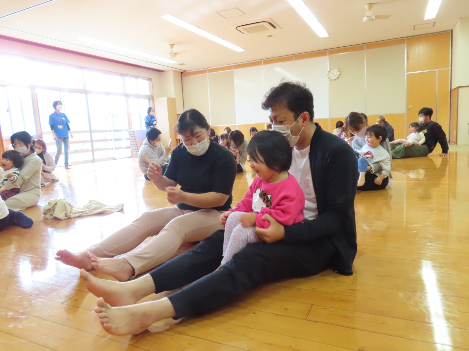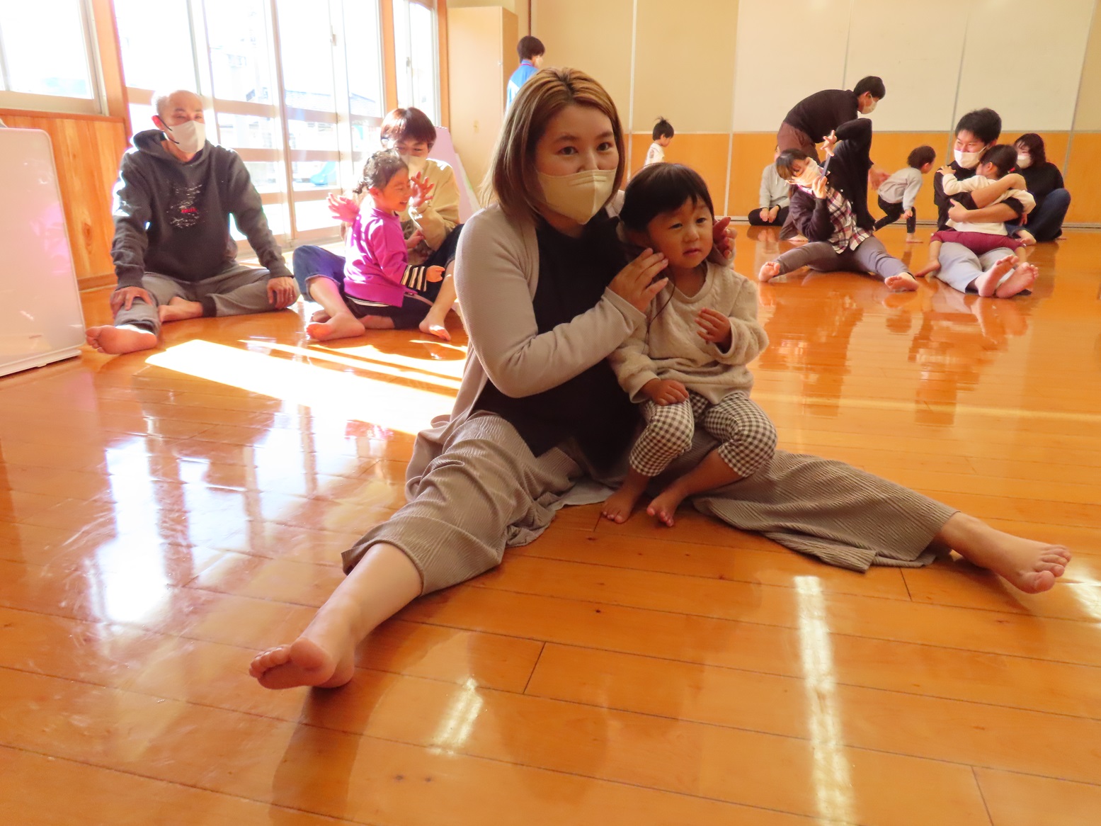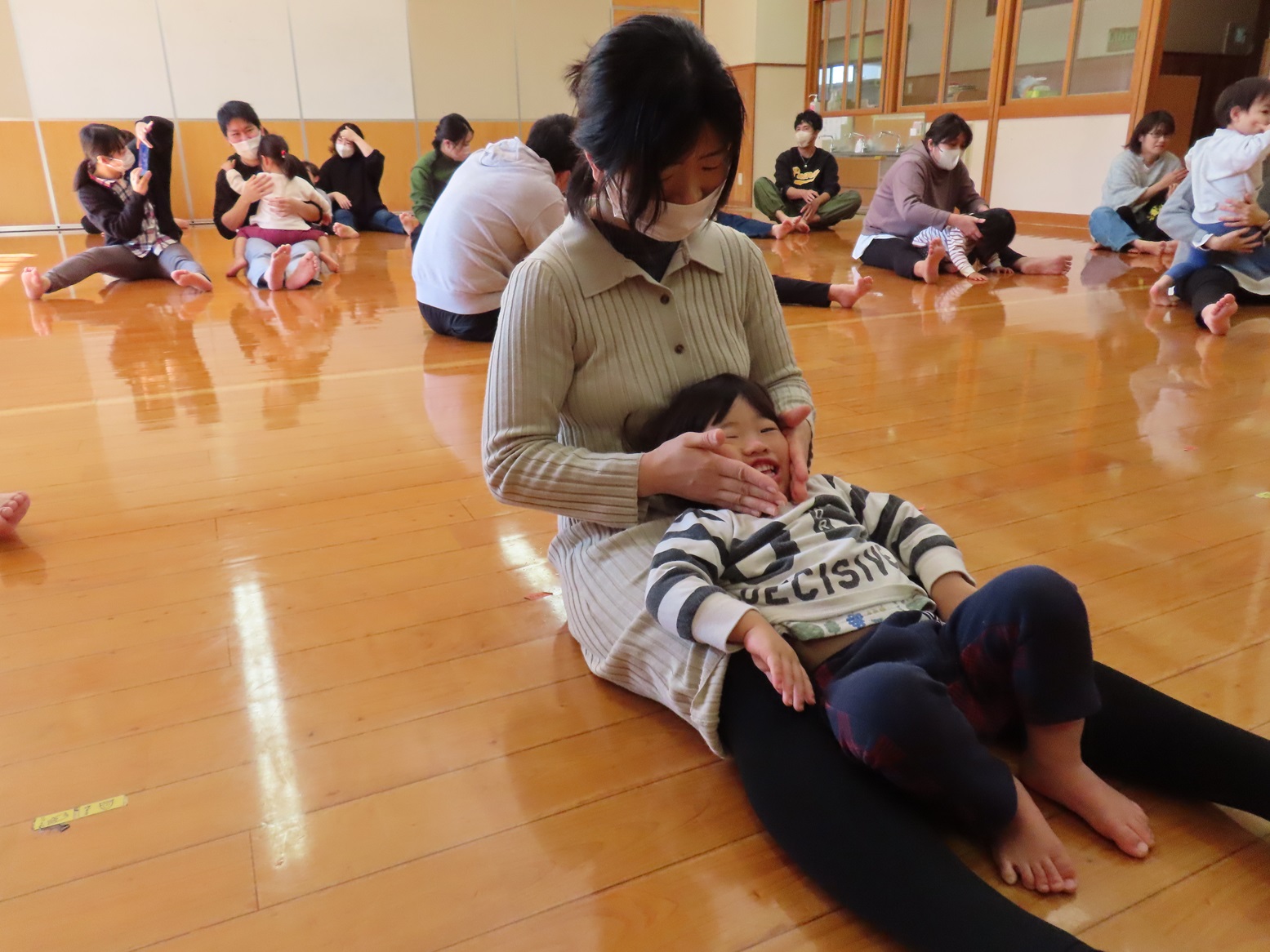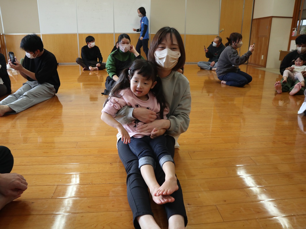 最初は緊張した様子でしたが、親子でスキンシップを取ったり、音楽に合わせて体操をしたりする中で徐々に笑顔が見られました。