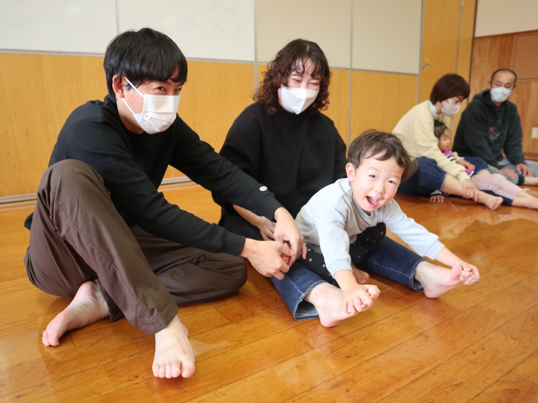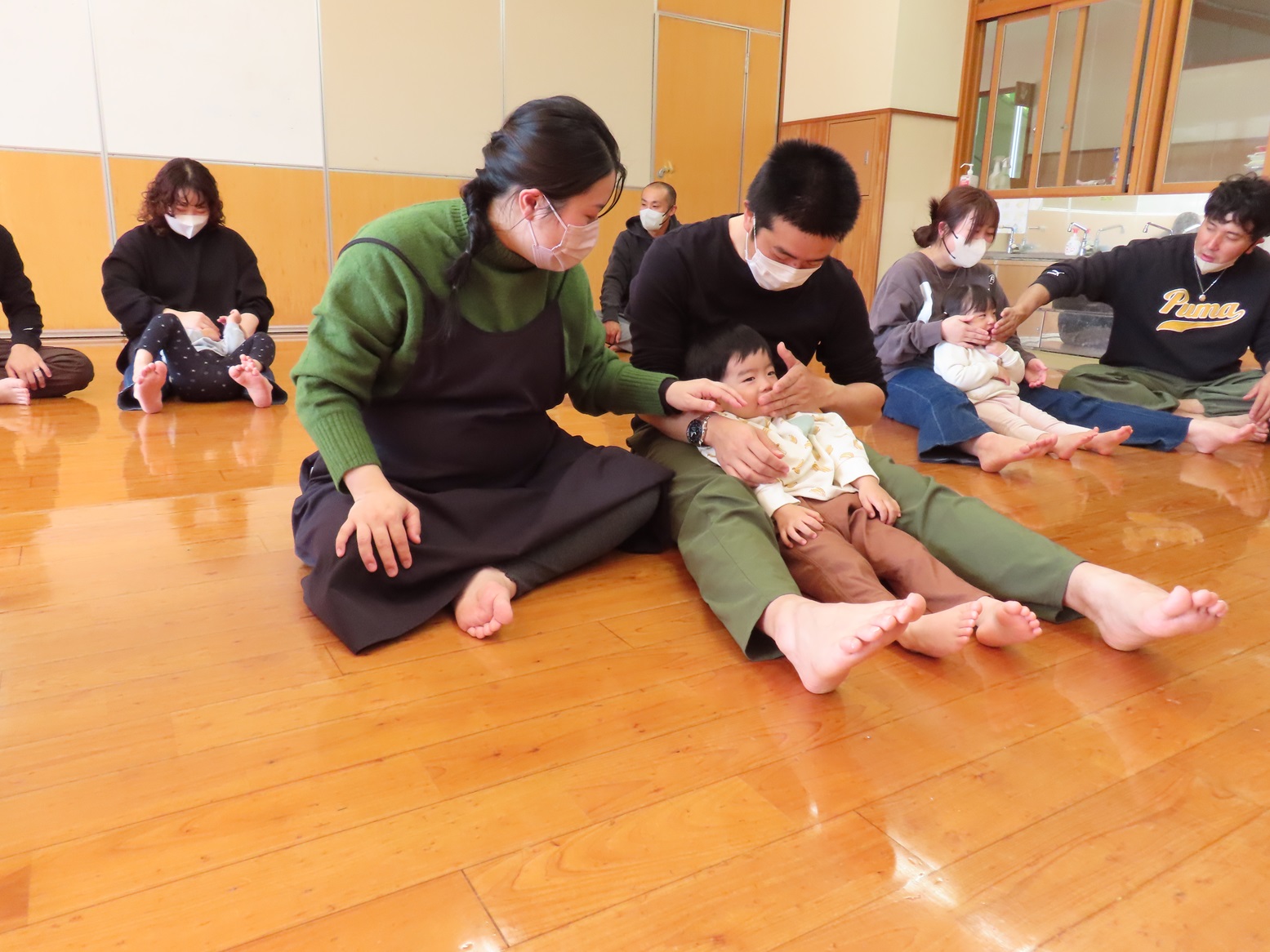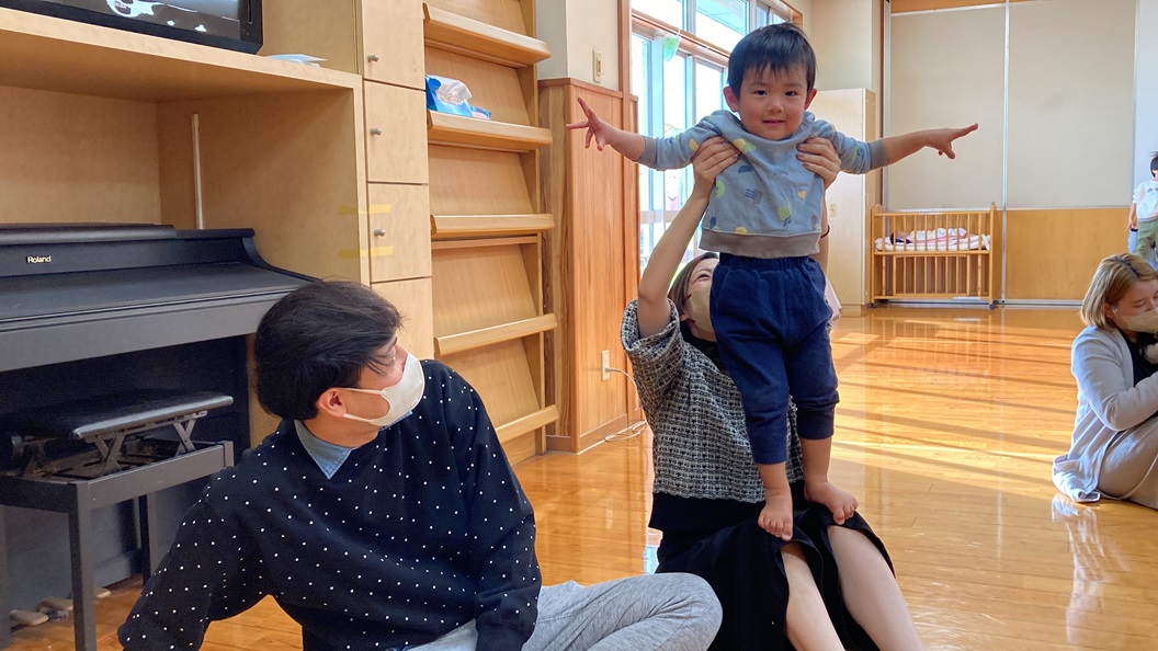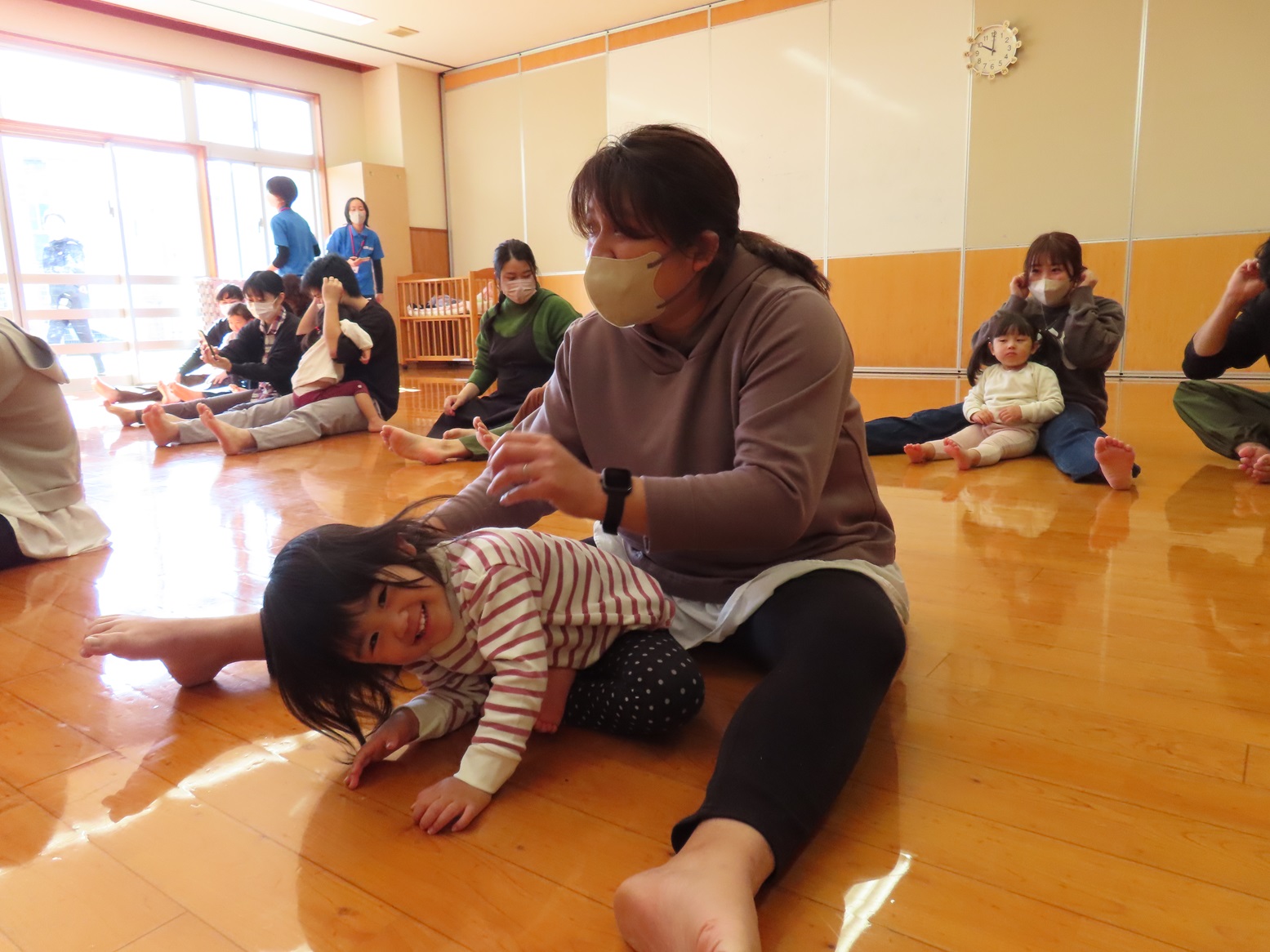 最初は緊張した様子でしたが、親子でスキンシップを取ったり、音楽に合わせて体操をしたりする中で徐々に笑顔が見られました。