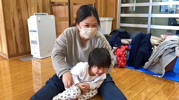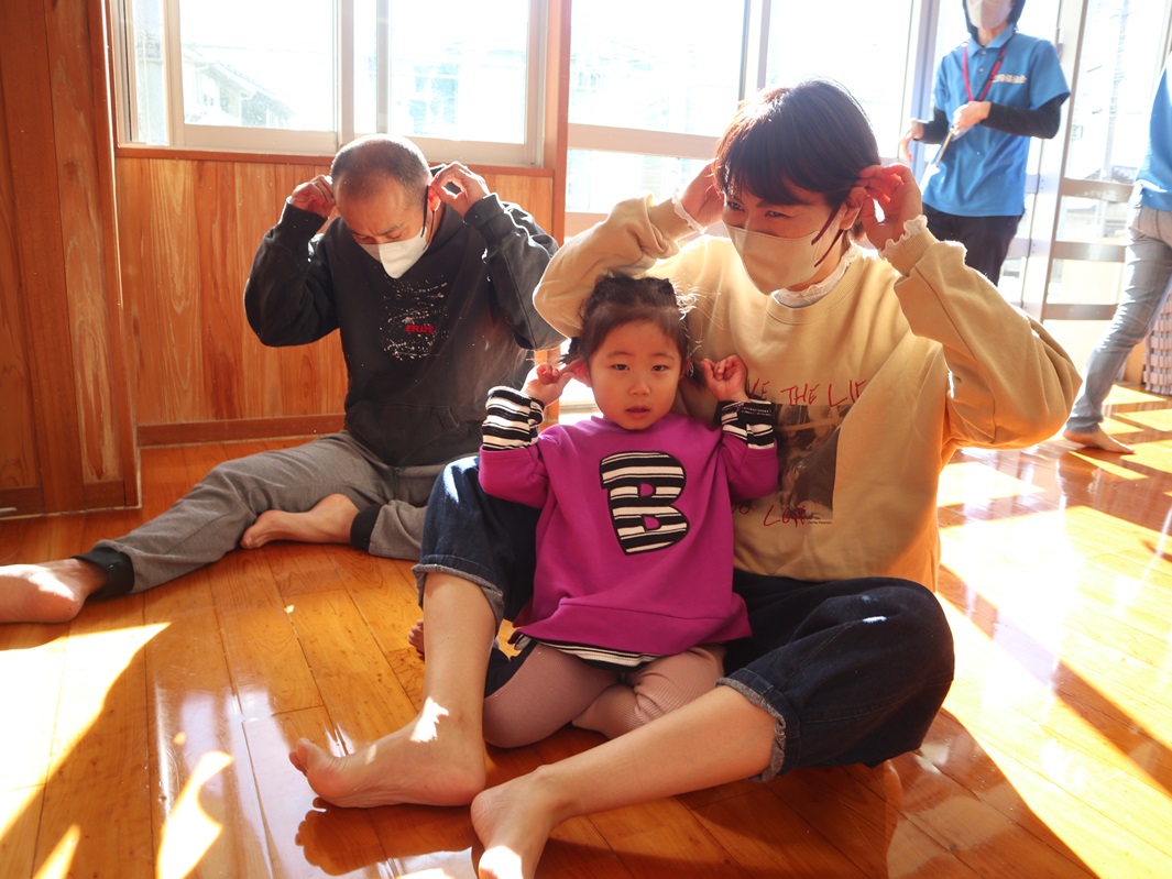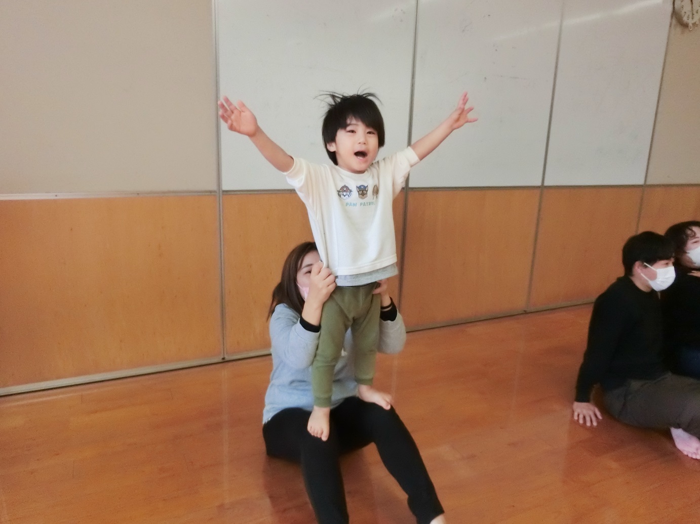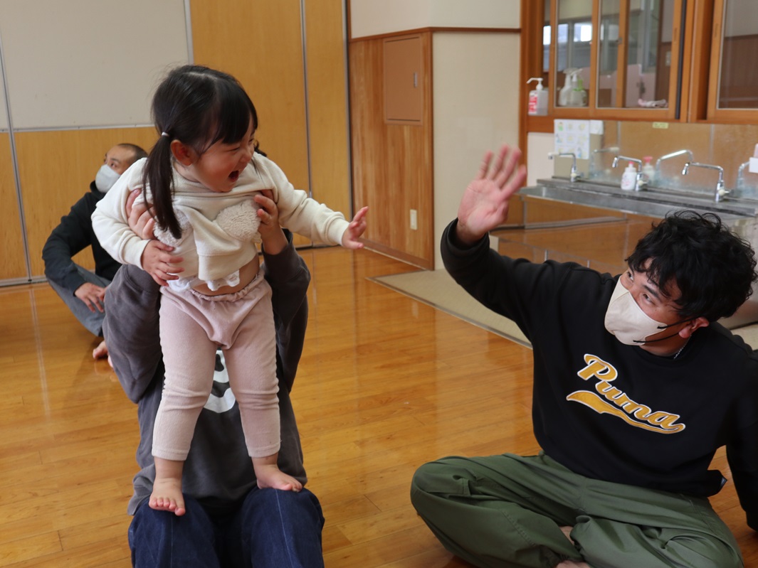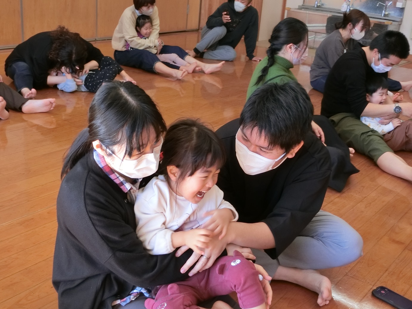 最初は緊張した様子でしたが、親子でスキンシップを取ったり、音楽に合わせて体操をしたりする中で徐々に笑顔が見られました。