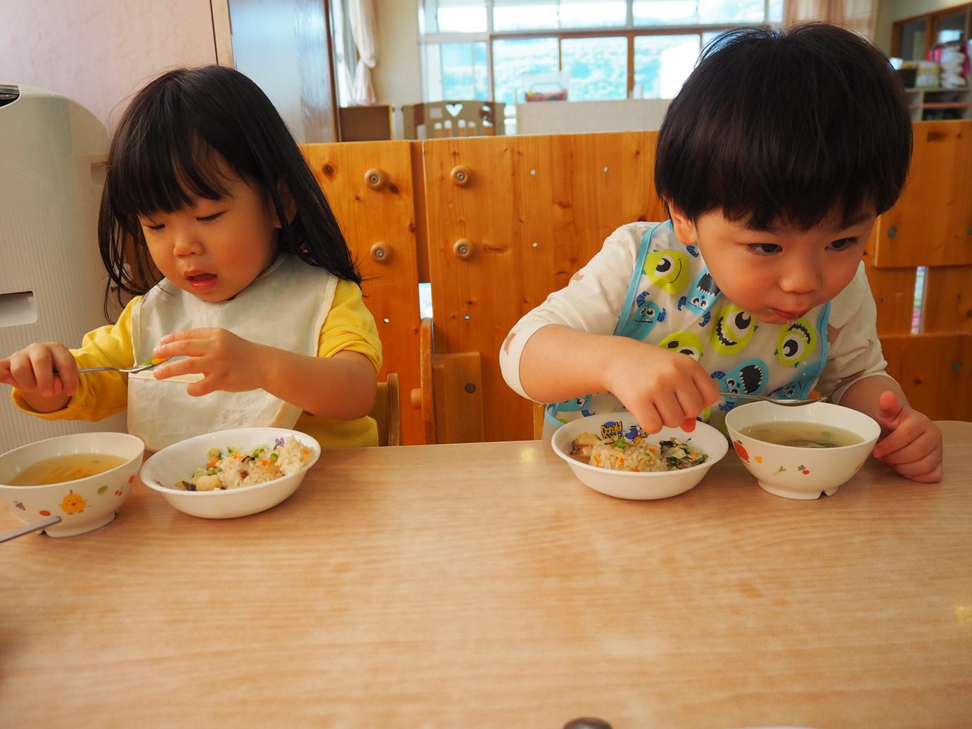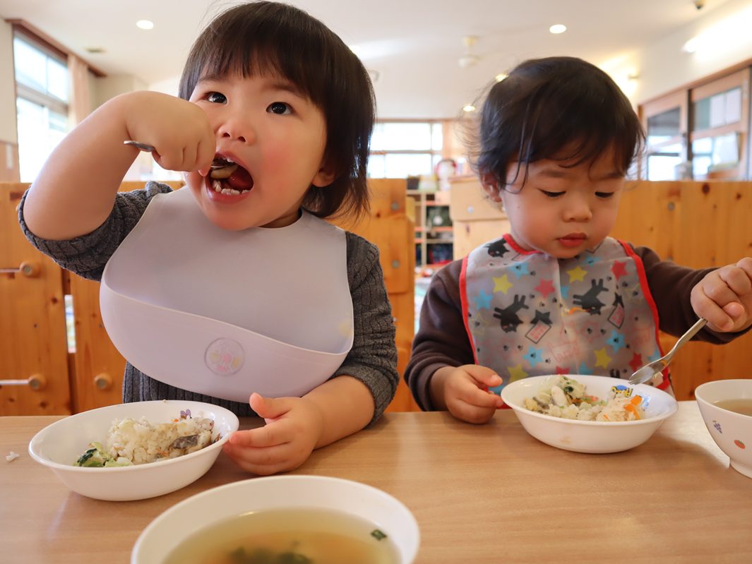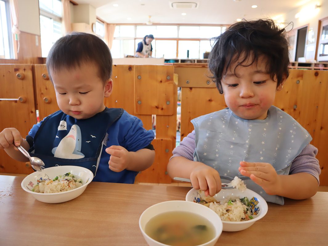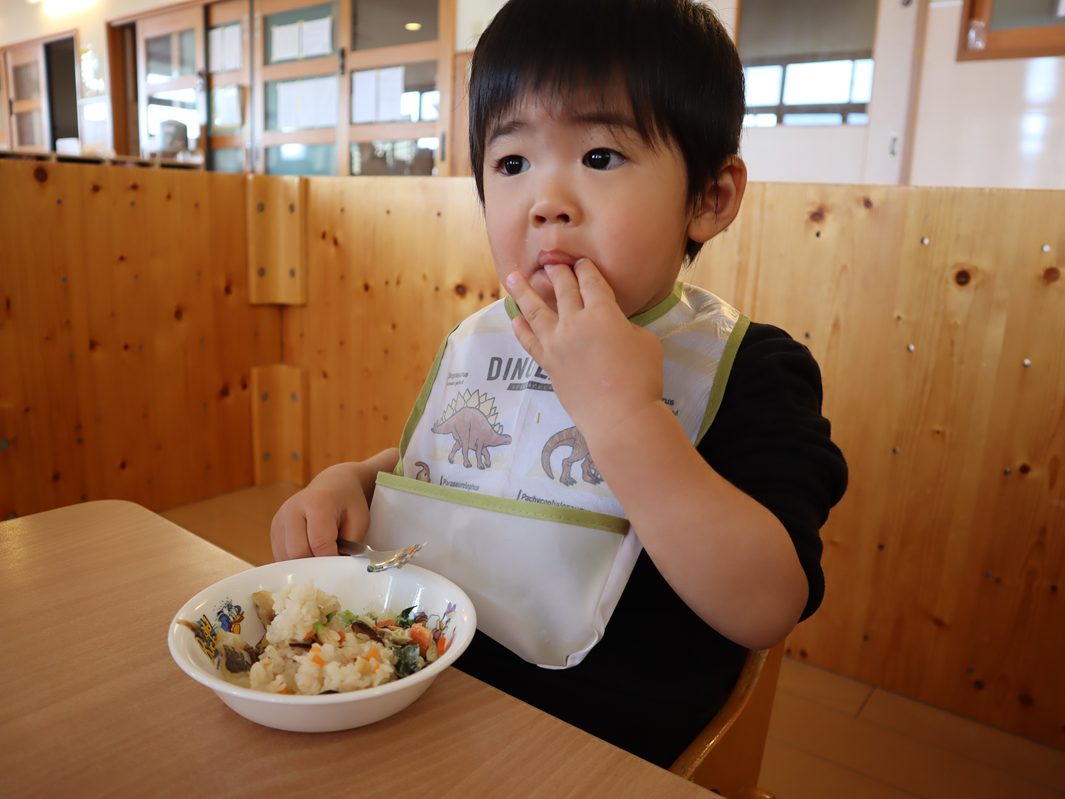 今日はわくわくメニューの日でした。 今回はきのこの炊き込みご飯や、魚など秋の味覚満載のメニュー! 元気よく「いただきます。」を言うと、嬉しそうに食べ始める子どもたち。 友だちや保育者と「美味しいね~」「これ何だろう?」と会話をしながら楽しむ姿が見られました。 パクパク食べ進めあっという間に完食! ご家庭でも「今日のご飯どうだった~?」などと、感想を聞いてみて下さい。