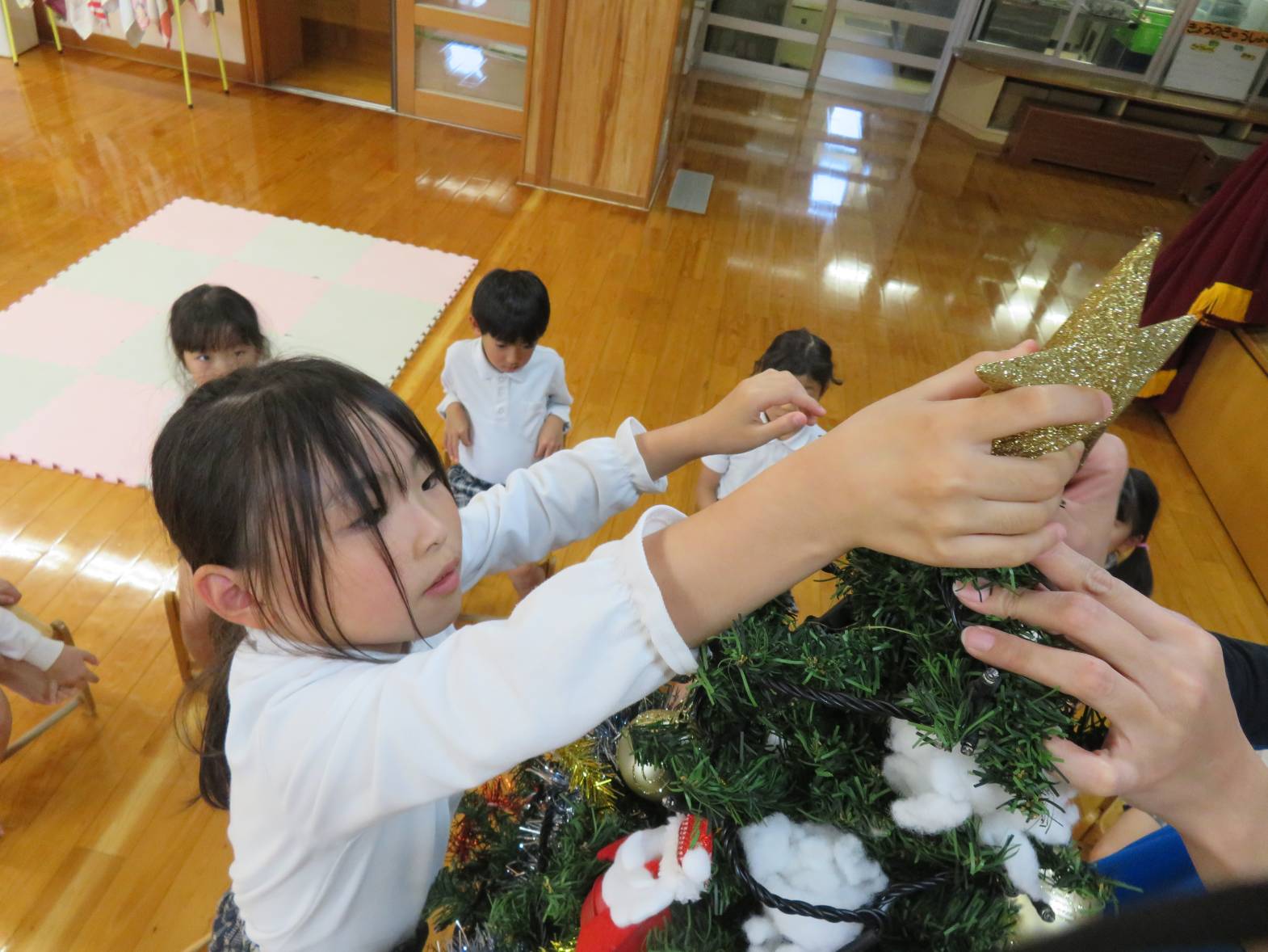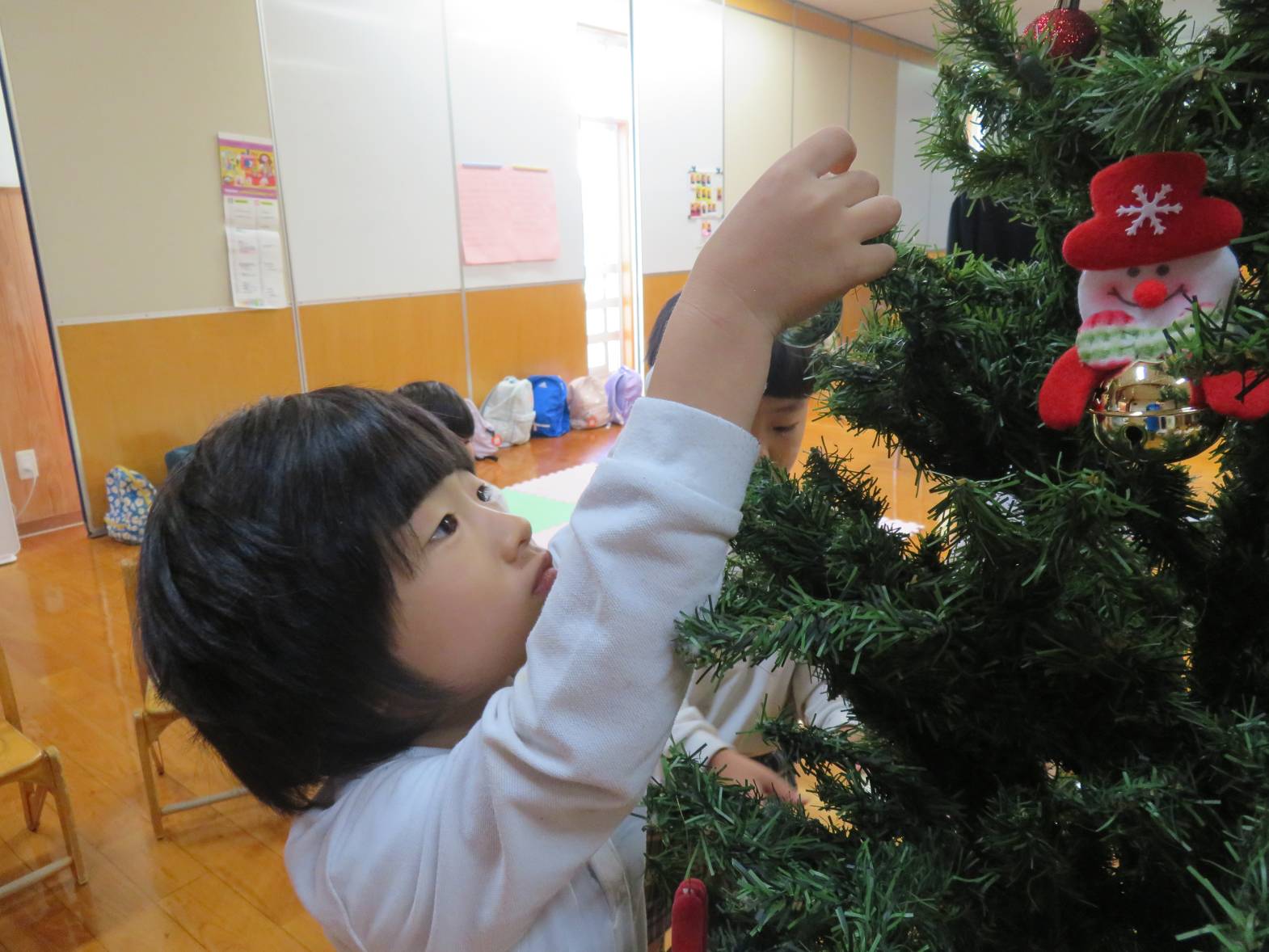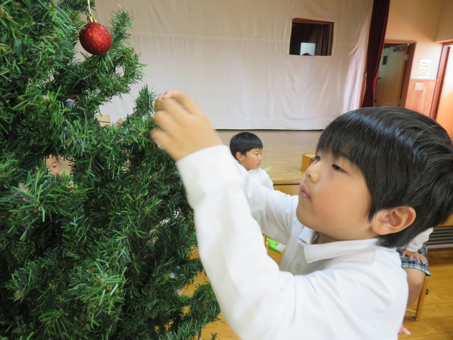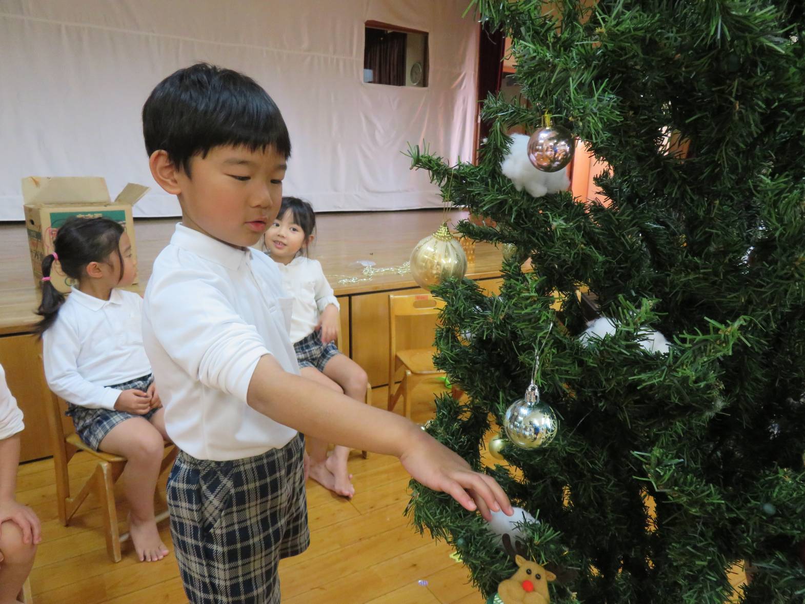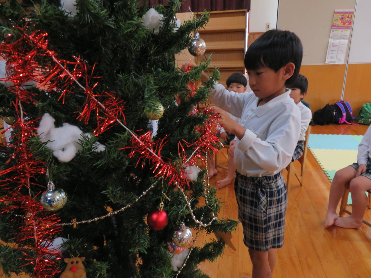 「これなんてどう?」「ここらへんあんまり飾りついてないから、ここにしたらいいんじゃない?」と友だちと話し合ったりアドバイスをもらったりしながらツリーを飾り付けていきます。