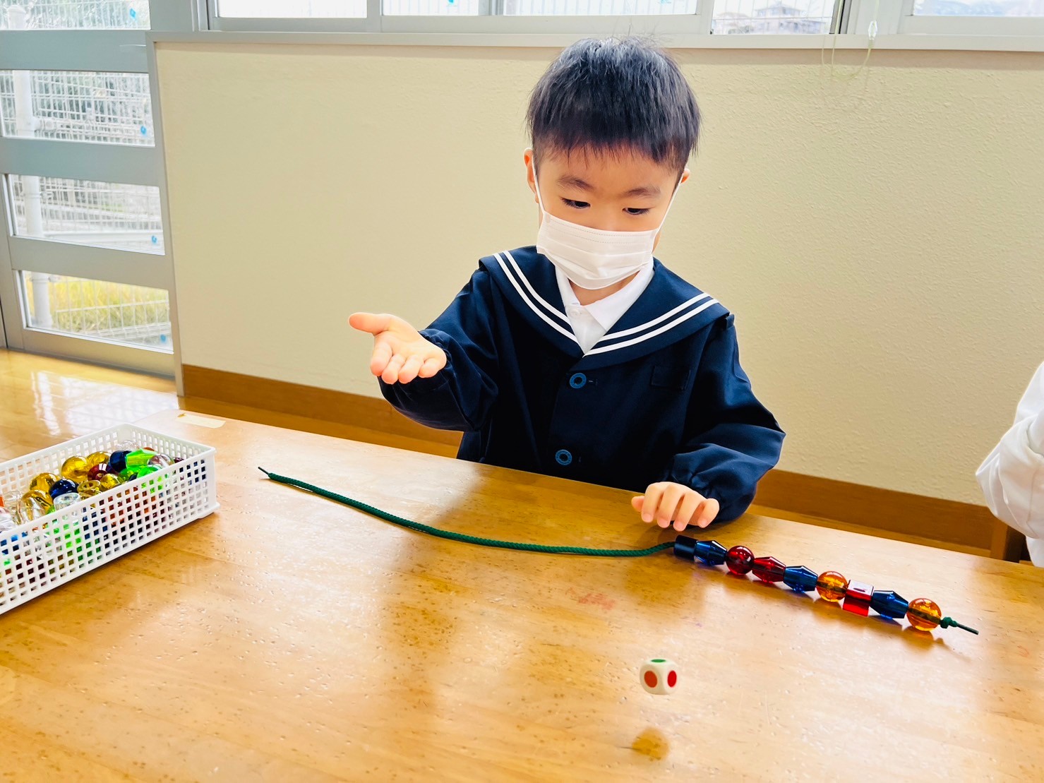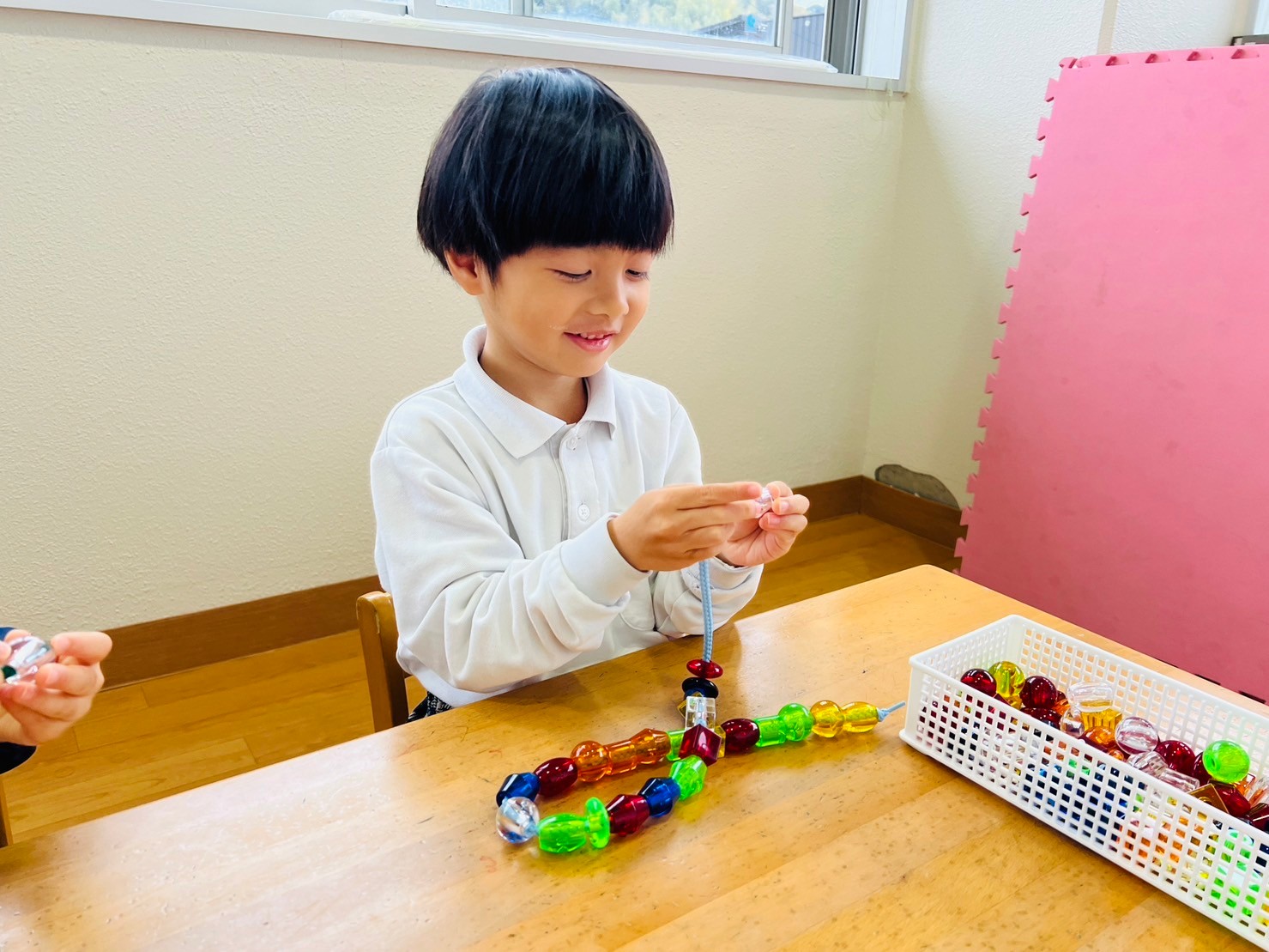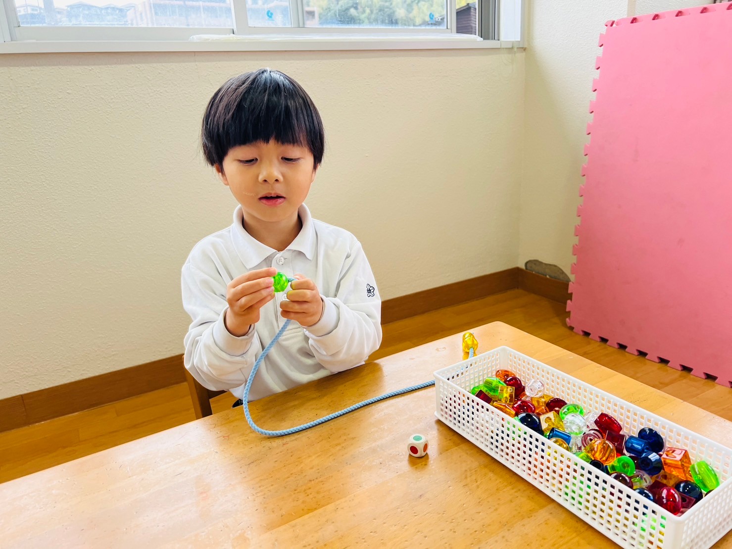 今回は、紐通しを行いました! 半透明なビーズに、「綺麗!」、「ツルツルしてる!」と興味津々な子どもたち♪ 好きな色を通したり、全ての色を使用し、一つひとつ紐に通したりする姿が見られました。 また、今回は色のサイコロを使用し、出た目と同じ色のビーズを通していく遊びも行いました! 「青、出てこい!」、「また赤か~!」と楽しみながら、取り組む姿が見られました☆
