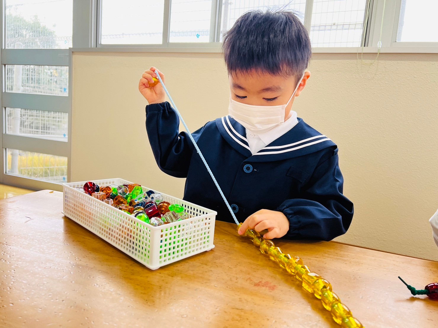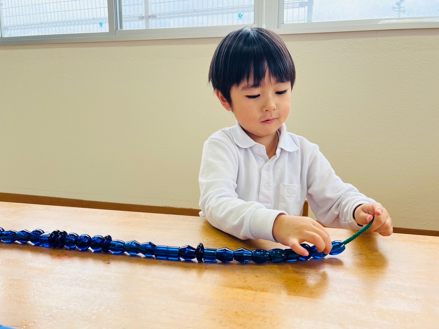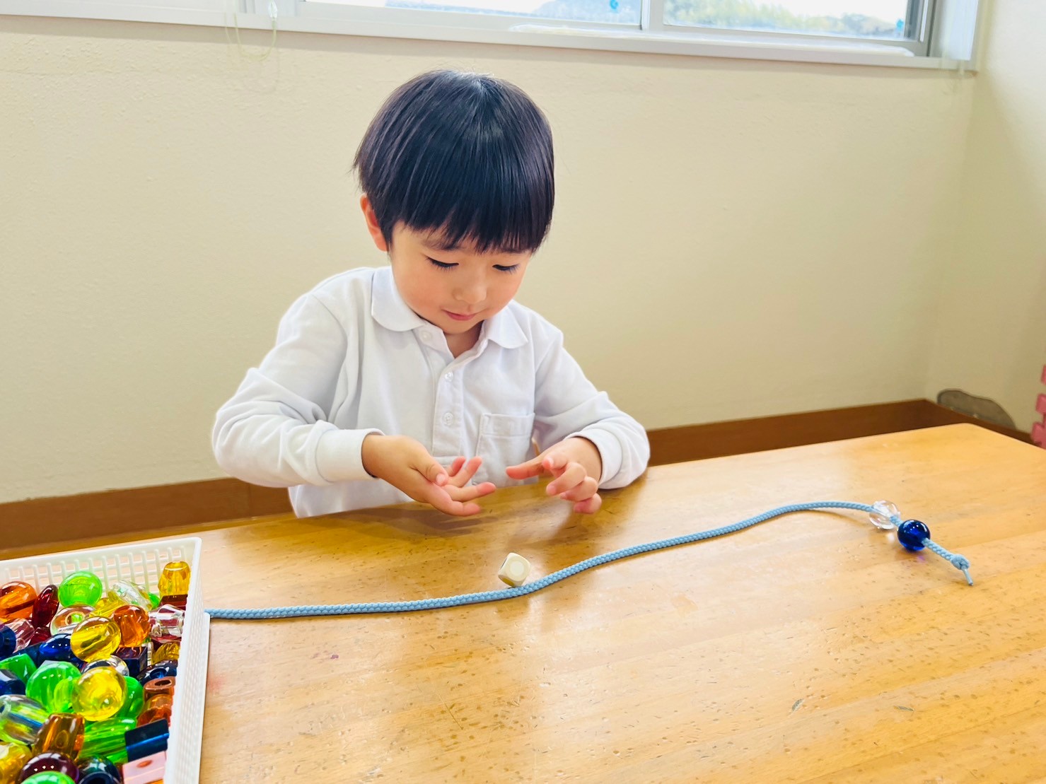 今回は、紐通しを行いました! 半透明なビーズに、「綺麗!」、「ツルツルしてる!」と興味津々な子どもたち♪ 好きな色を通したり、全ての色を使用し、一つひとつ紐に通したりする姿が見られました。 また、今回は色のサイコロを使用し、出た目と同じ色のビーズを通していく遊びも行いました! 「青、出てこい!」、「また赤か~!」と楽しみながら、取り組む姿が見られました☆