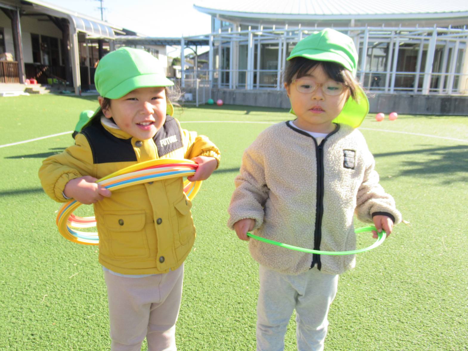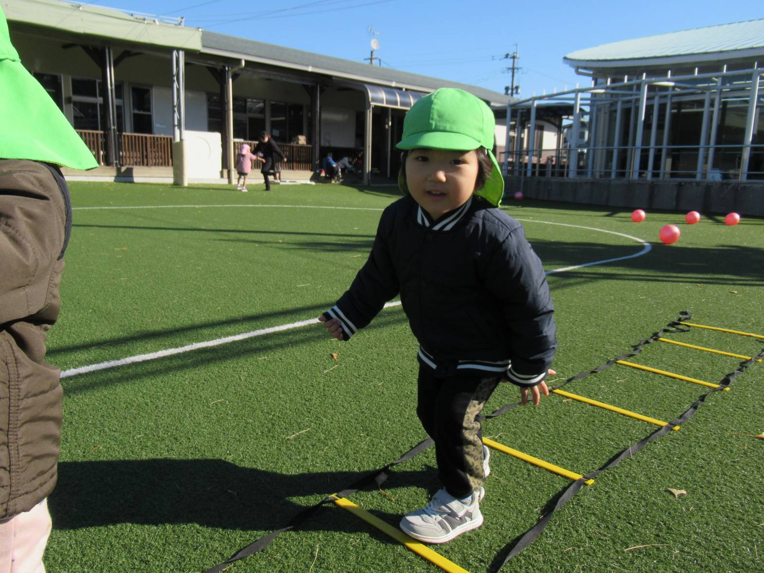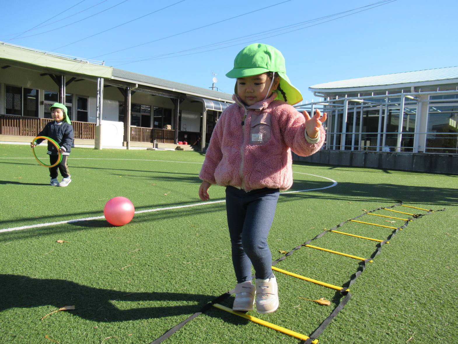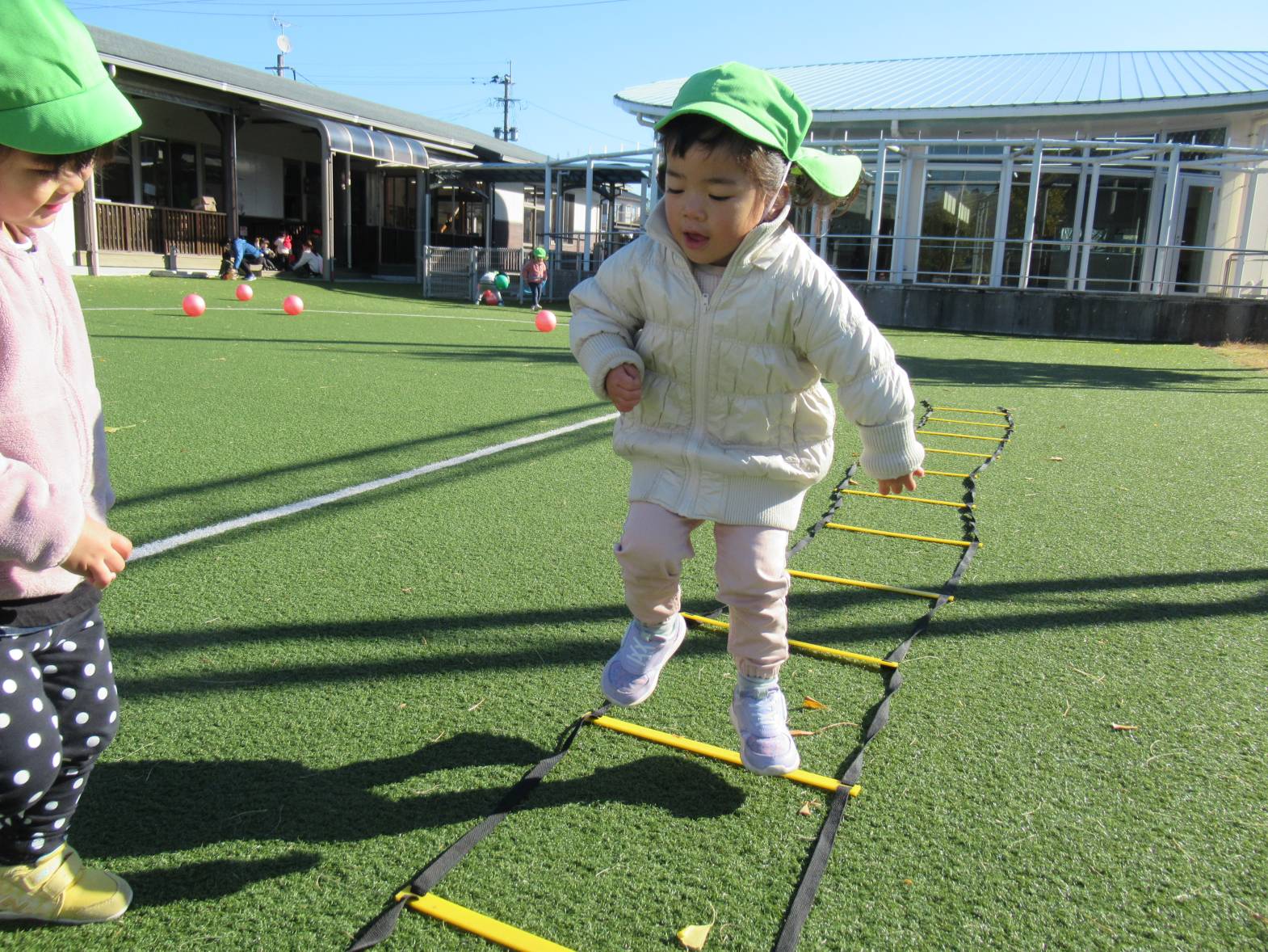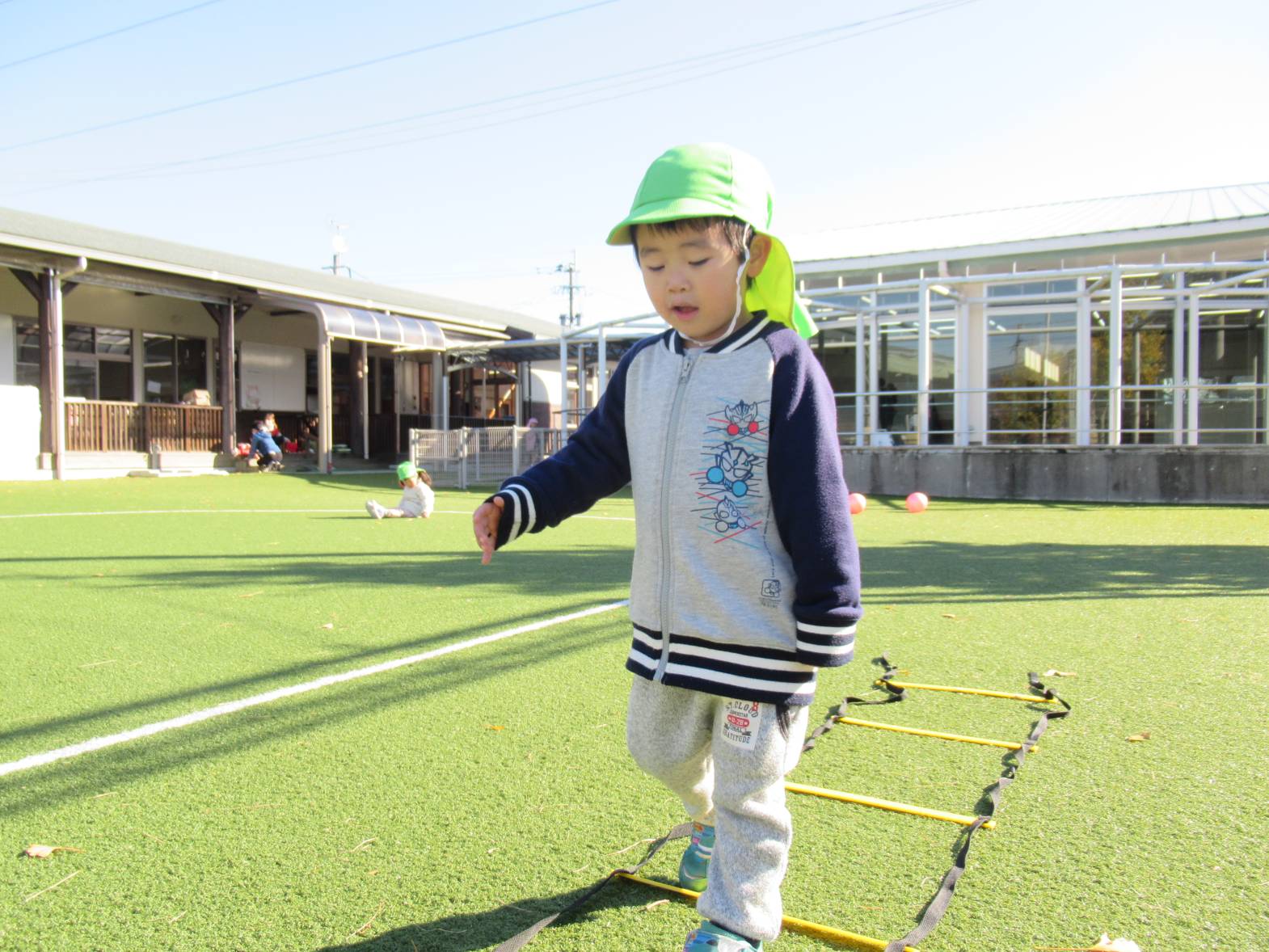 寒くなってきましたが戸外遊びが大好きな子どもたちはボールや輪っか、ラダー等、様々な道具を使いながら体をたくさん動かして遊んでいます。 「電車ごっこしよう!」、「ジャンプがたくさんできるよ!」と友だちや保育者と話をしながら楽しむ姿が見られます。 寒さに負けない体作りをしていきたいと思います。