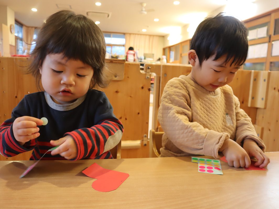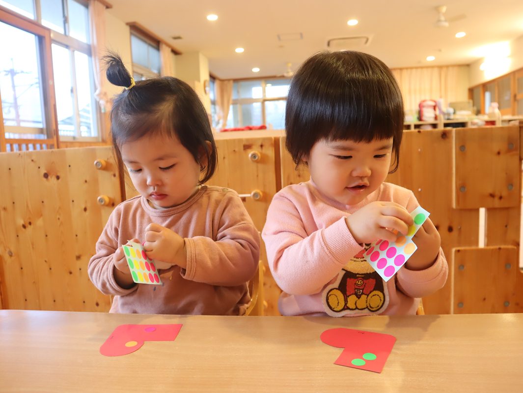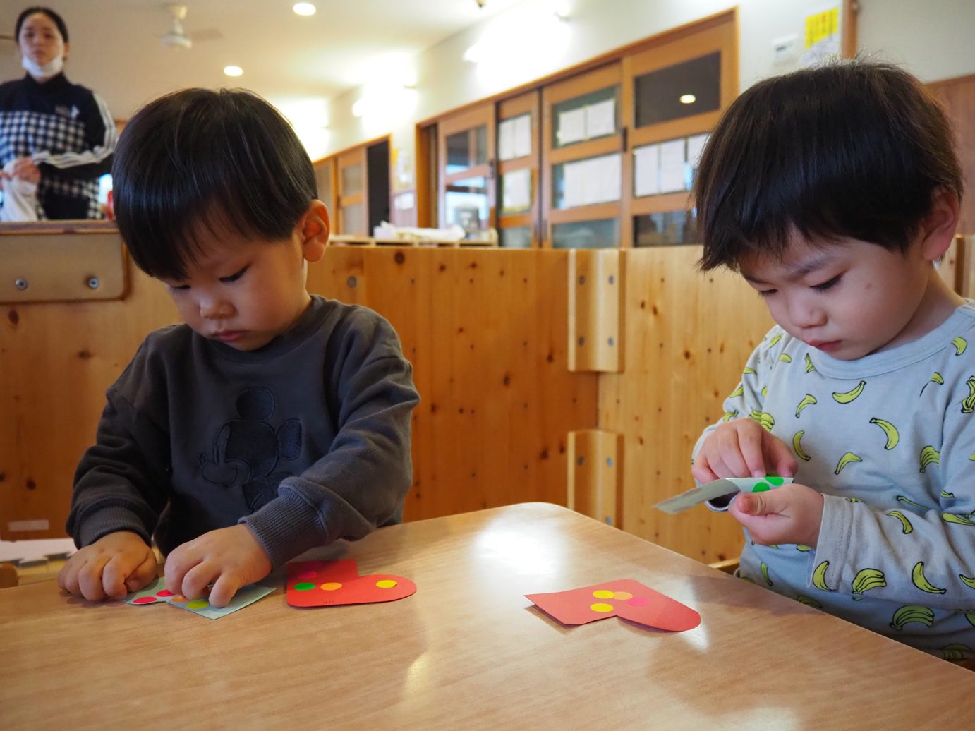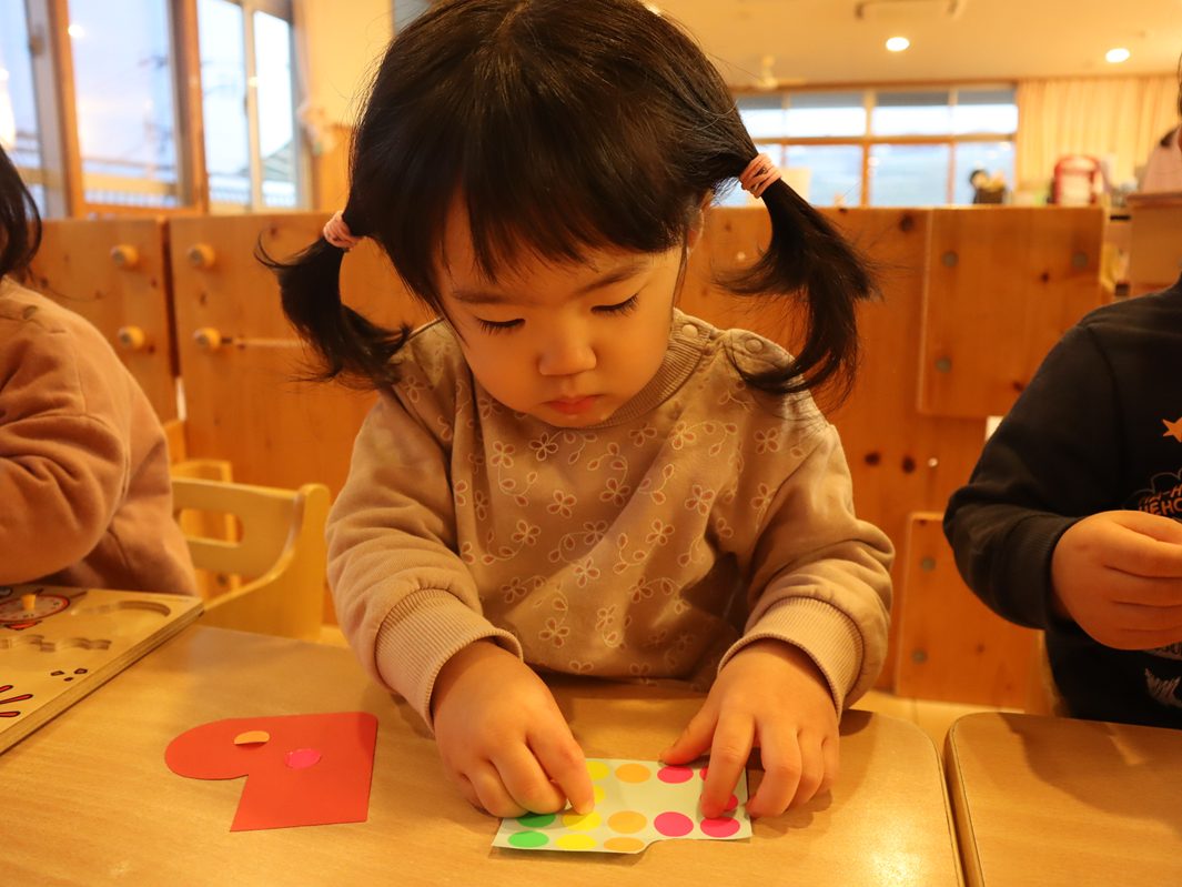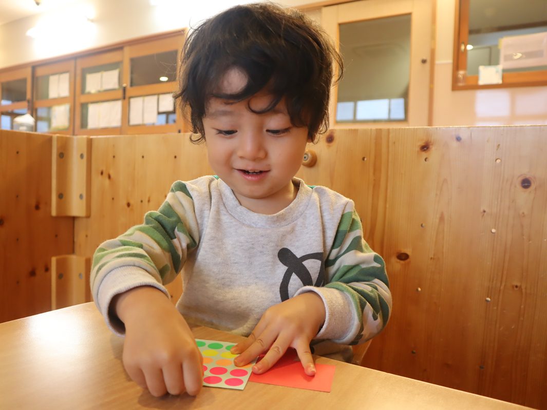 最近シール貼りに挑戦する子どもたち。 指先を使って台紙からシールを一生懸命剥がしていきます。 なかなか剥がせず、苦戦するこあら組さんでしたが、コツを掴みだんだんと上手く剥がせるようになってきました! 「ペタッ!」ととても嬉しそうに貼っていくこあらぐみさん。 「上手にできた~!」「見てみて!」と満足気に笑う姿が見られました。 今後も指先を使った活動を取り入れていきたいと思います。