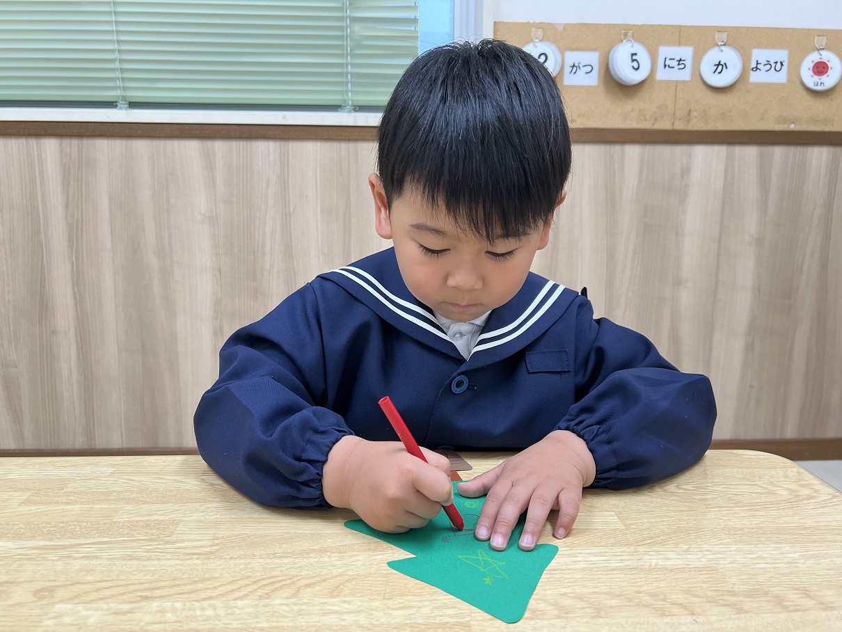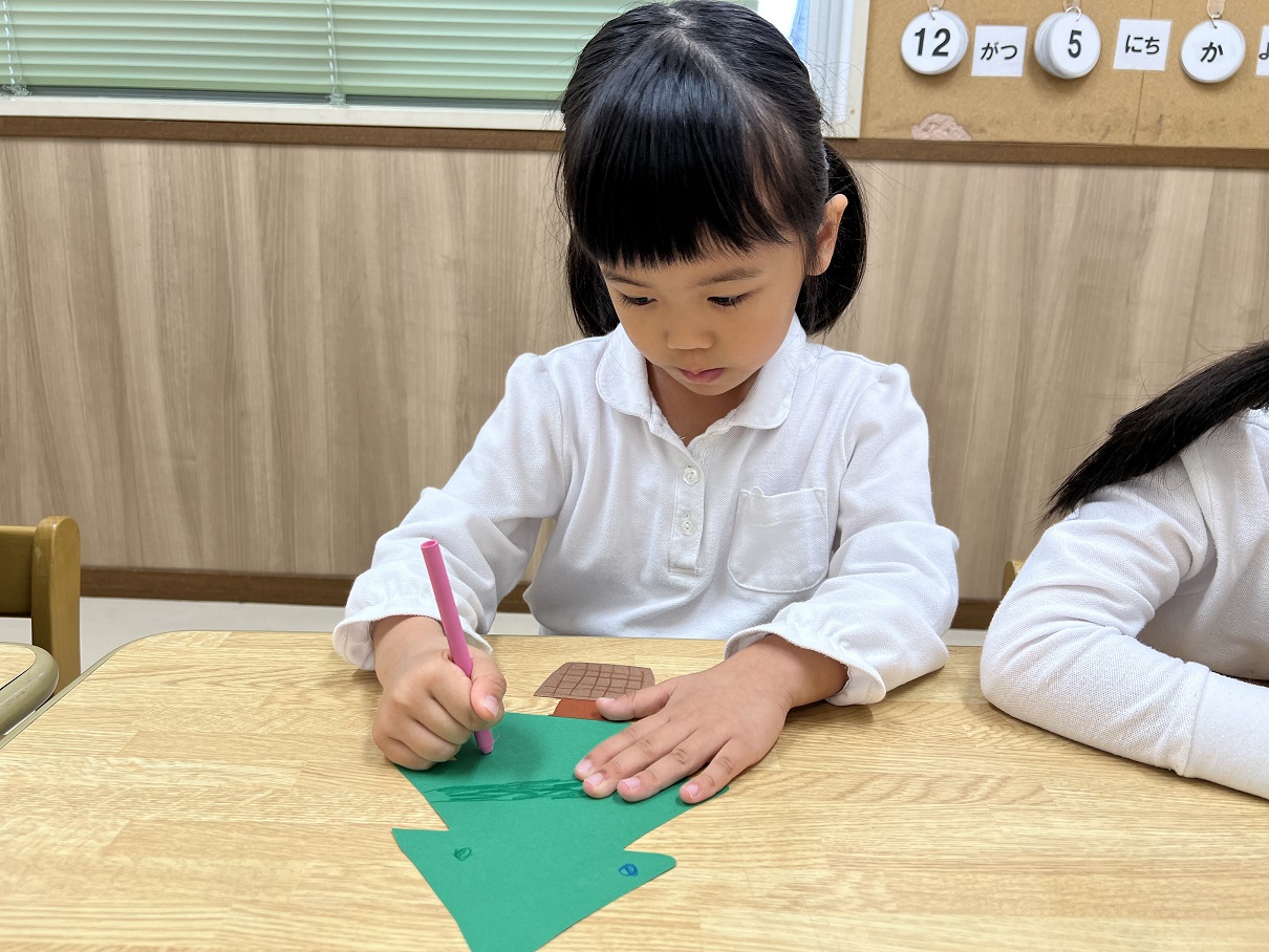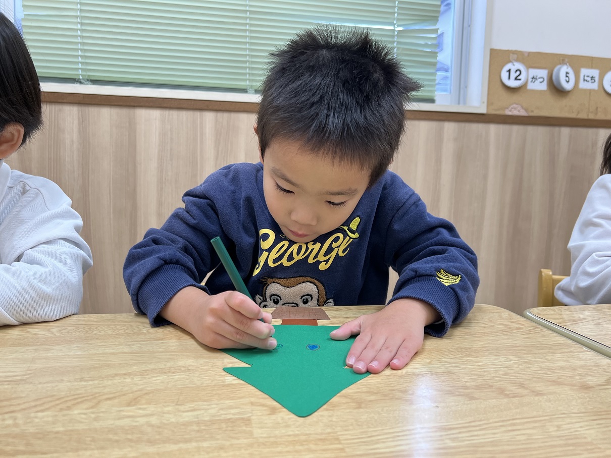 クリスマスにちなんで、クリスマスツリーの形をした画用紙に飾りを描いていきます。