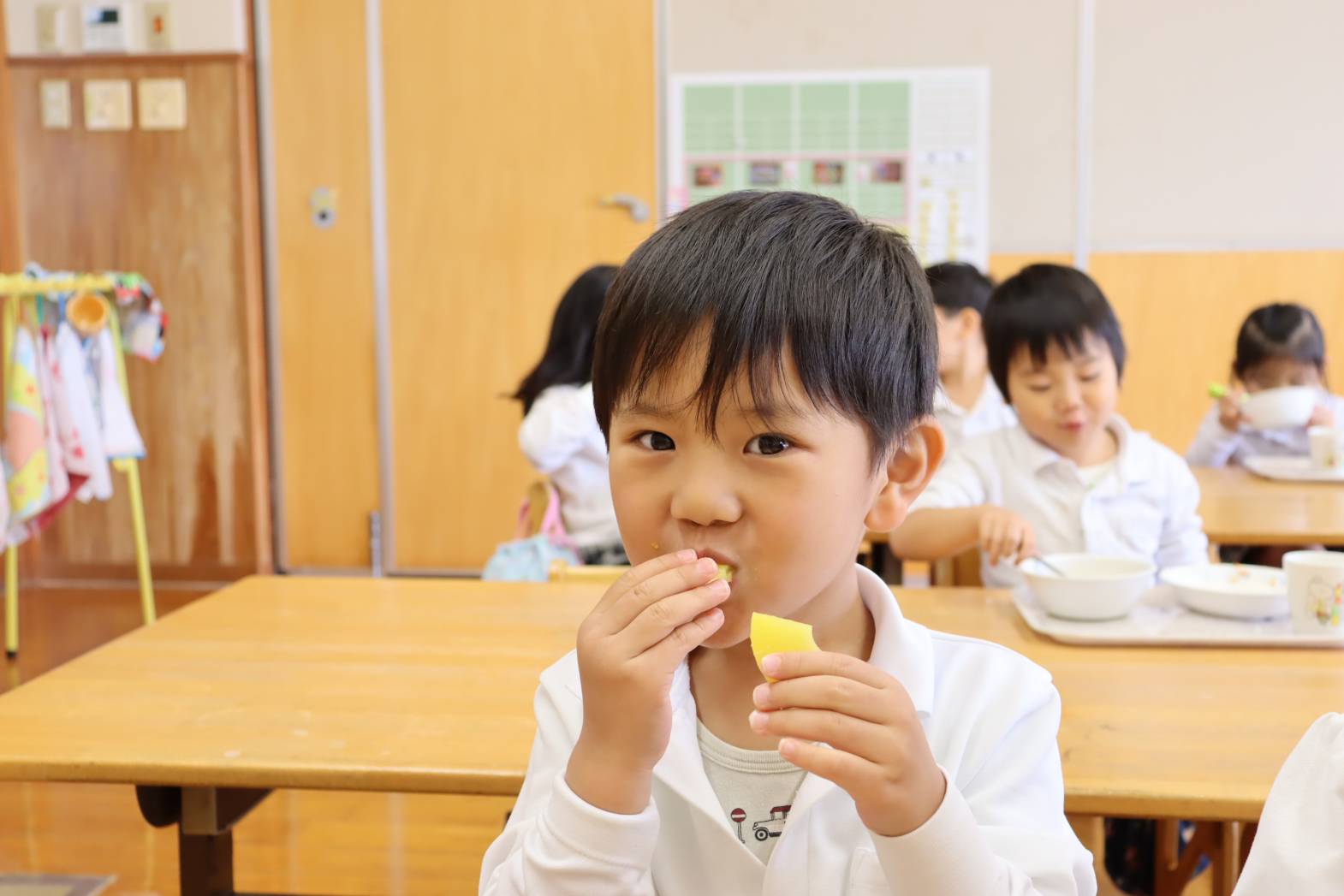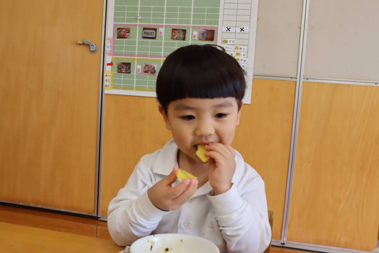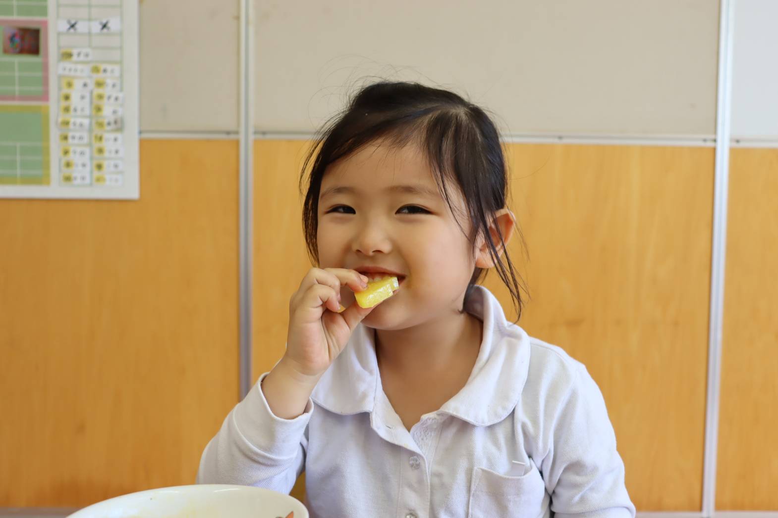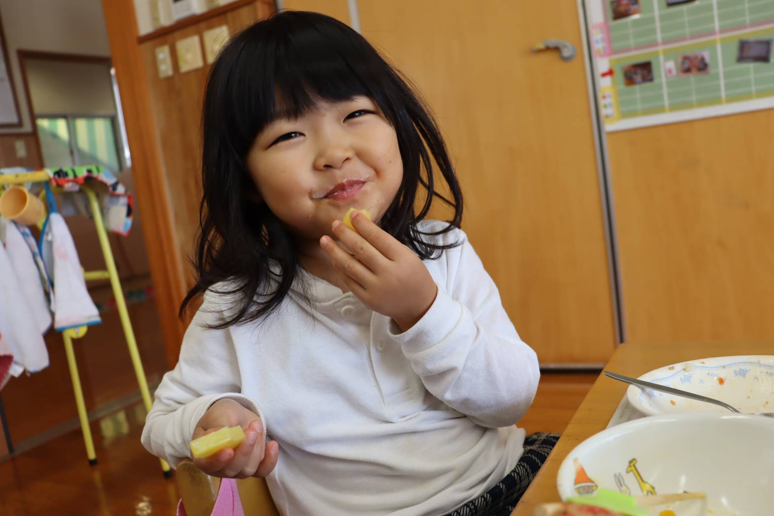 毎日の給食が楽しみな様子のりす組さん。 特に食後のデザートがあると、「やったー!」「早く食べたい!」 と、嬉しそうな表情を見せてくれます。 今日は、食後にパイナップルがでました。 「甘くて、美味しいね!」「今日は、パイナップル2枚だ!やった!」 と、気持ちが高まっていました。 あっという間に完食し、大満足な表情のりす組さんでした。