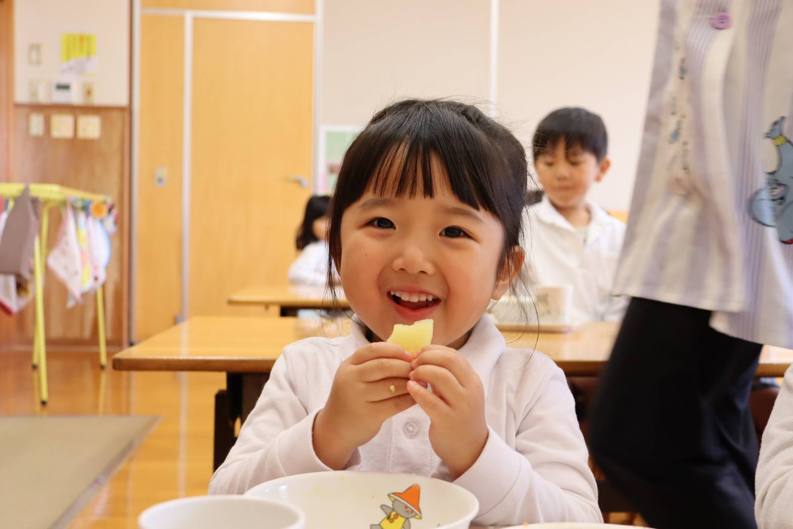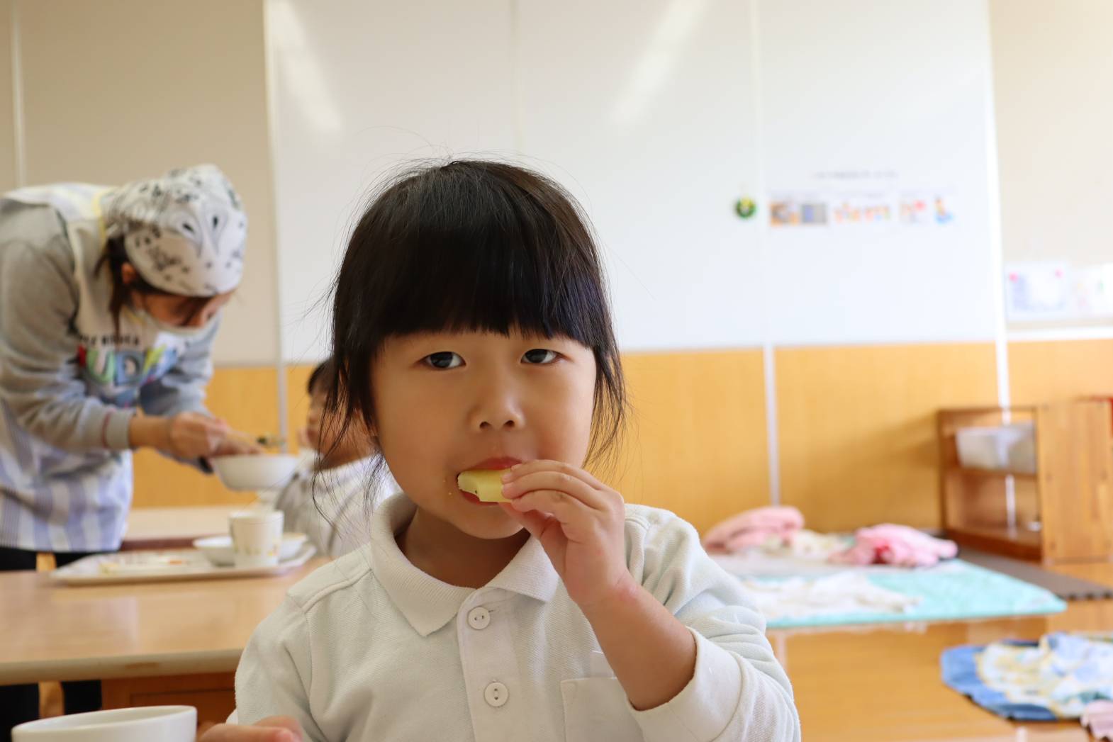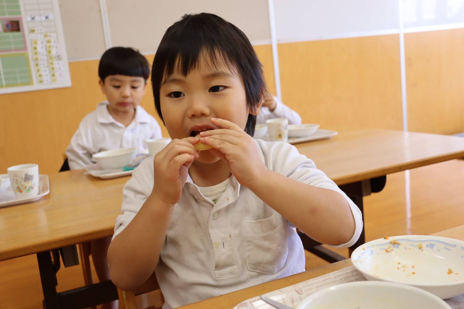 毎日の給食が楽しみな様子のりす組さん。 特に食後のデザートがあると、「やったー!」「早く食べたい!」 と、嬉しそうな表情を見せてくれます。 今日は、食後にパイナップルがでました。 「甘くて、美味しいね!」「今日は、パイナップル2枚だ!やった!」 と、気持ちが高まっていました。 あっという間に完食し、大満足な表情のりす組さんでした。