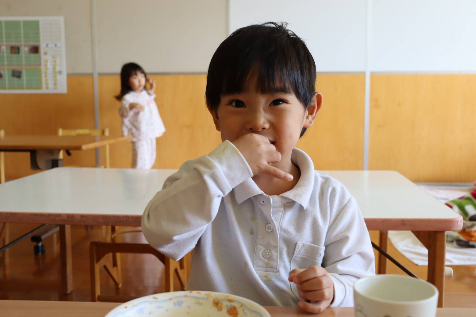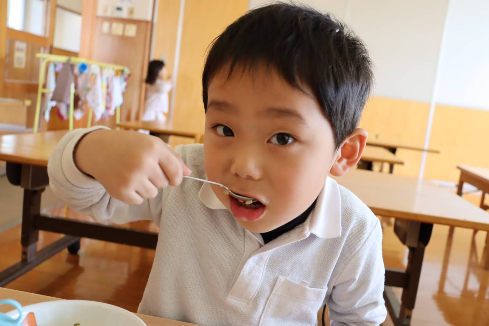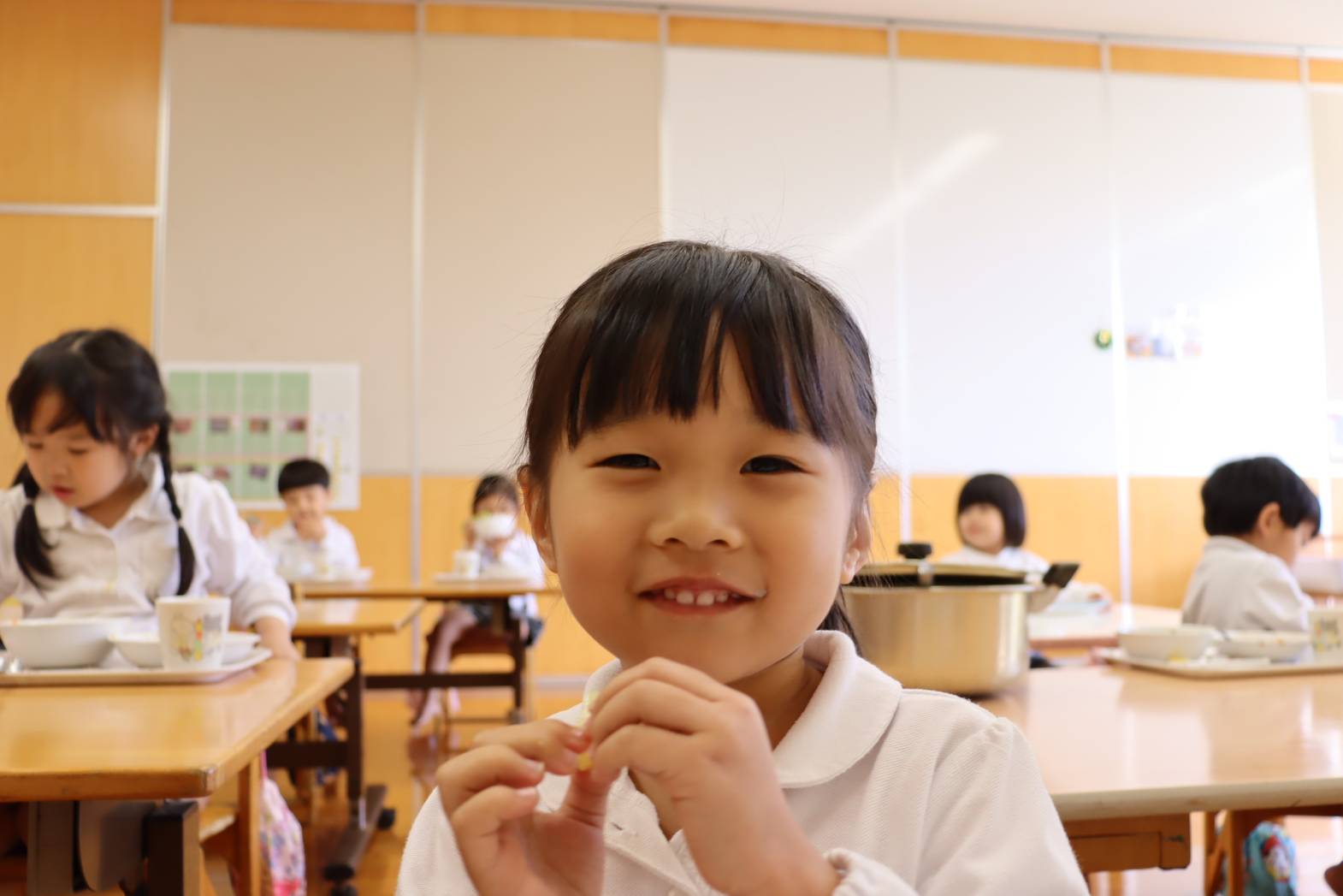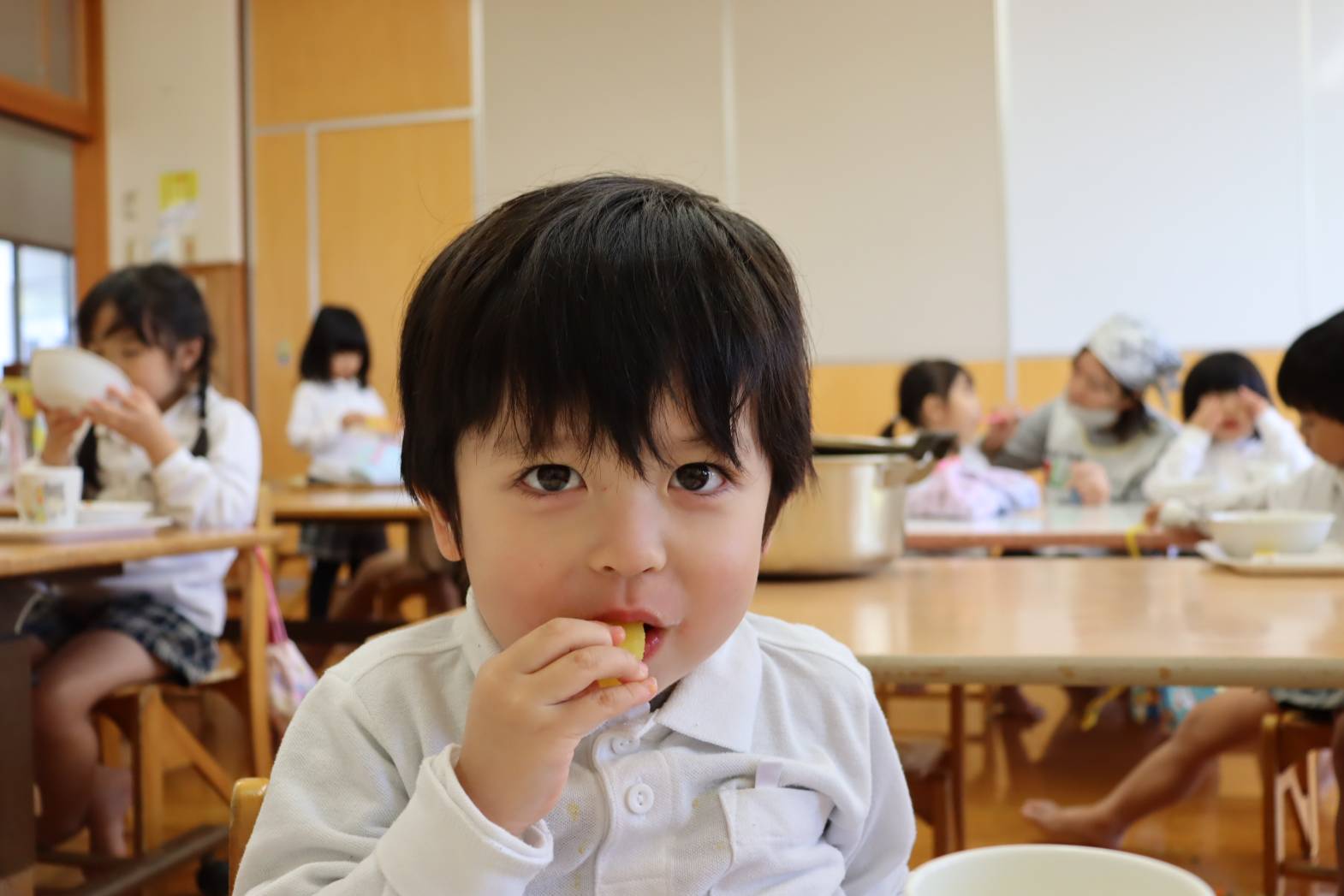 毎日の給食が楽しみな様子のりす組さん。 特に食後のデザートがあると、「やったー!」「早く食べたい!」 と、嬉しそうな表情を見せてくれます。 今日は、食後にパイナップルがでました。 「甘くて、美味しいね!」「今日は、パイナップル2枚だ!やった!」 と、気持ちが高まっていました。 あっという間に完食し、大満足な表情のりす組さんでした。