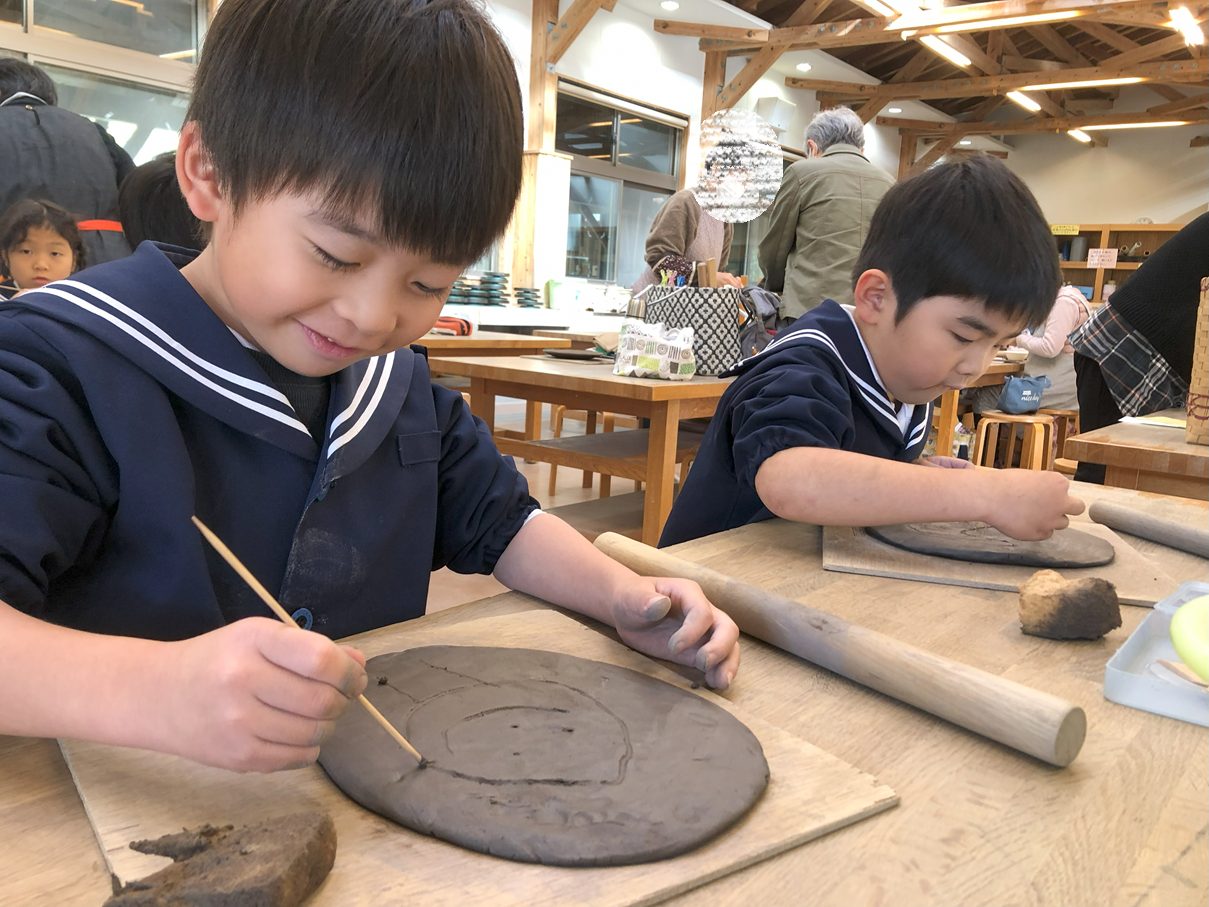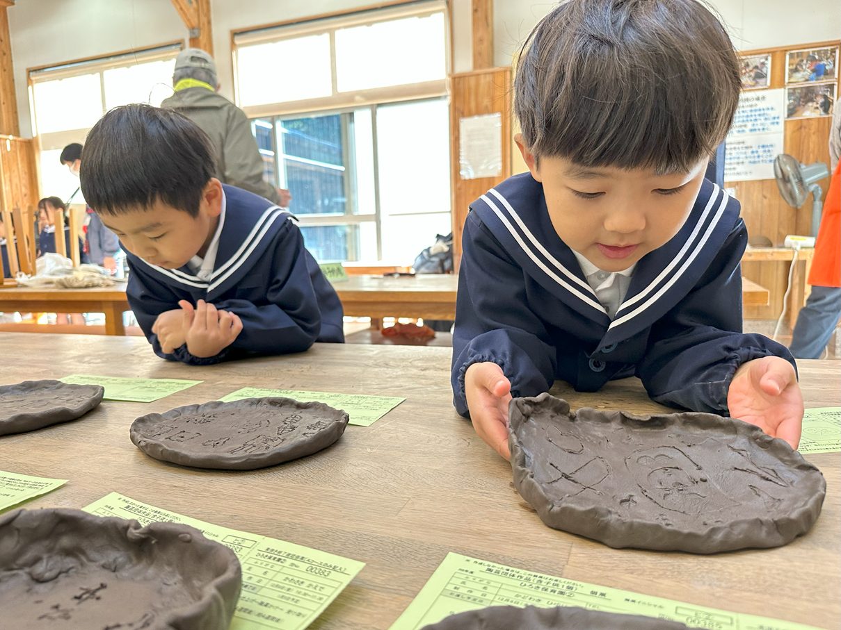 「やった出来上がったぞ!」と完成した皿を見て満足げな子どもたち。