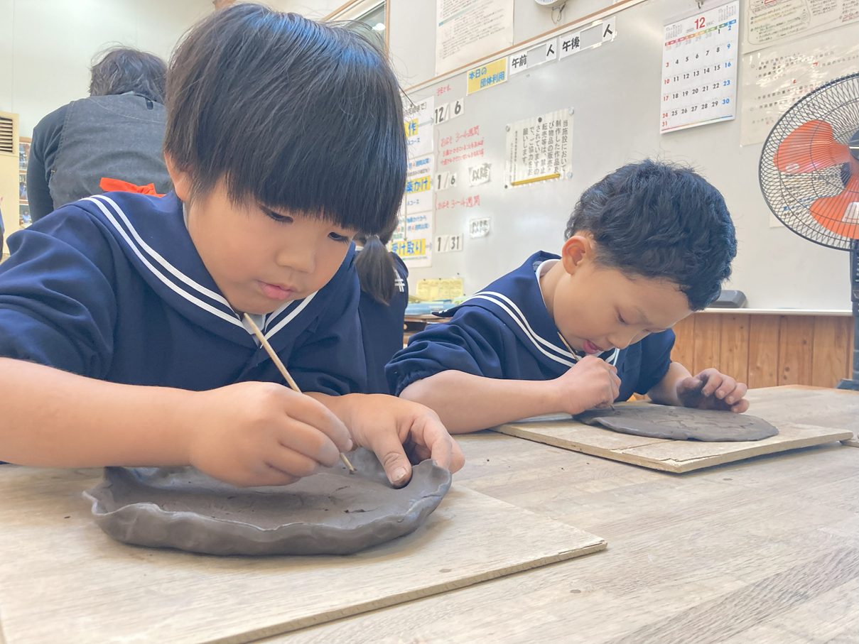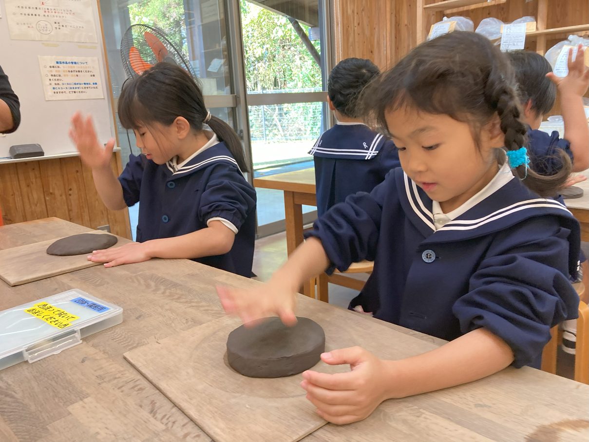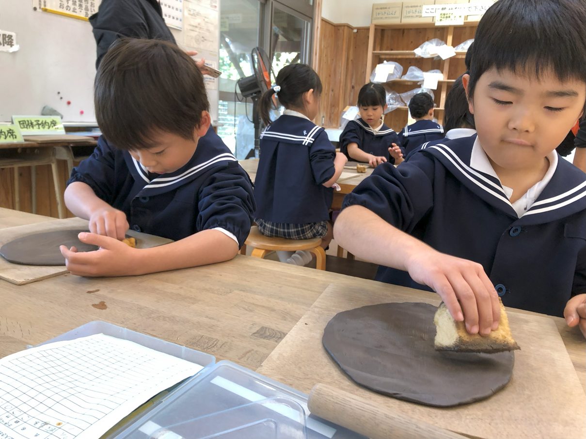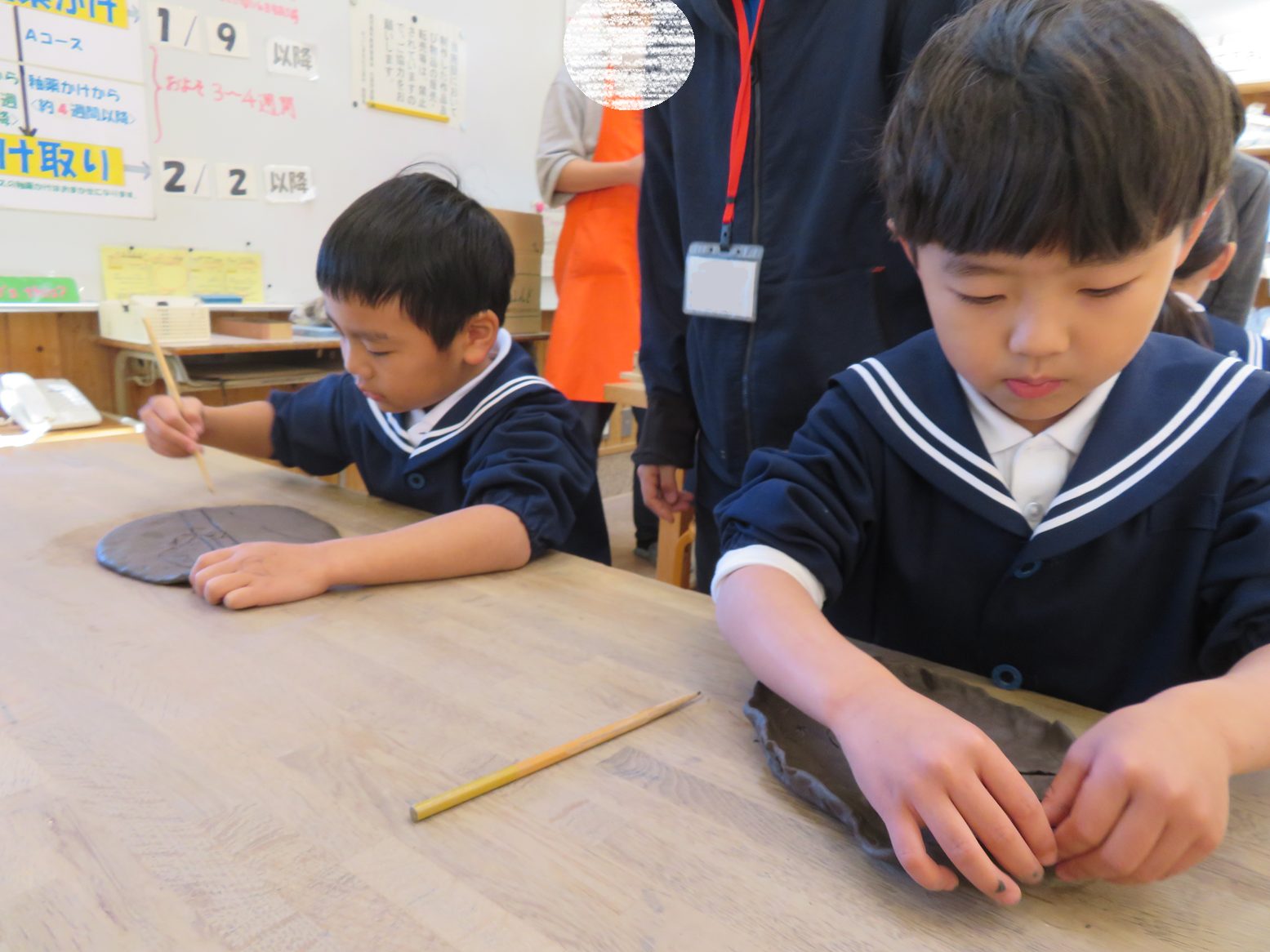 「みんなが作った皿はこれから乾燥させた後、窯に入れて焼き上げるからね!」と、教えてもらうと「え!窯で焼くの。」「いつ出来上がるかな?出来上がるの楽しみ!」と自分たちで作った皿の焼きあがる日が待ち遠しくて仕方ないきりん組さんでした。