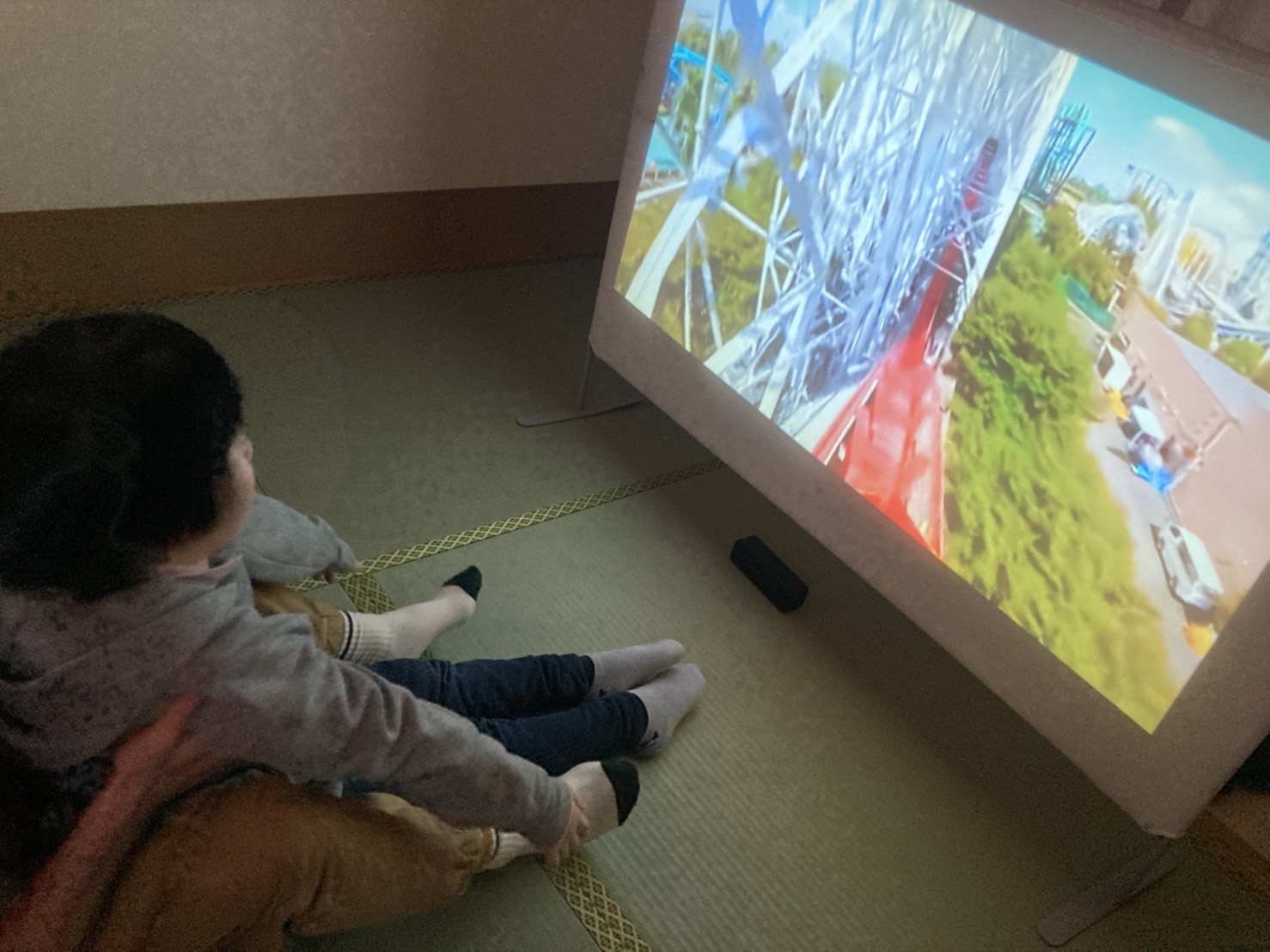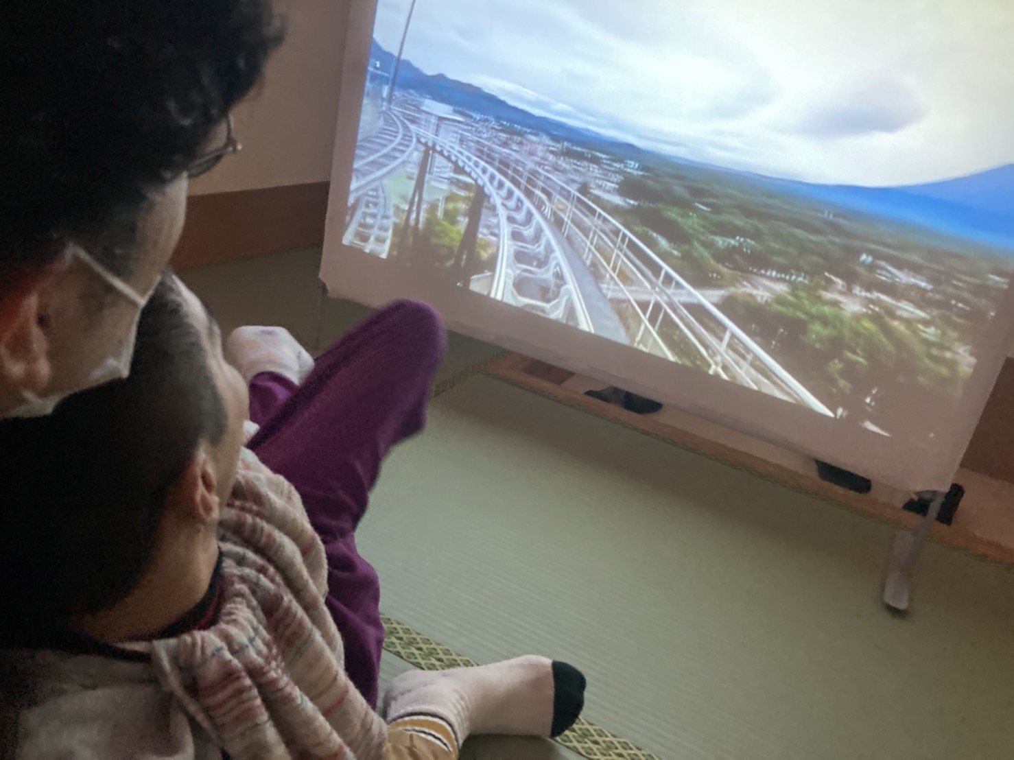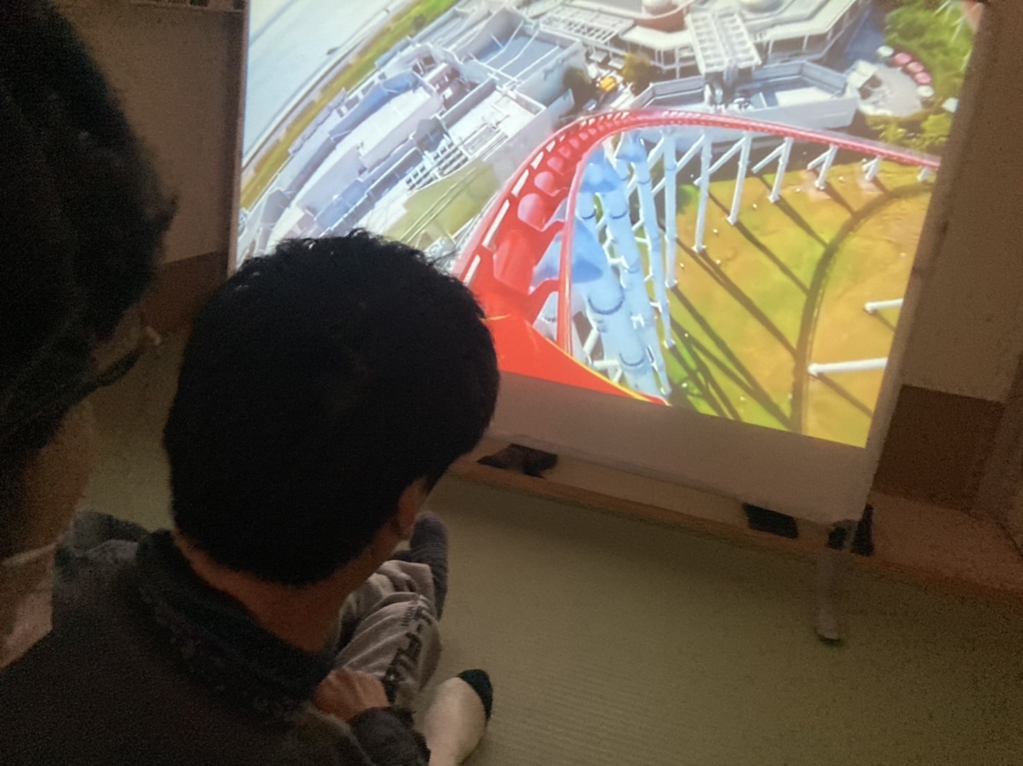 今回は、プロジェクターを使用して、ジェットコースター体験をしました。 職員と一緒に座り… ジェットコースターの映像に合わせてユラユラ! 皆さん楽しかったようで、「わー!」「キャー!」と大はしゃぎでした(^^)/ 次回はまた違ったものを楽しめたらいいなと思っています★